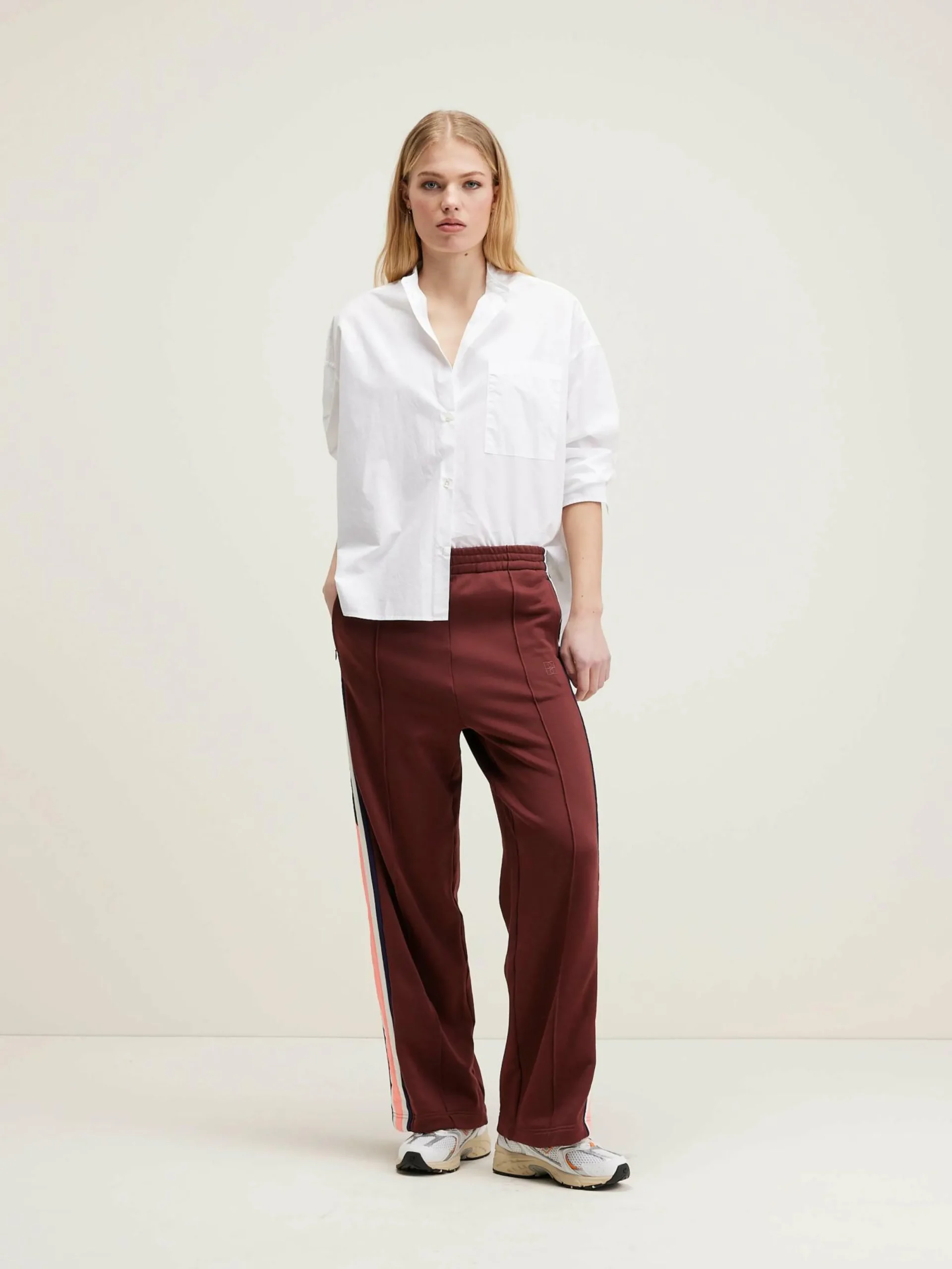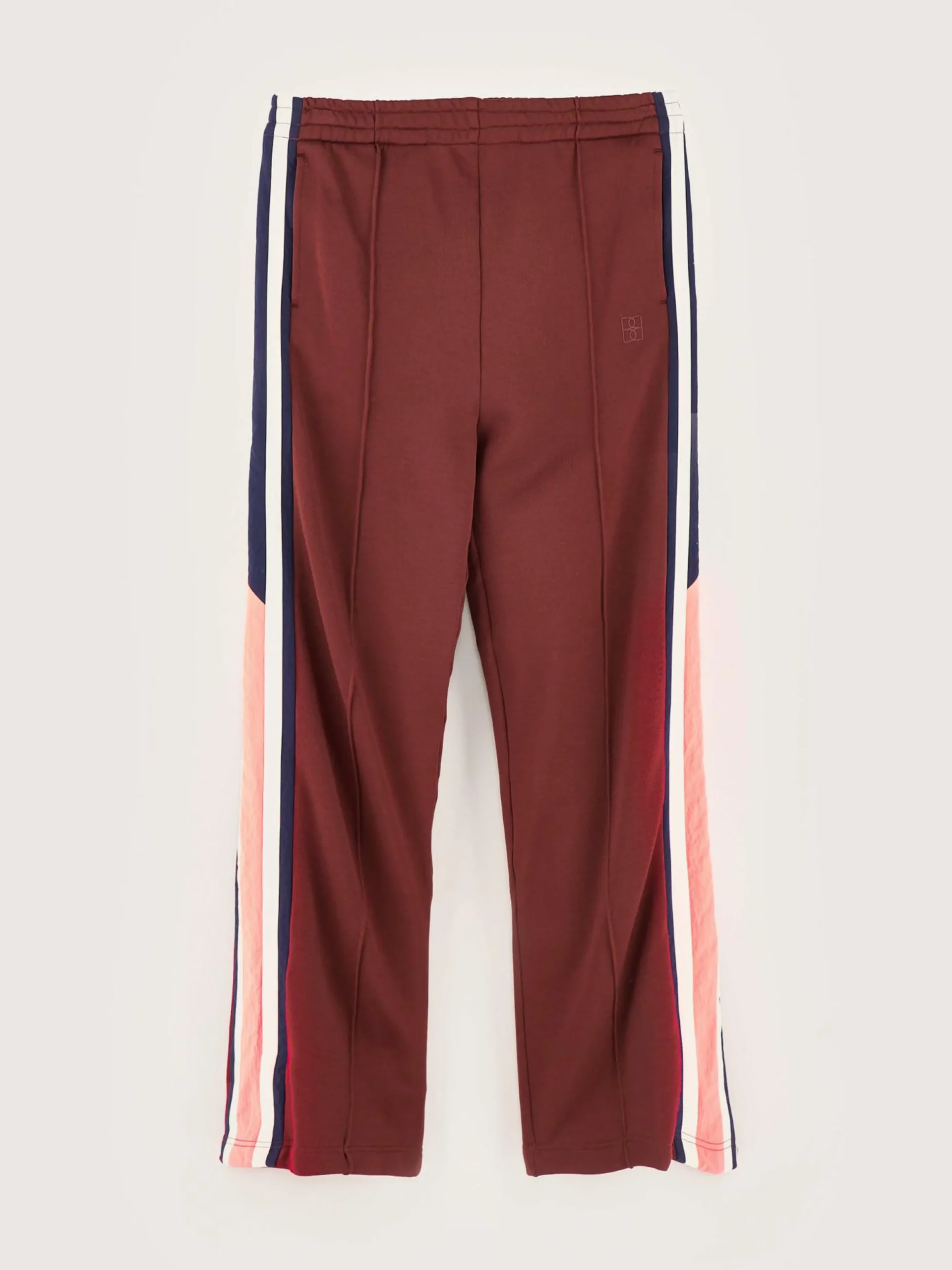 Jogging taille haute bordeaux avec bandes latérales contrastées.