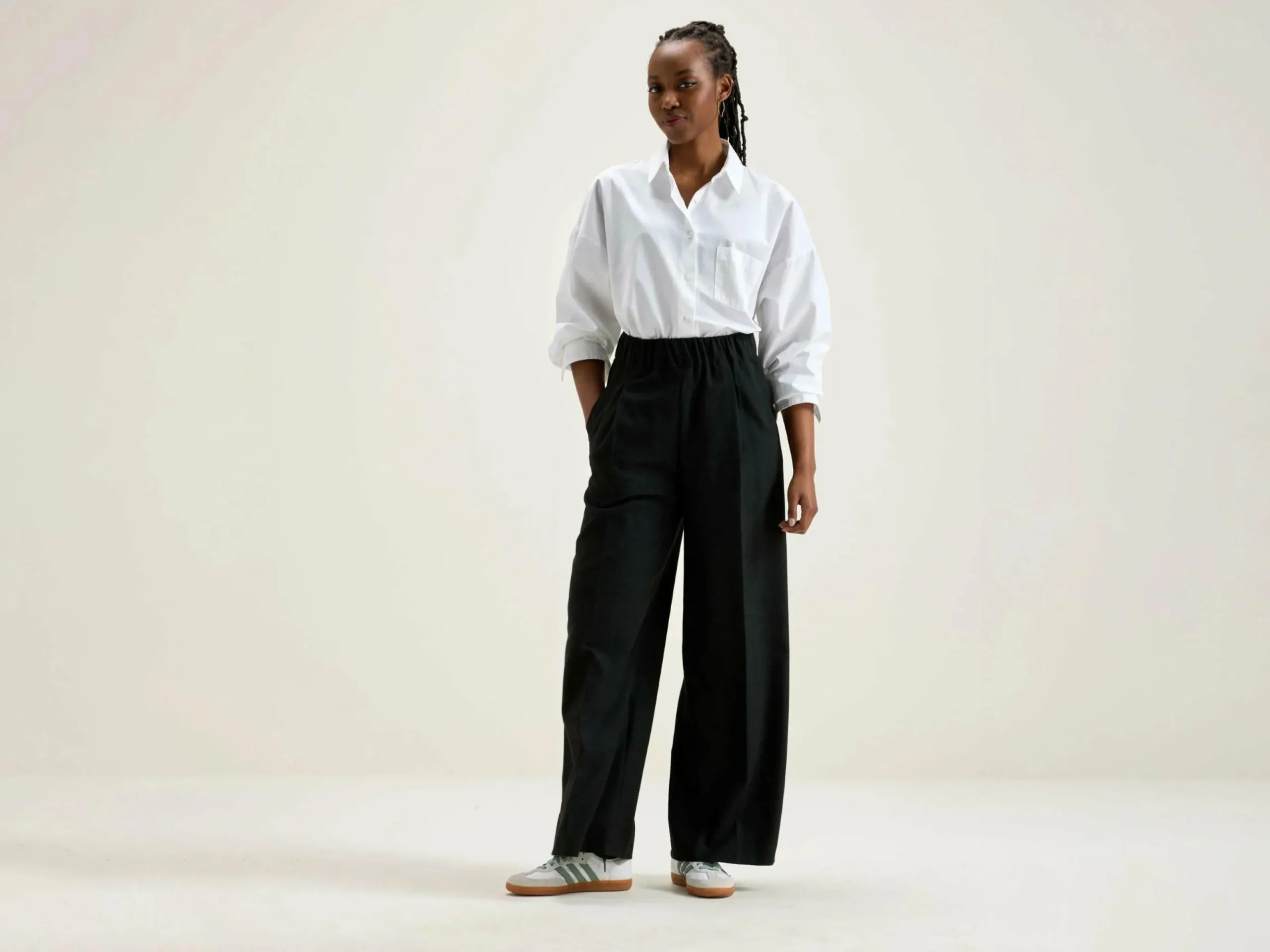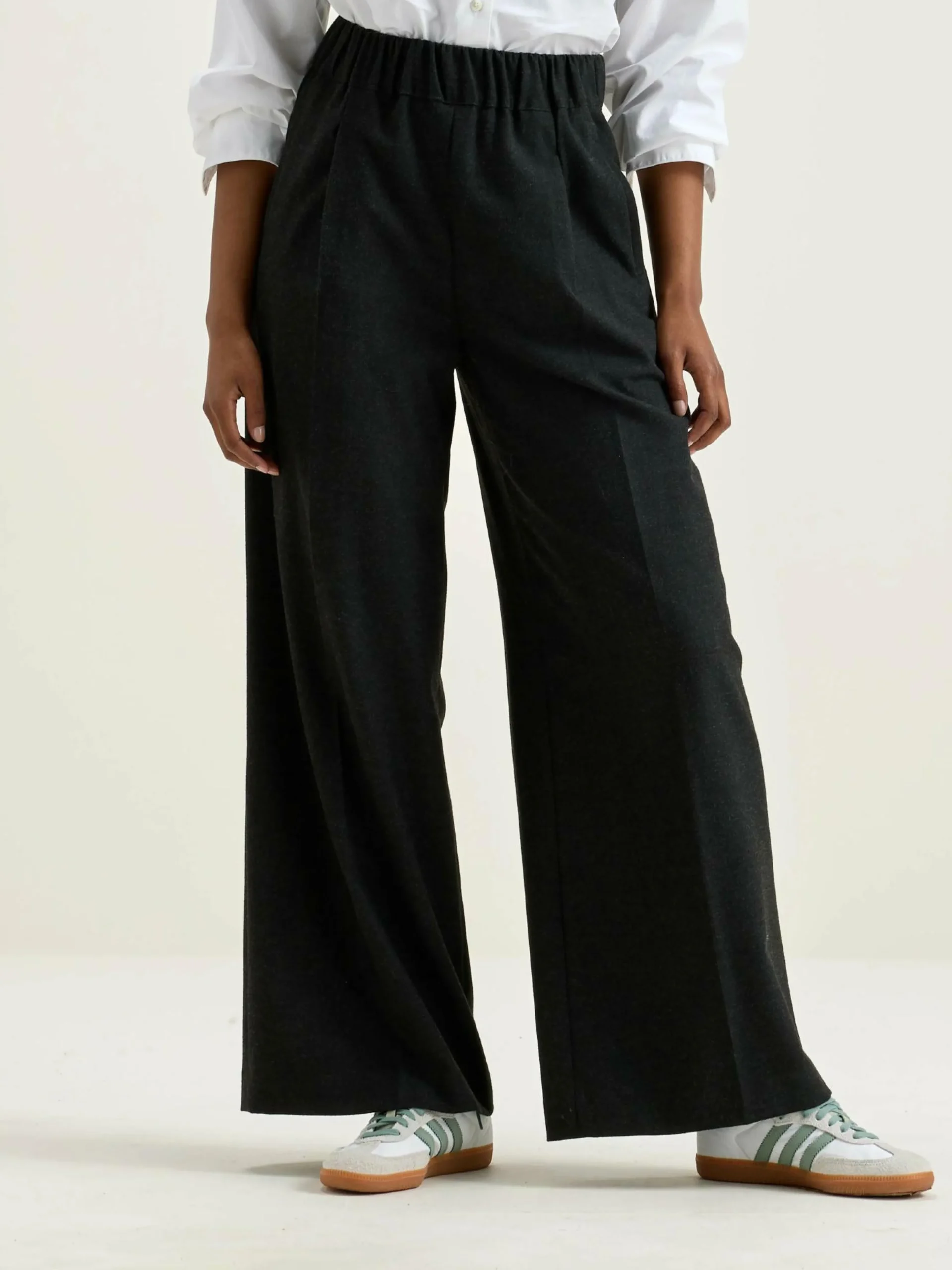 Pantalon à jambes larges, taille élastique et poches passepoilées, couleur gris anthracite.