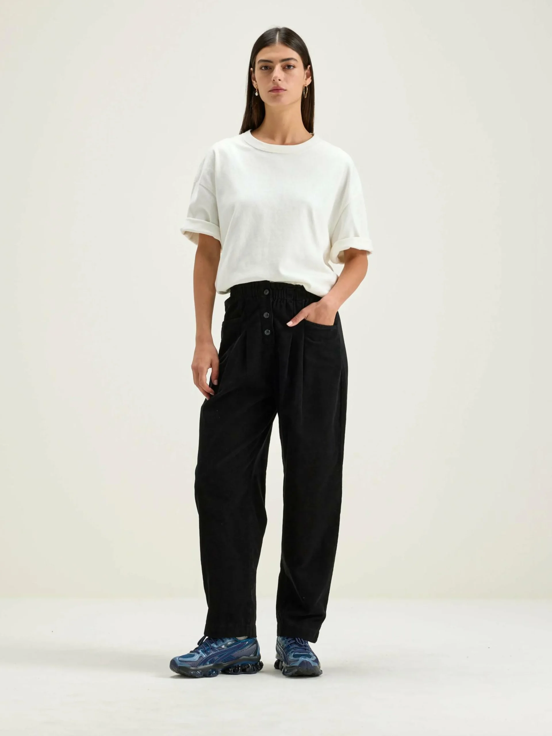 Pantalon taille haute et élastiquée et jambes fuselées décontractées en toile de lin et coton noire.