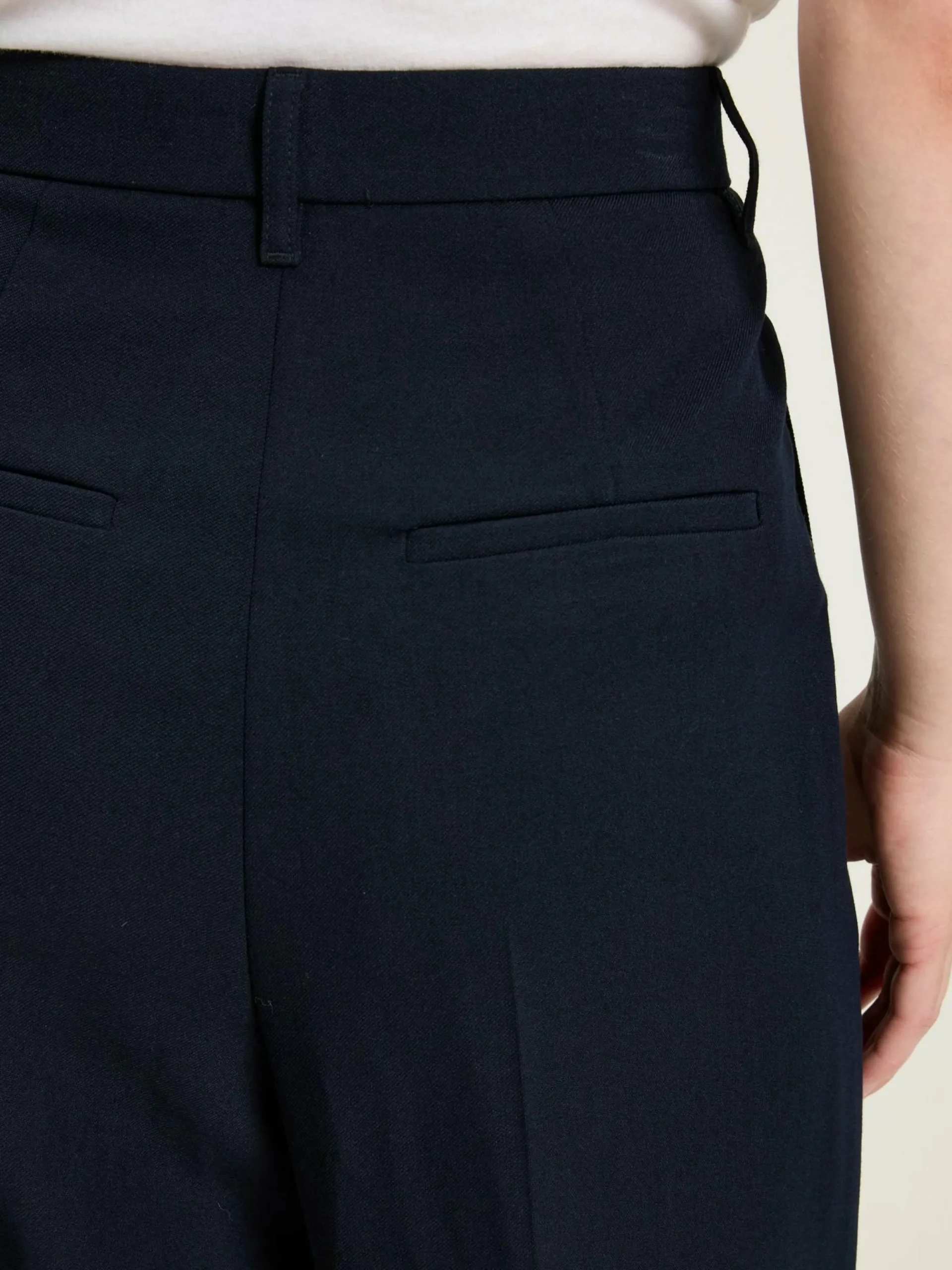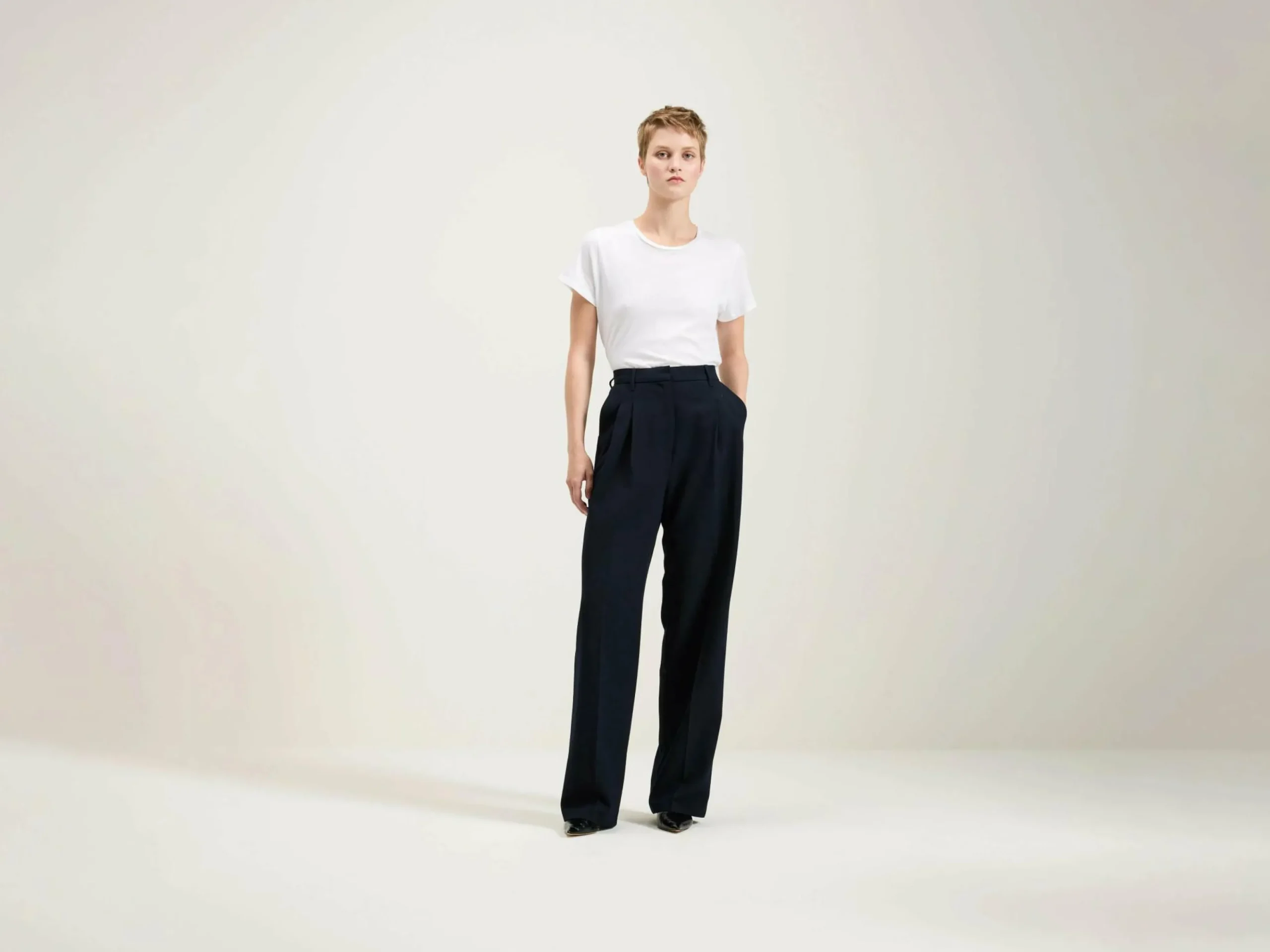 Pantalon bleu marine taille haute de style tailleur, avec plis à l’avant et jambes larges.