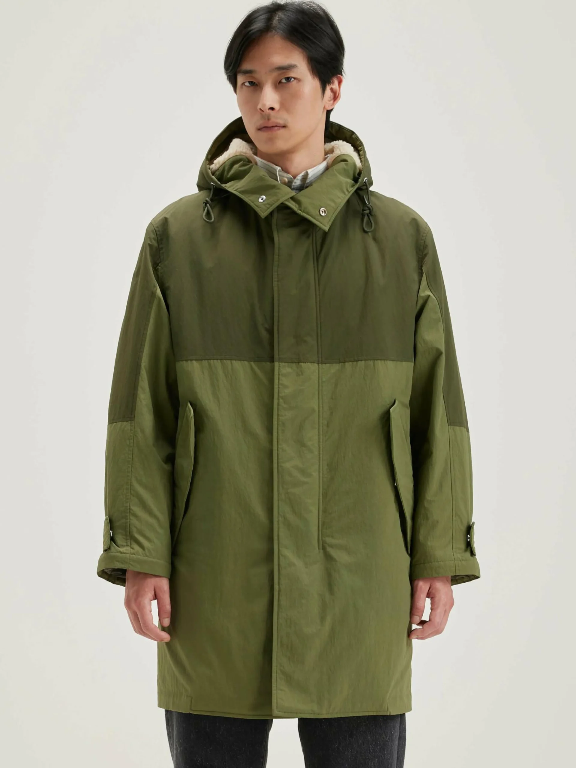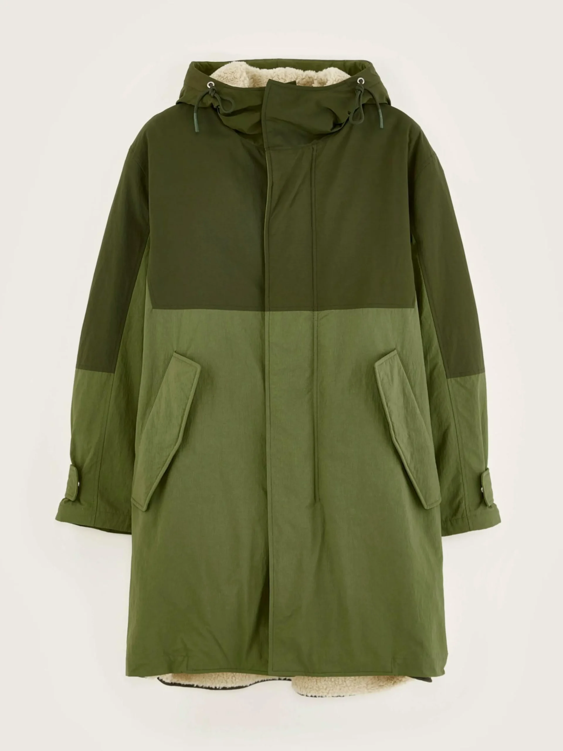 Parka à capuche, coupe classique en toile bicolore dans des tons verts et doublée de teddy écru.