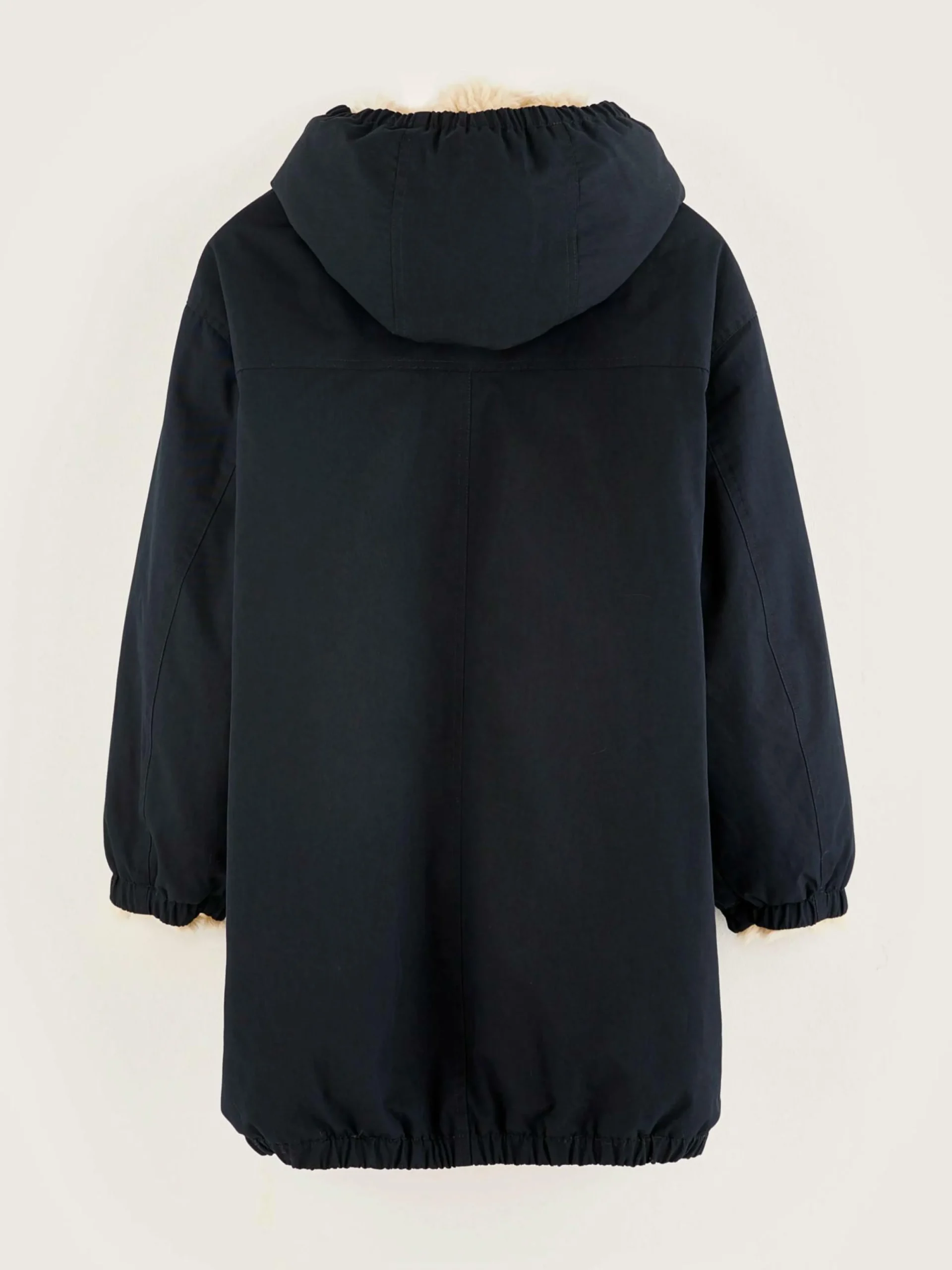 Parka à capuche oversize en bleu marine avec doublure en fausse fourrure.