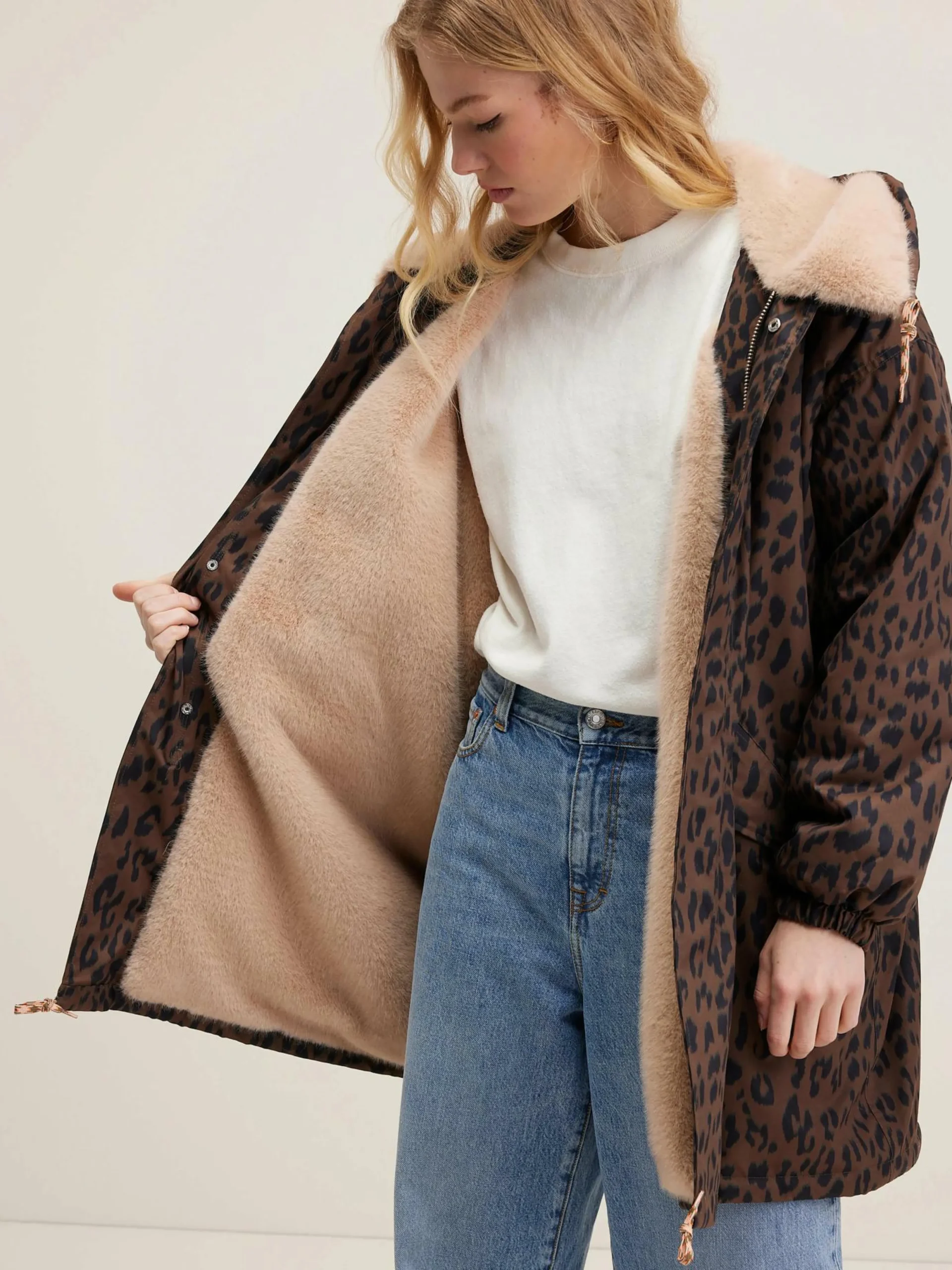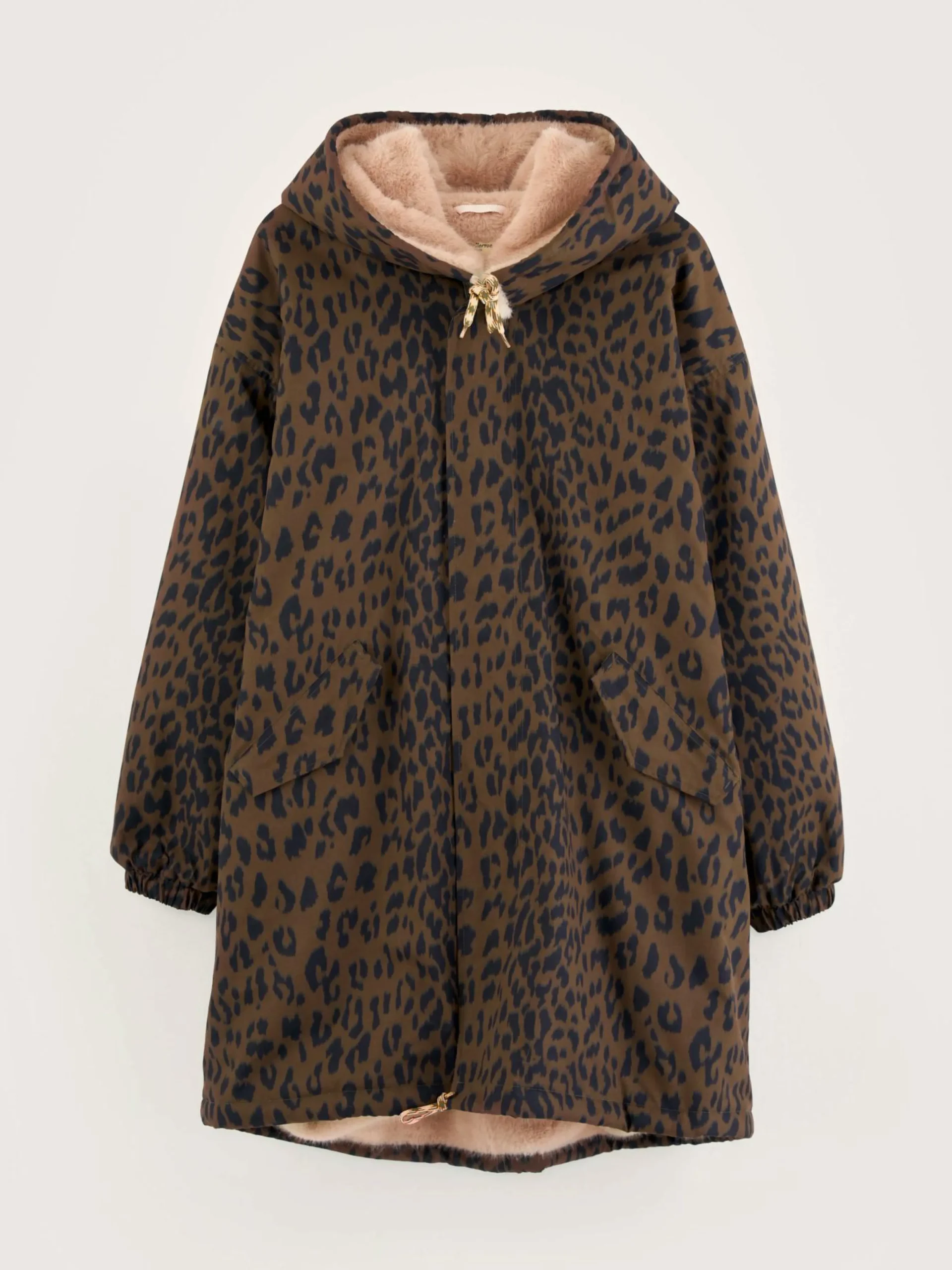 Parka oversize en toile imprimée léopard doublée de fausse fourrure.