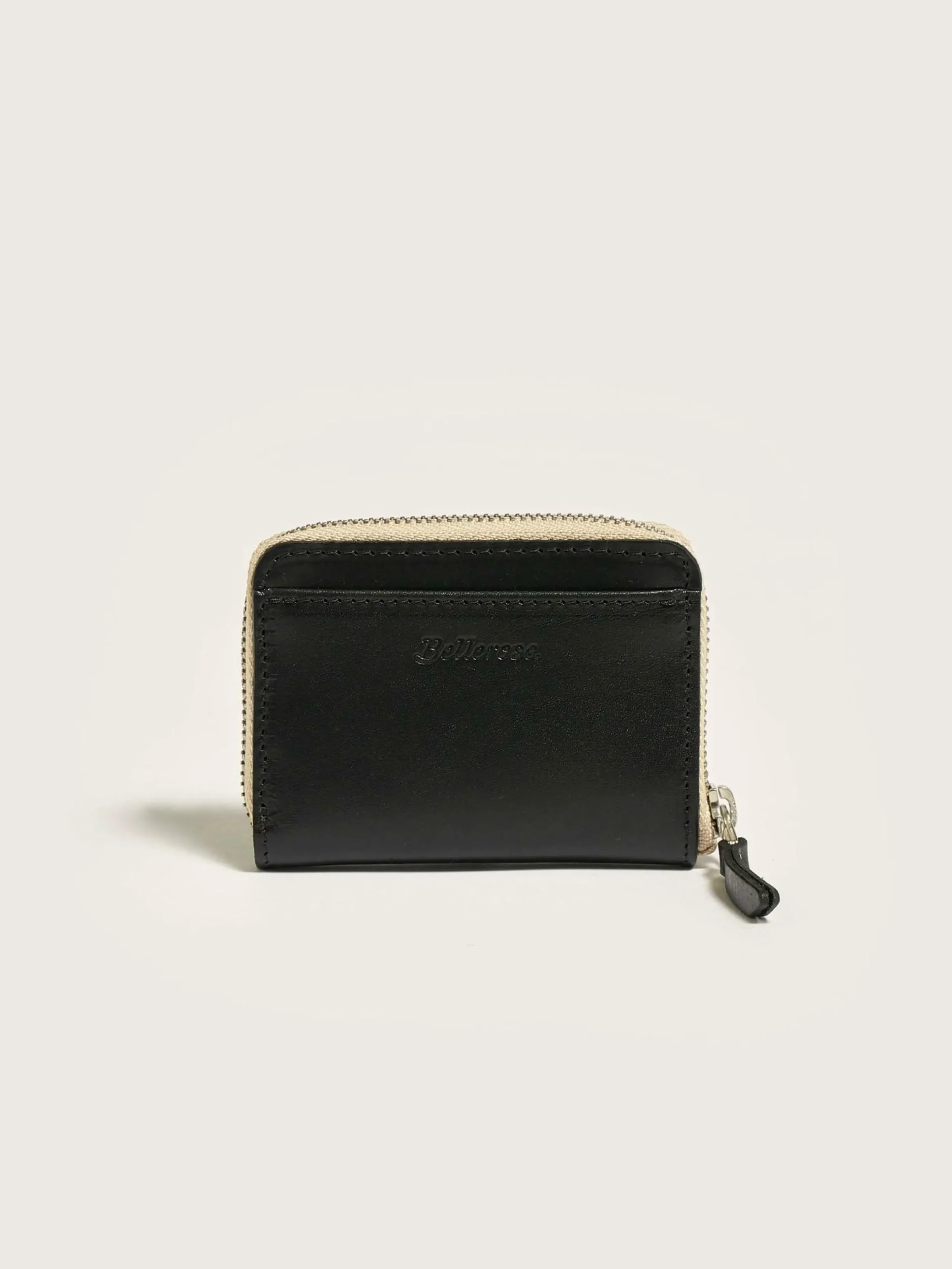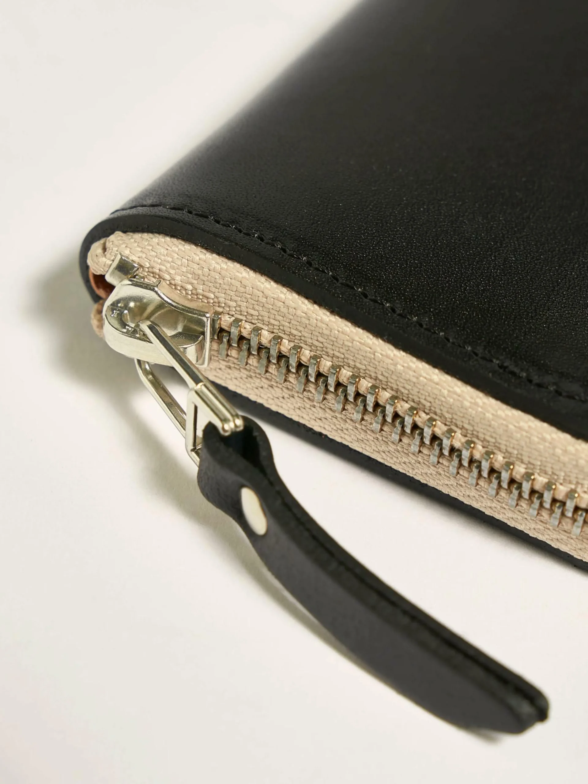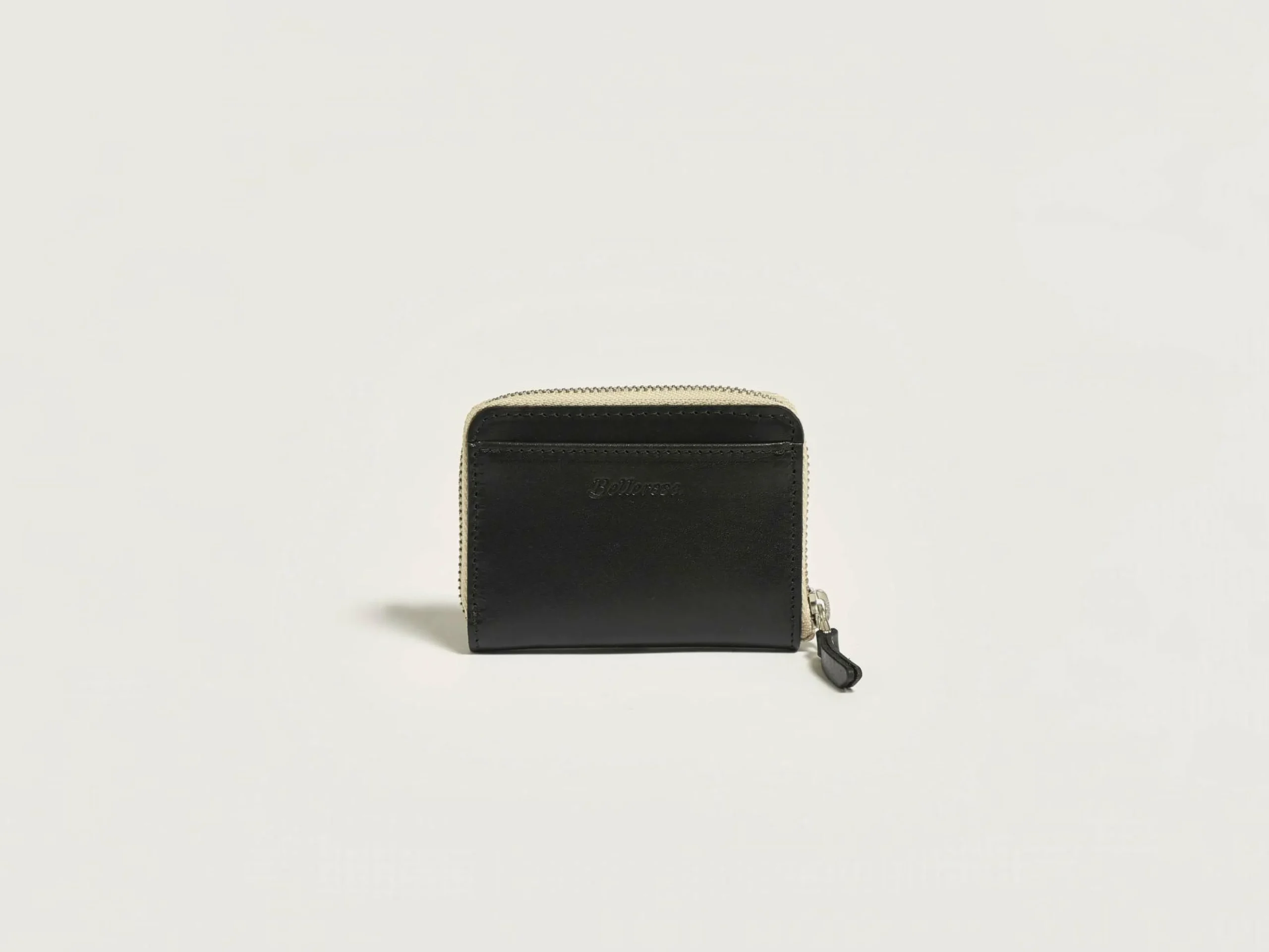 Portefeuille rectangulaire zippé en cuir lisse noir avec plusieurs fentes pour cartes.