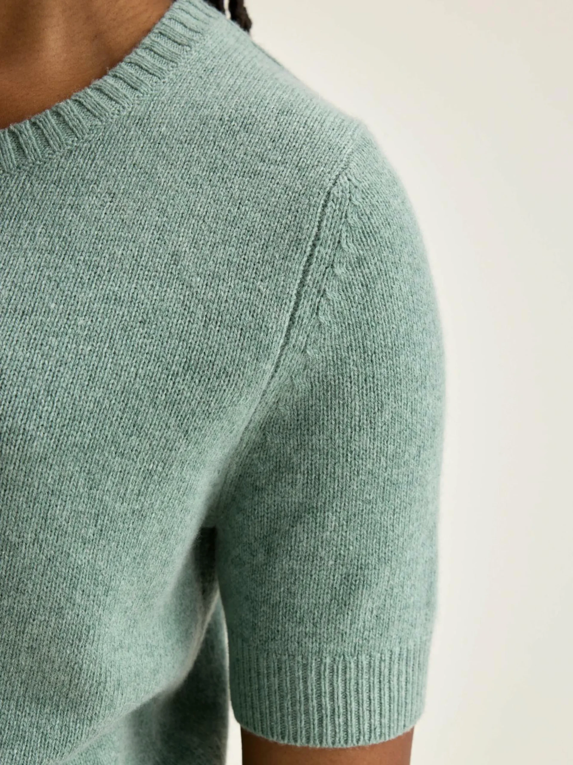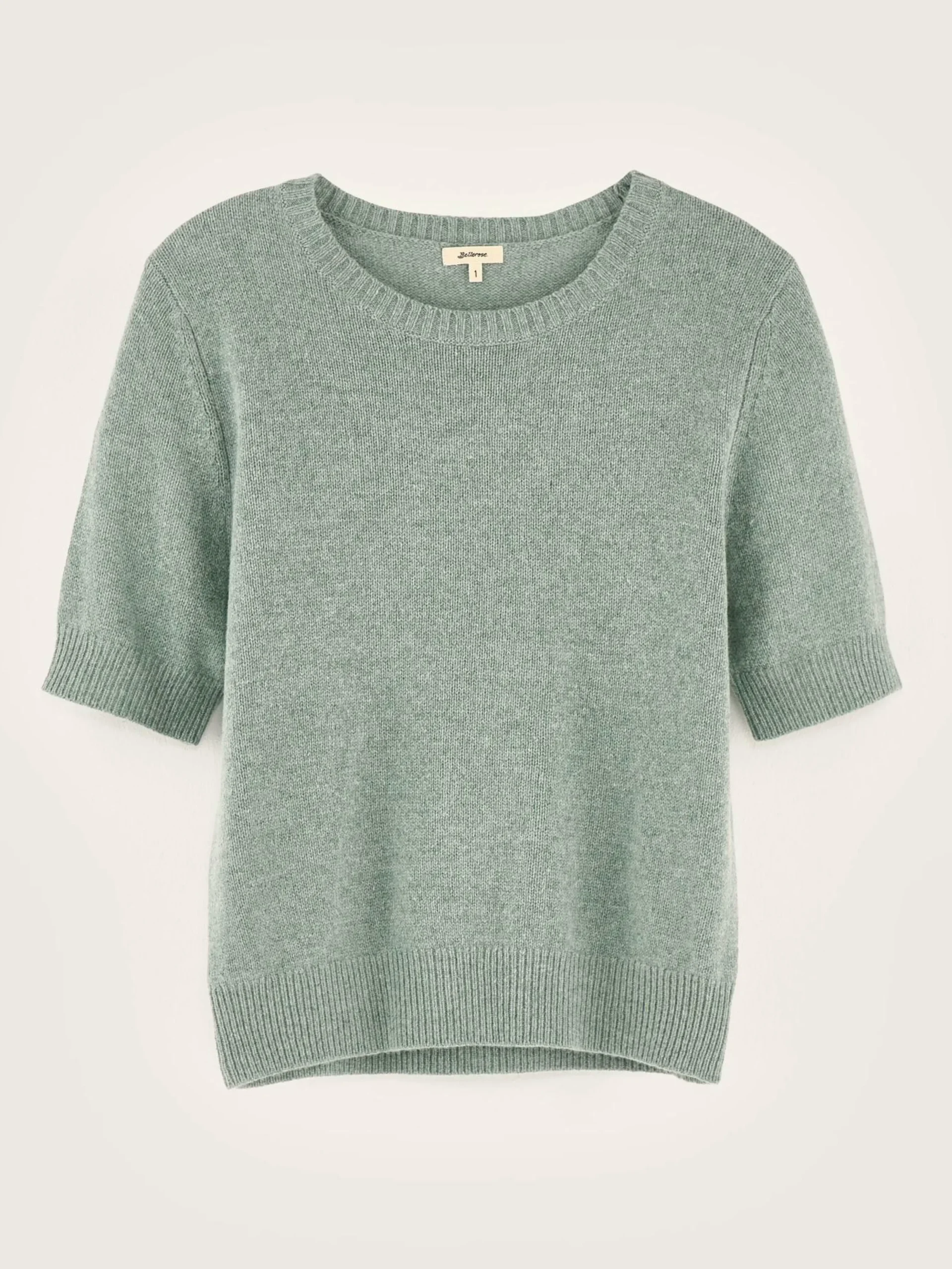Pull bleu-gris forme ajustée, col rond et manches courtes.