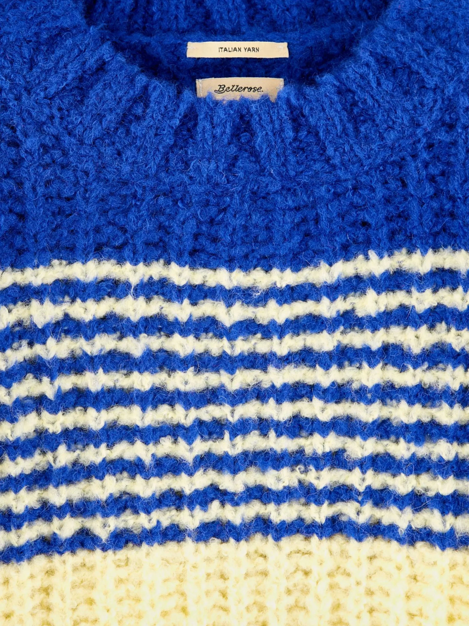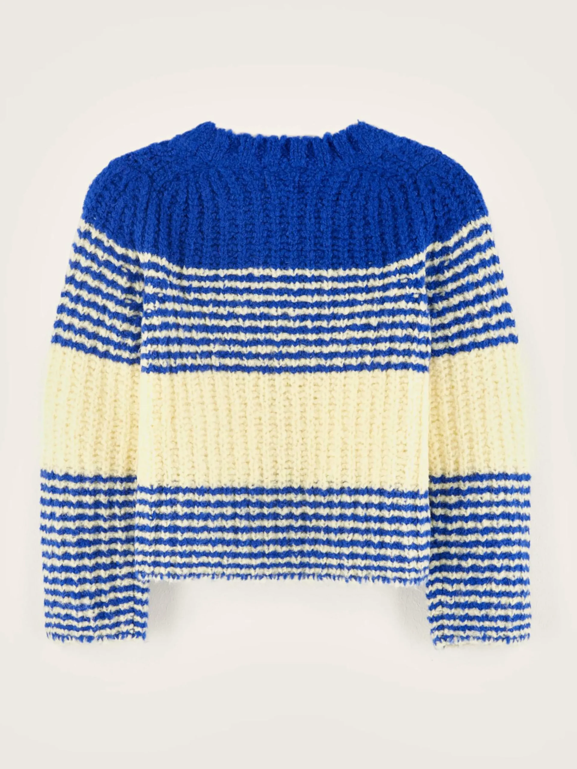 Pull rayé bleu à coupe ample tricoté en côtes perlées.