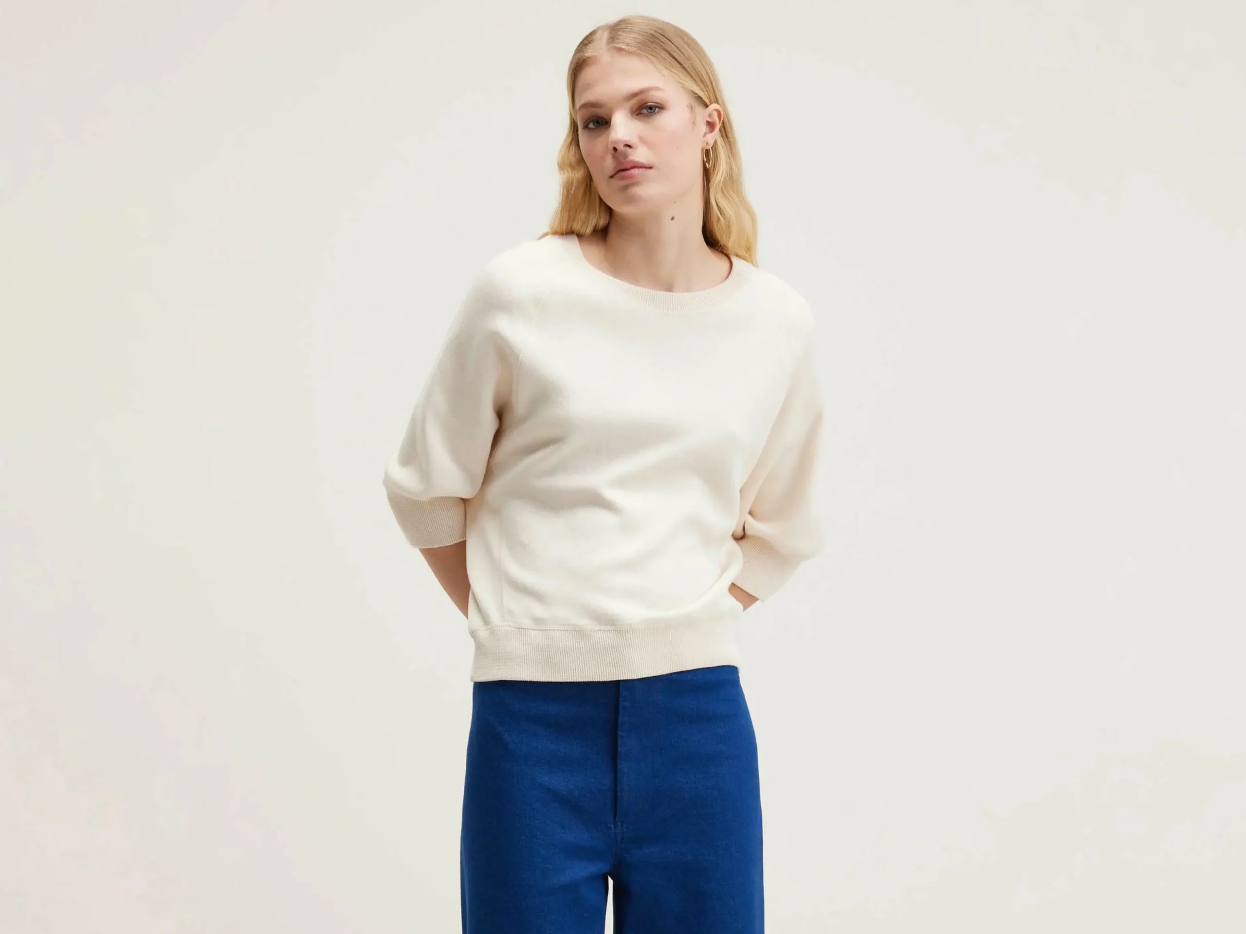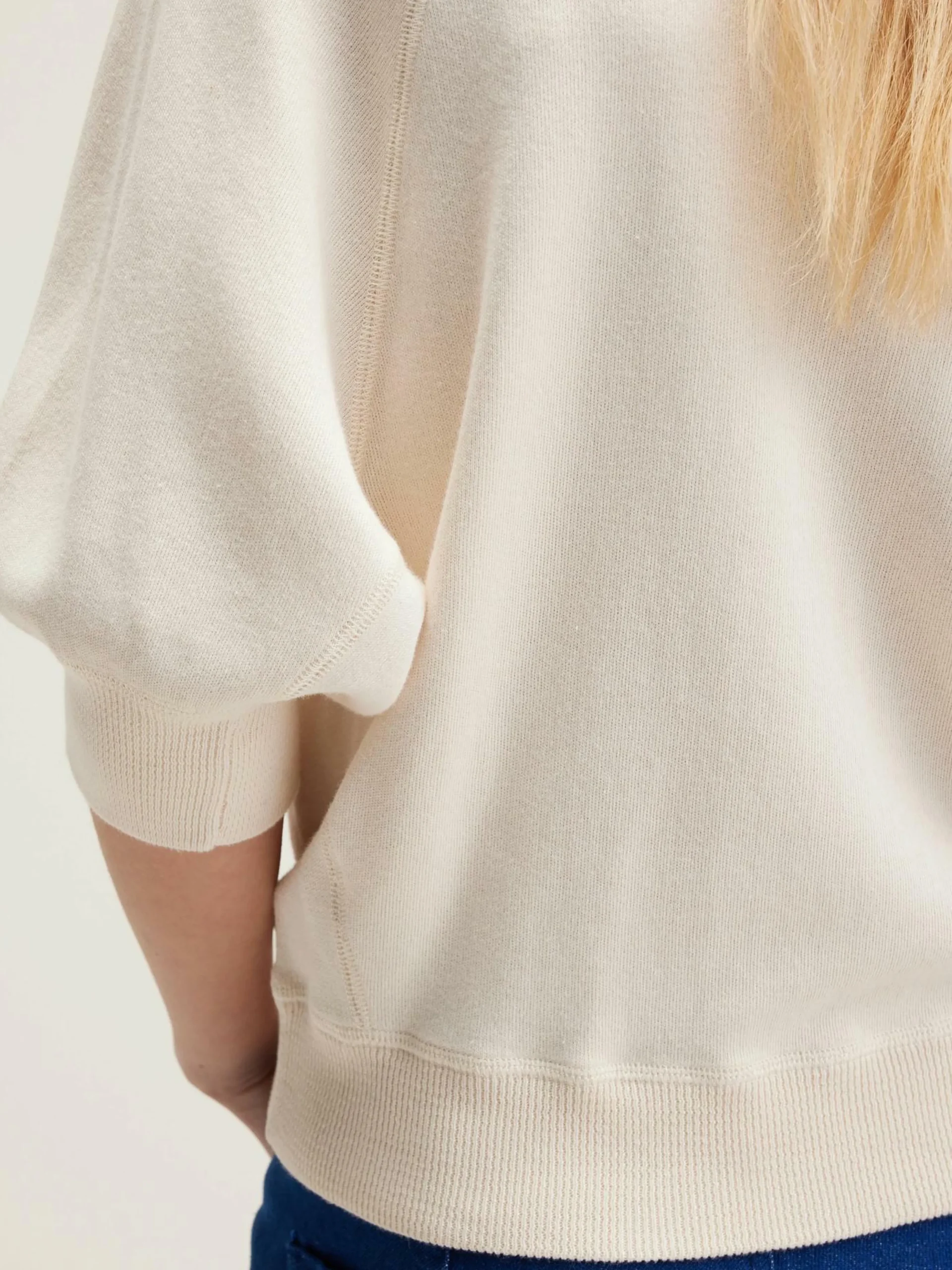 Pull col rond oversize avec manches 3/4 et bords côtelés en coton écru.