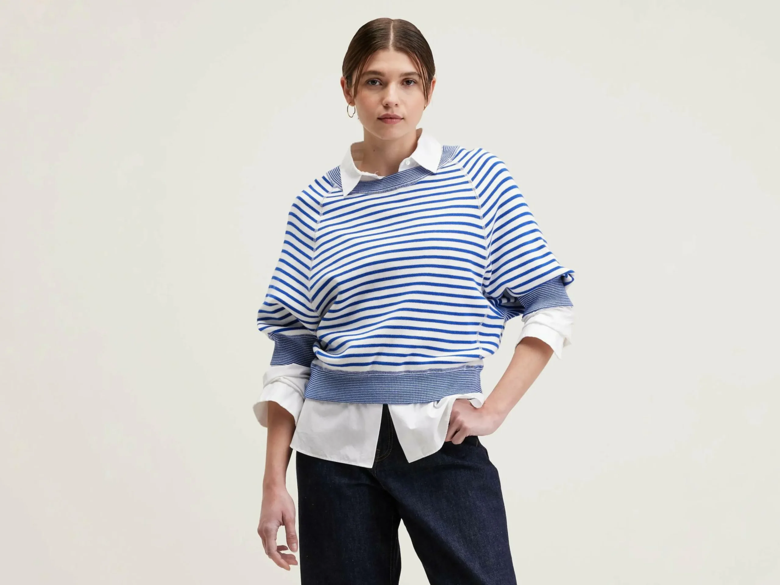 Pull col rond oversize avec manches 3/4 et bords côtelés en coton écru avec rayures bleues.