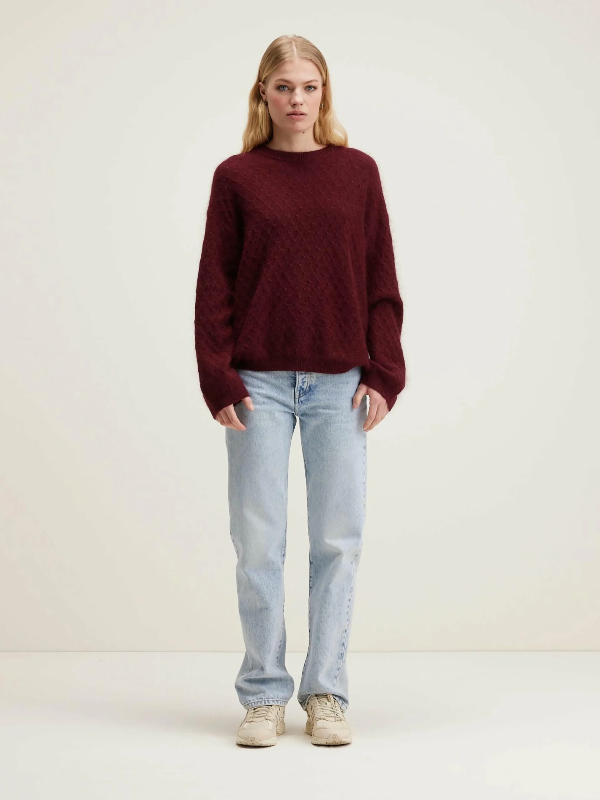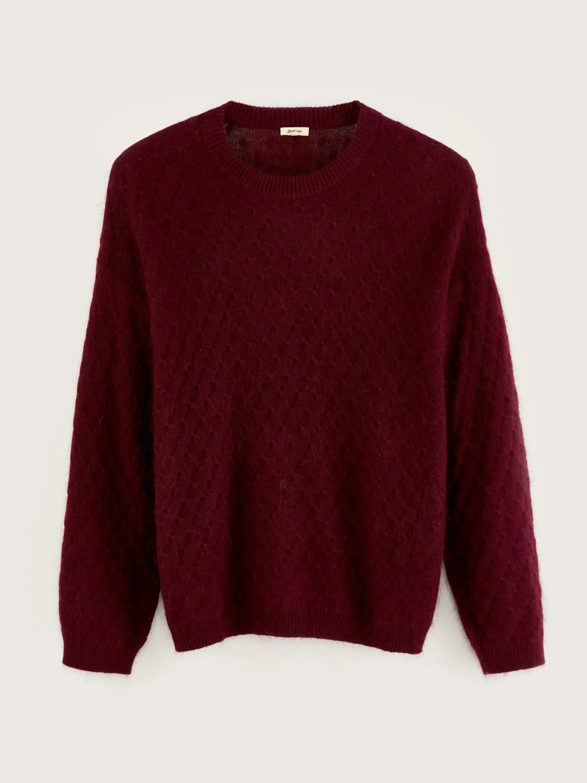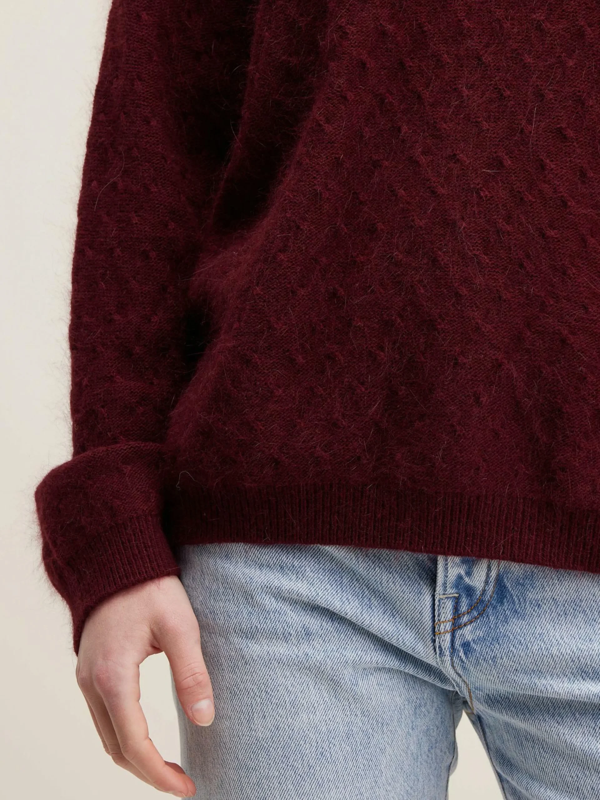 Pull en angora couleur bordeaux, coupe décontractée et col rond.