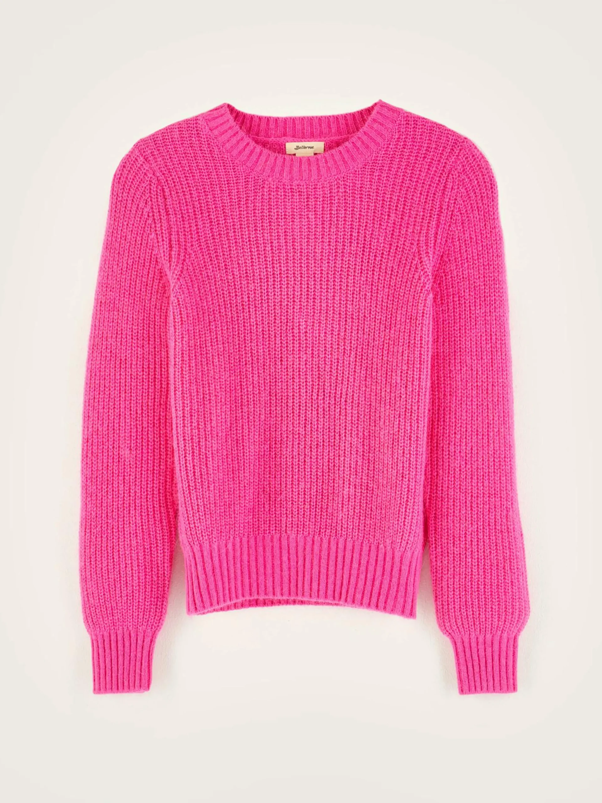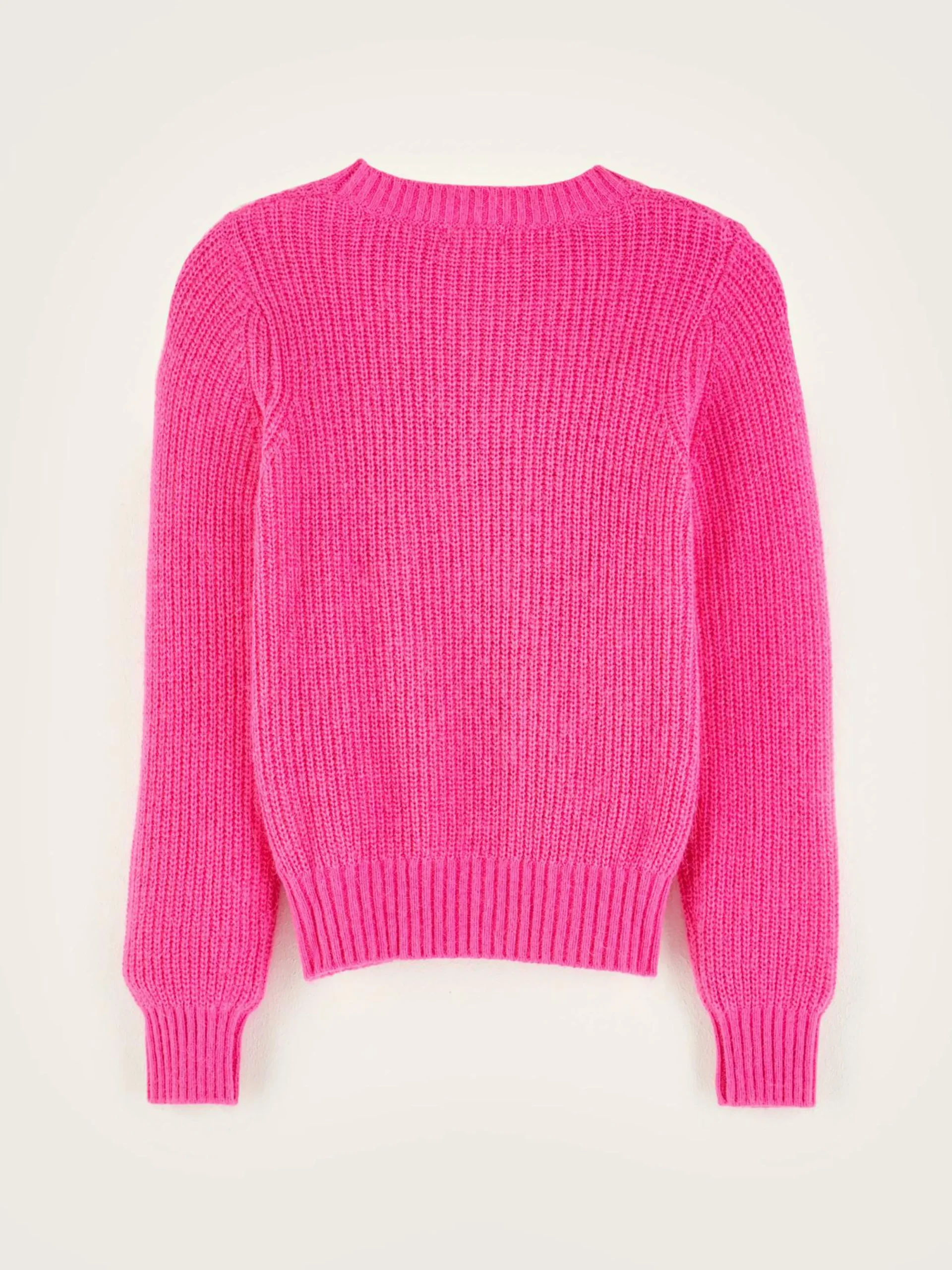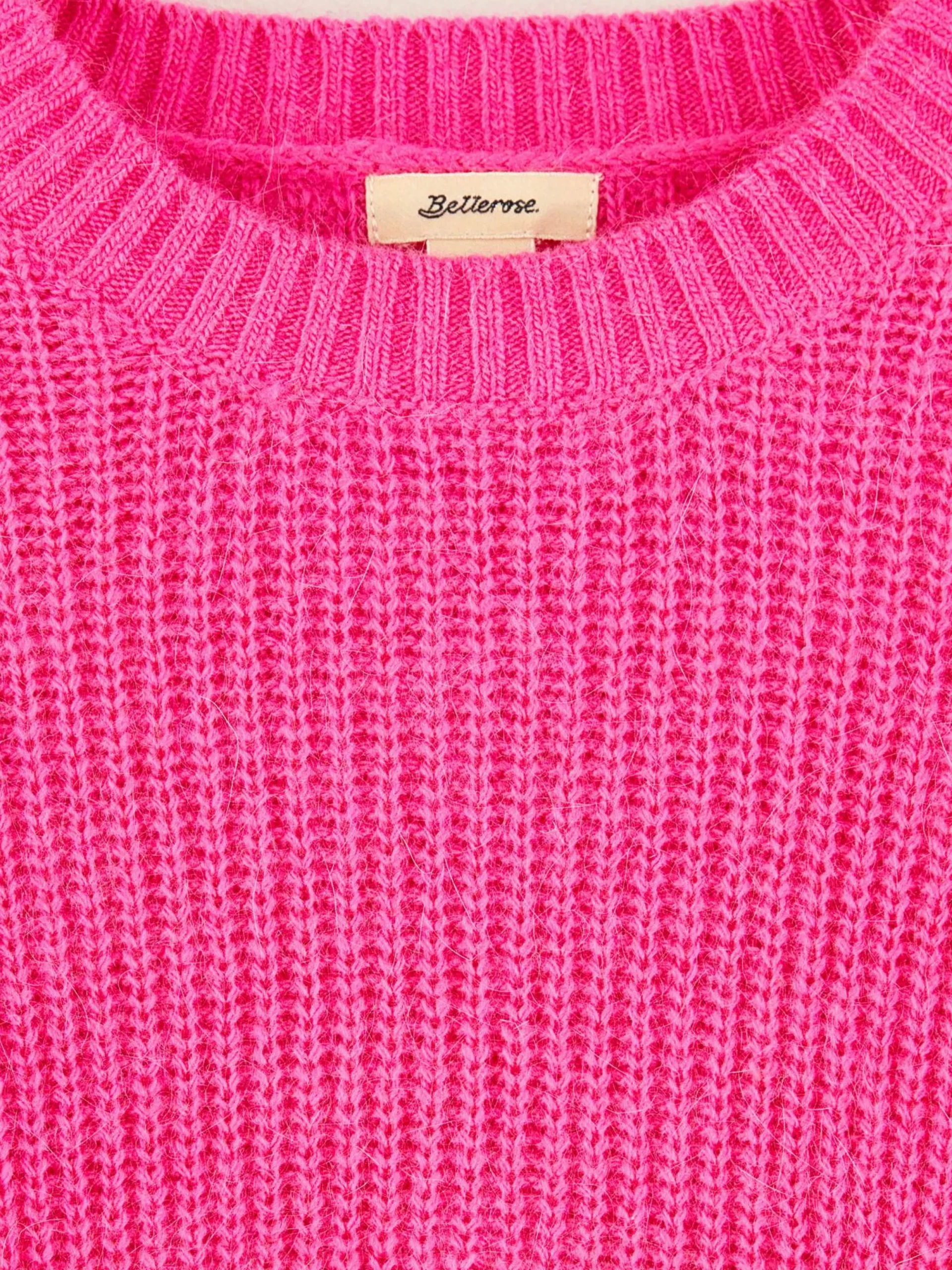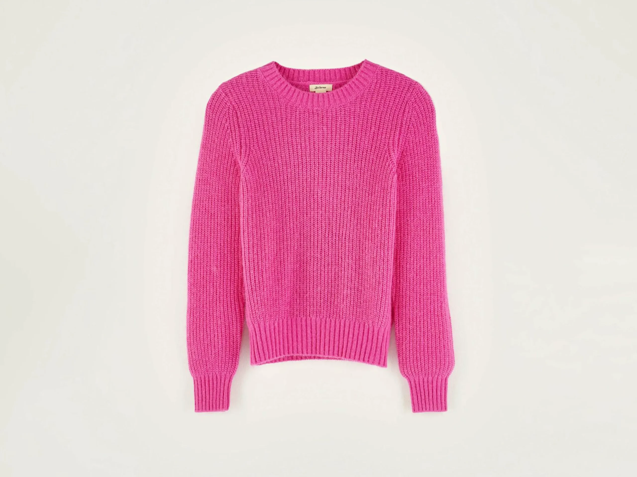 Pull à col rond coupe classique en maille angora couleur fuchsia.