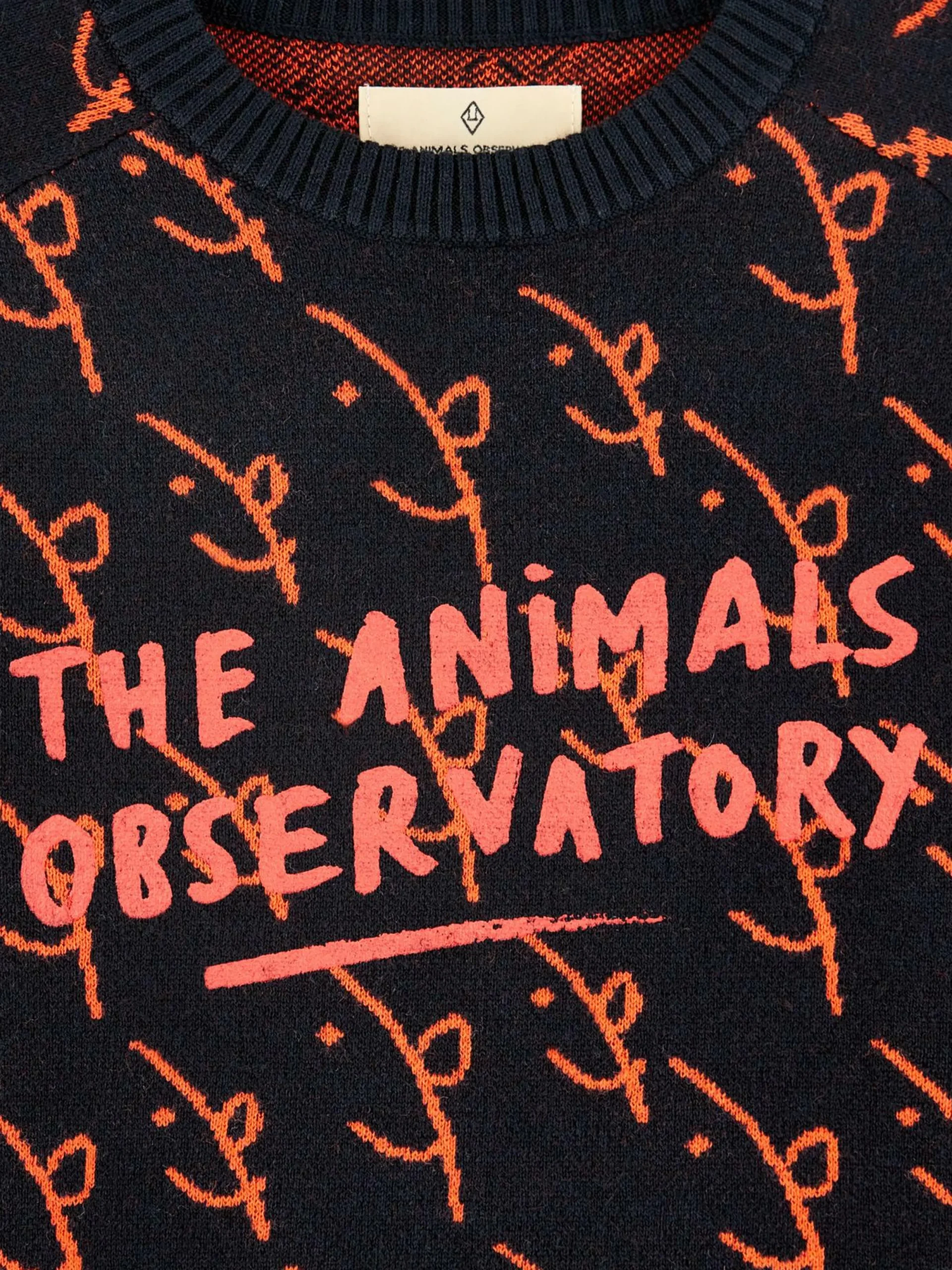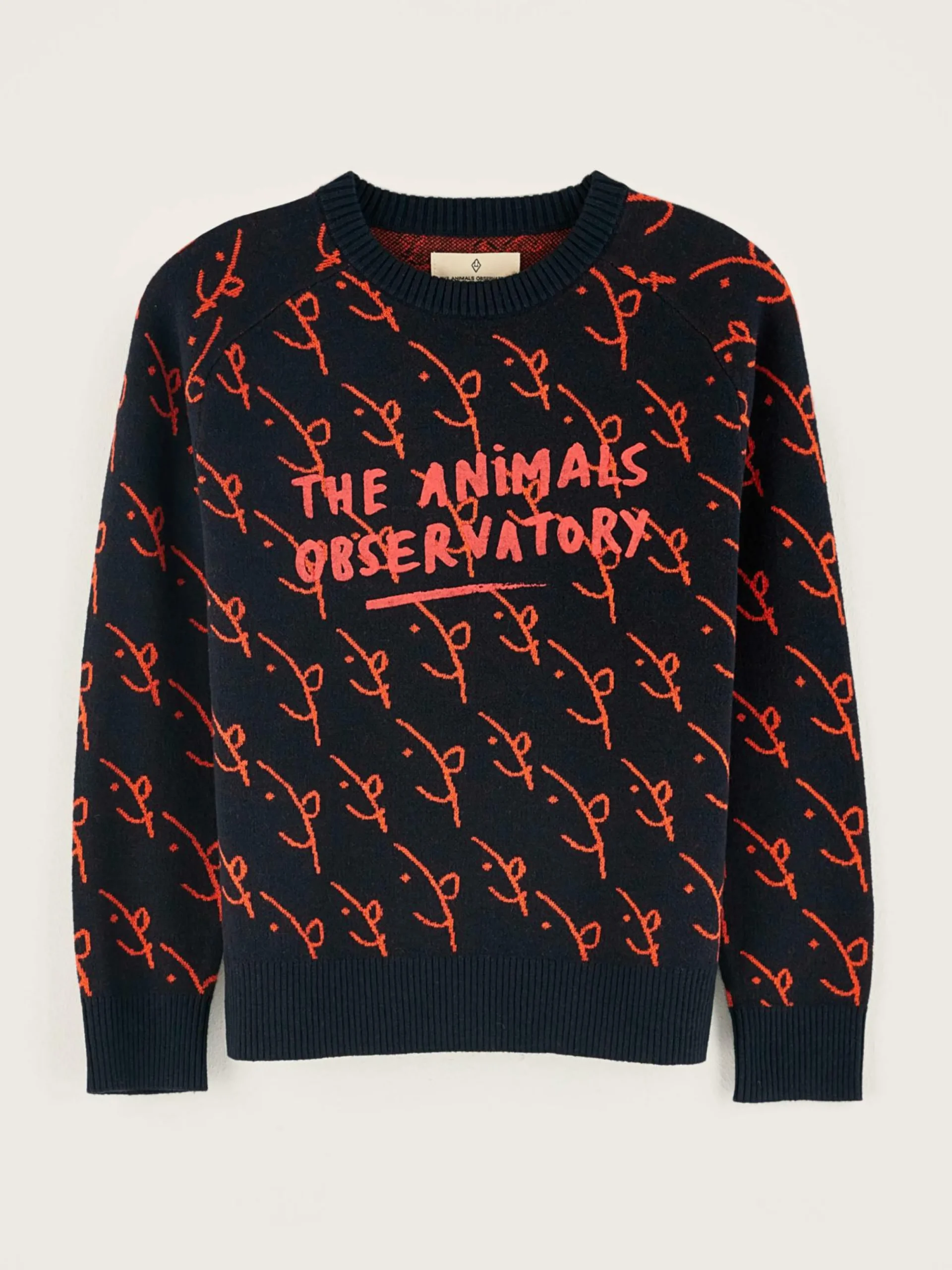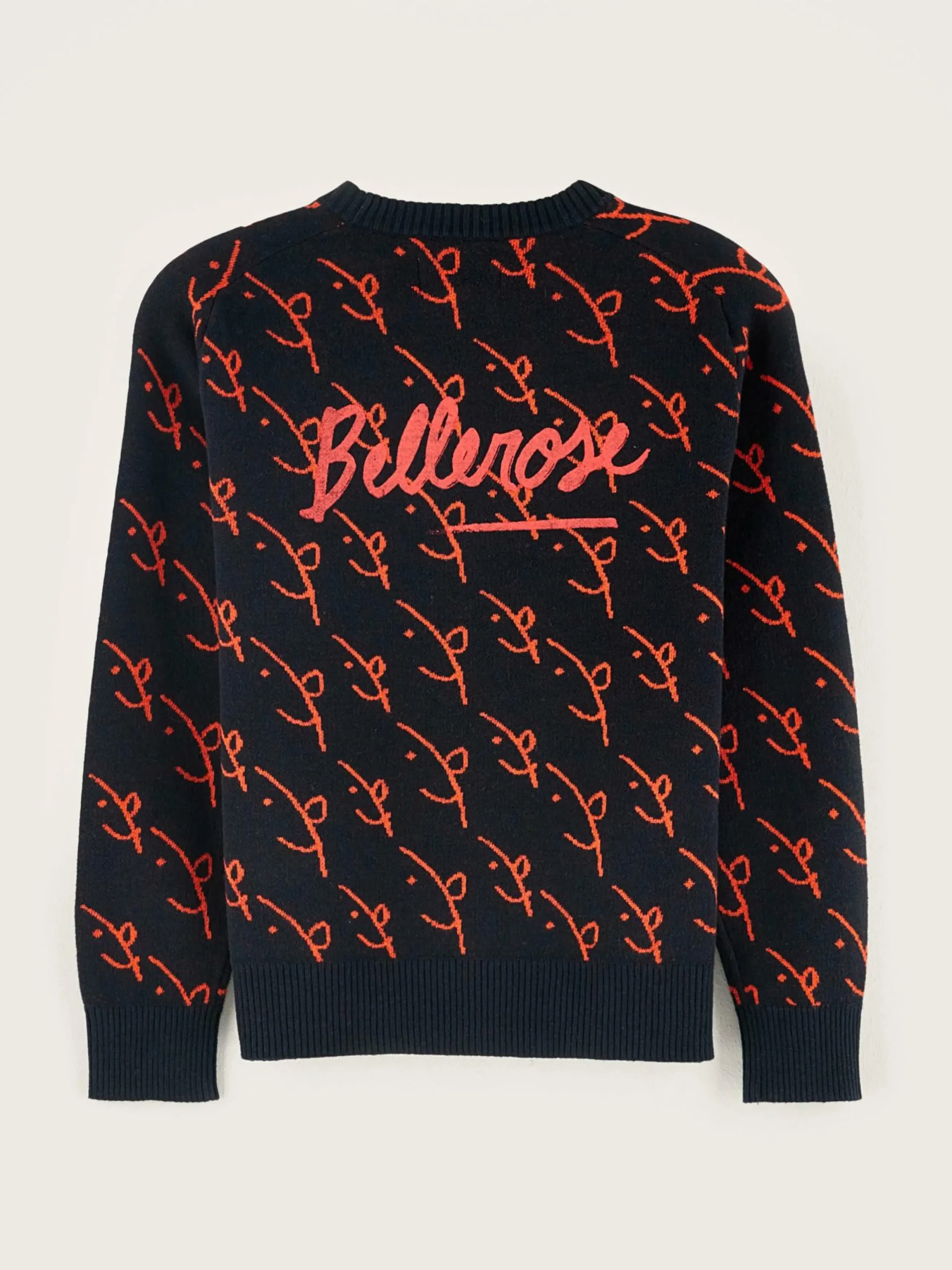 Pull classique à col ras du cou en coton et laine avec un motif jacquard Bellerose x The Animal Observatory sur le devant et le dos.