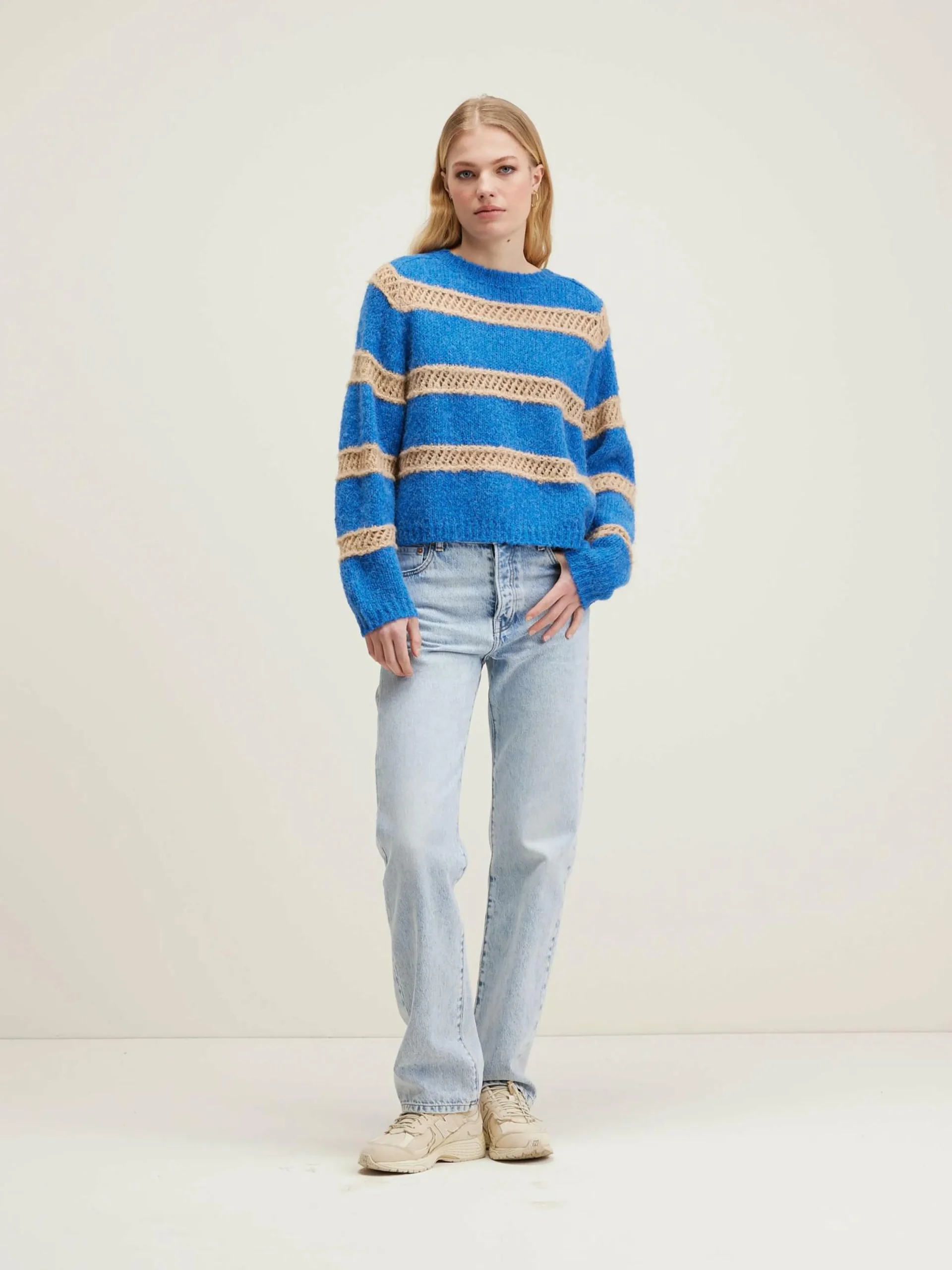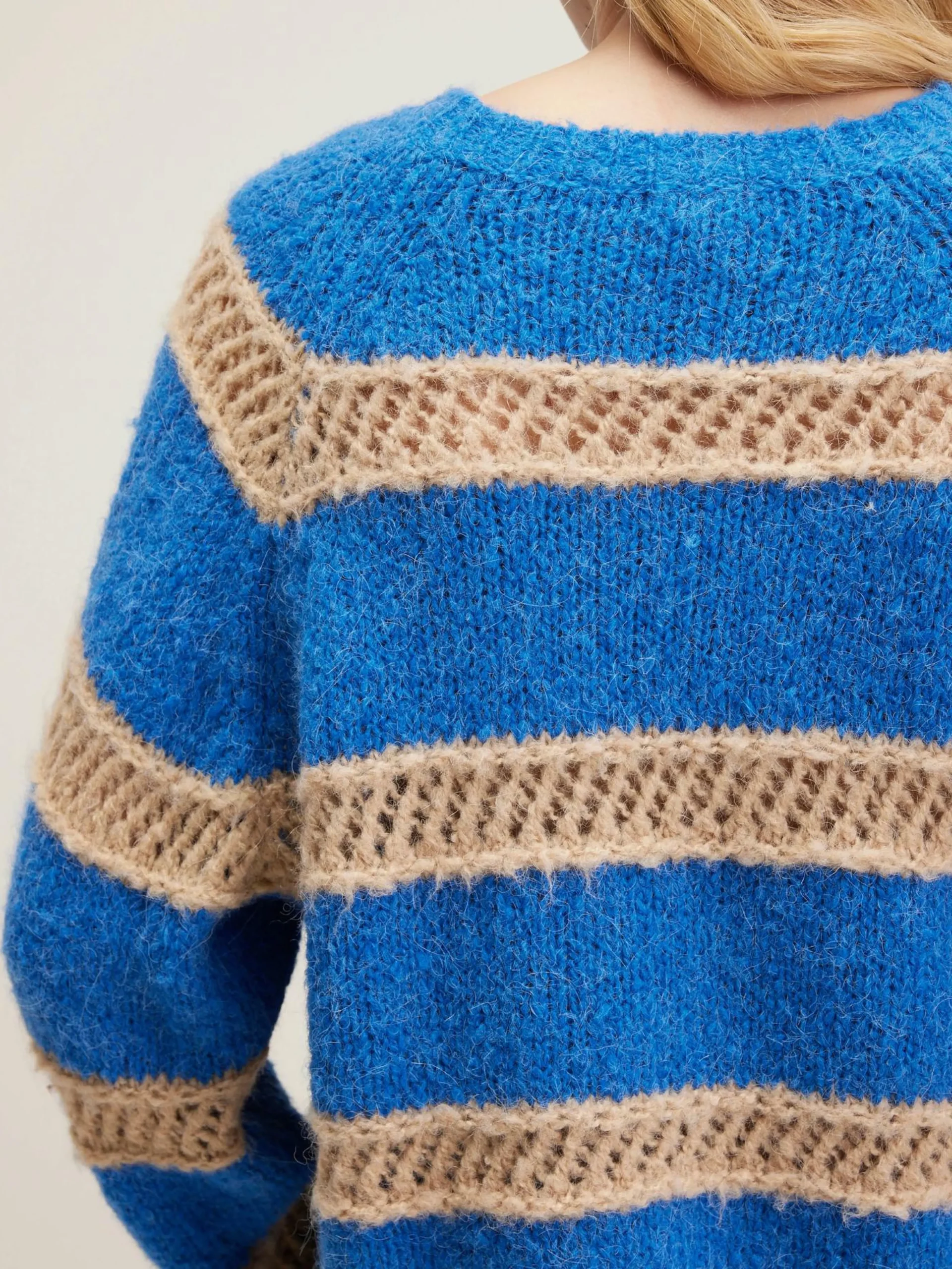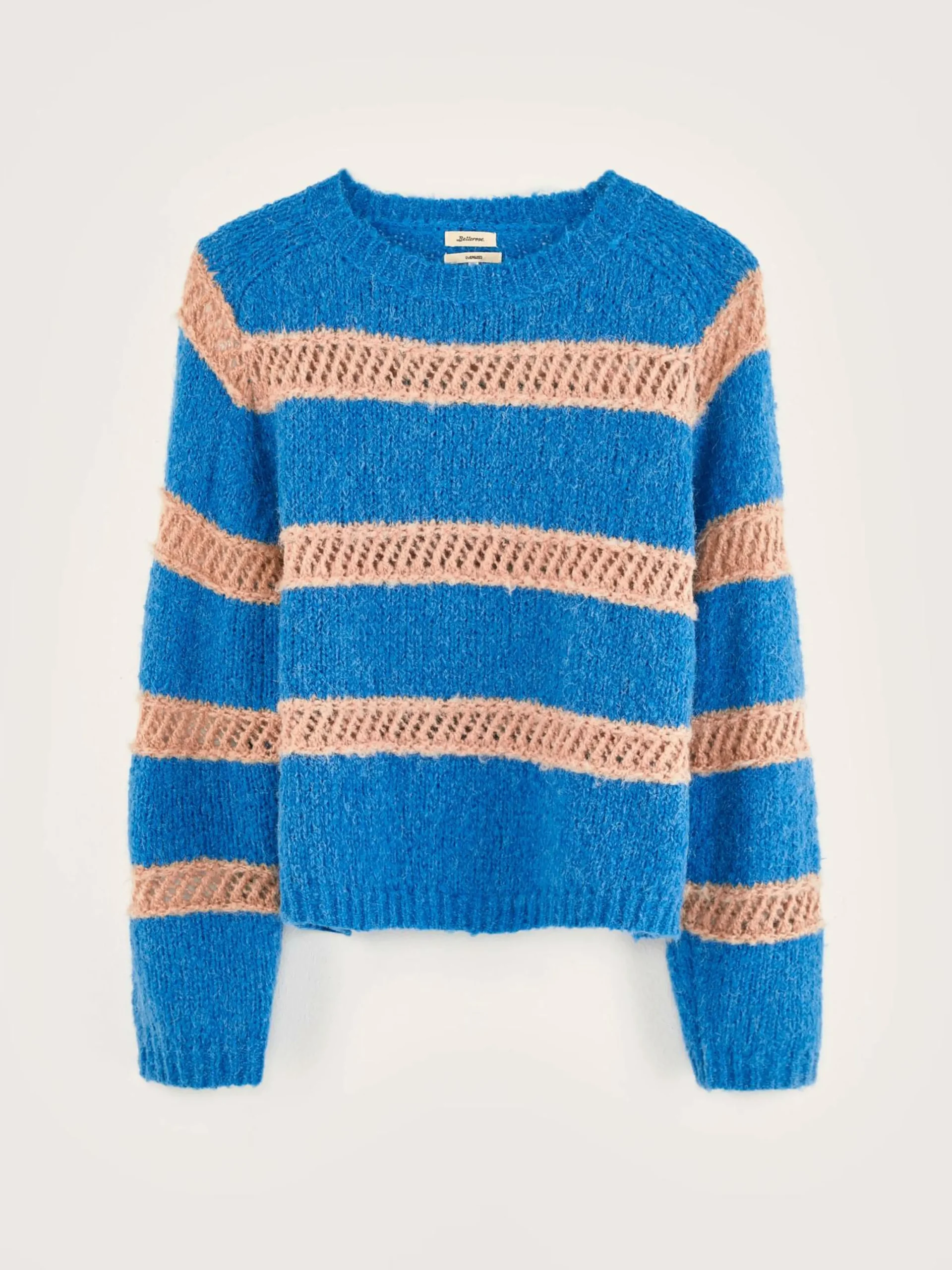 Pull oversize bleu, col rond double, détails de mailles ajourées.