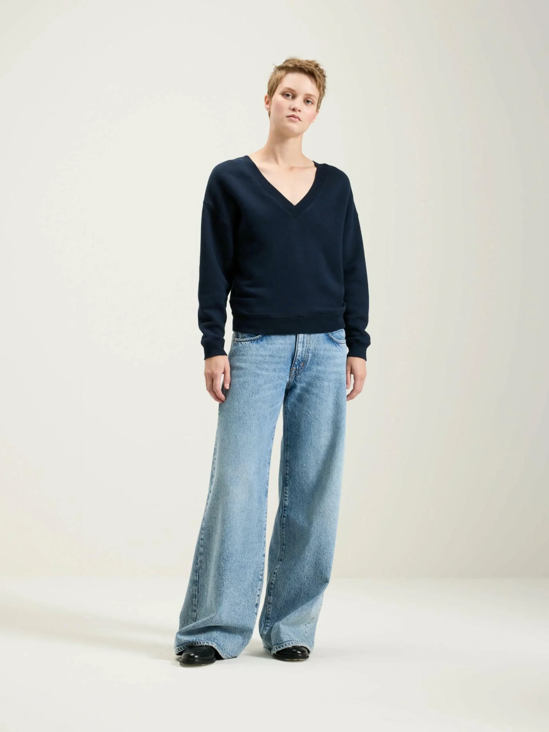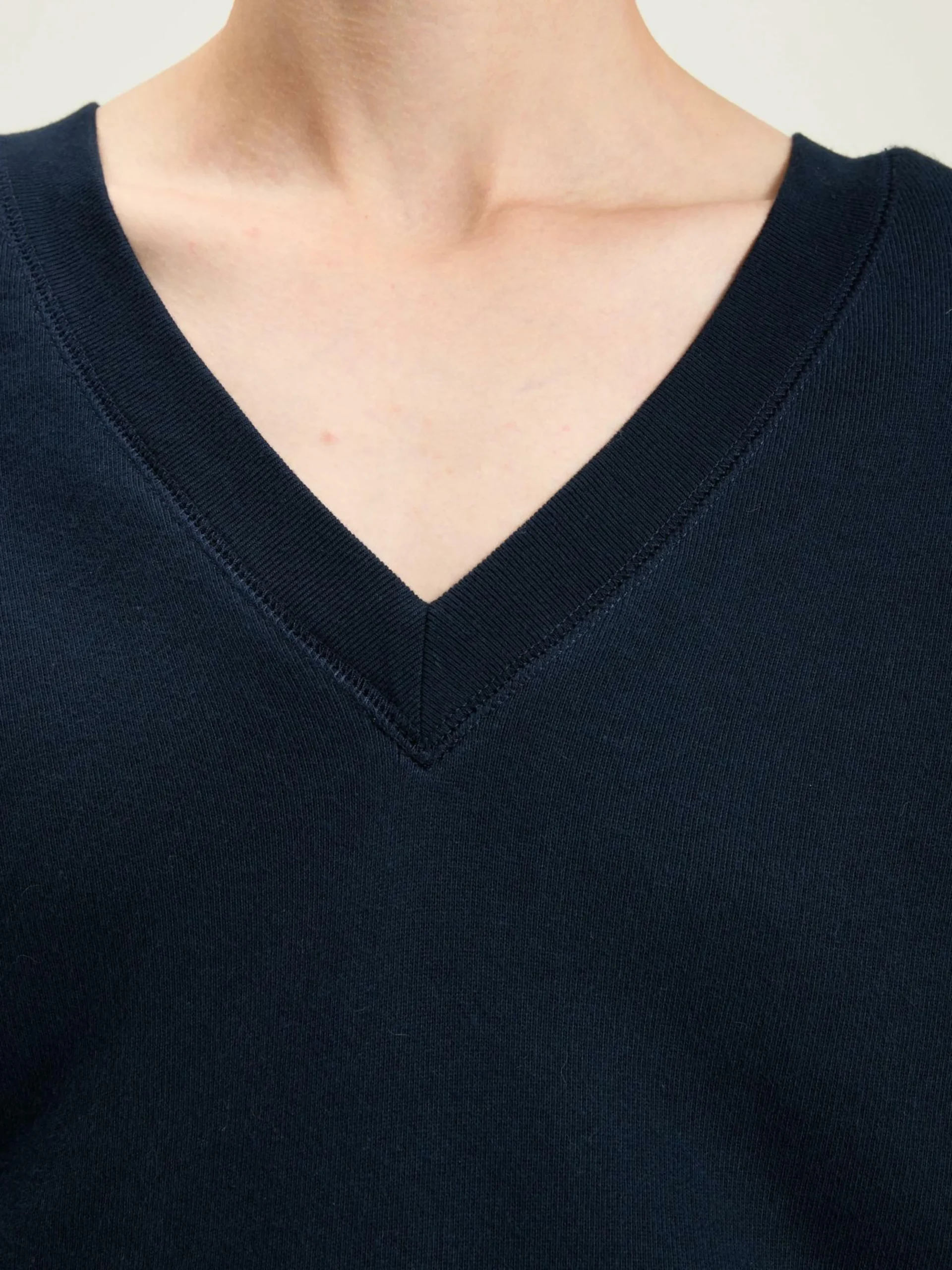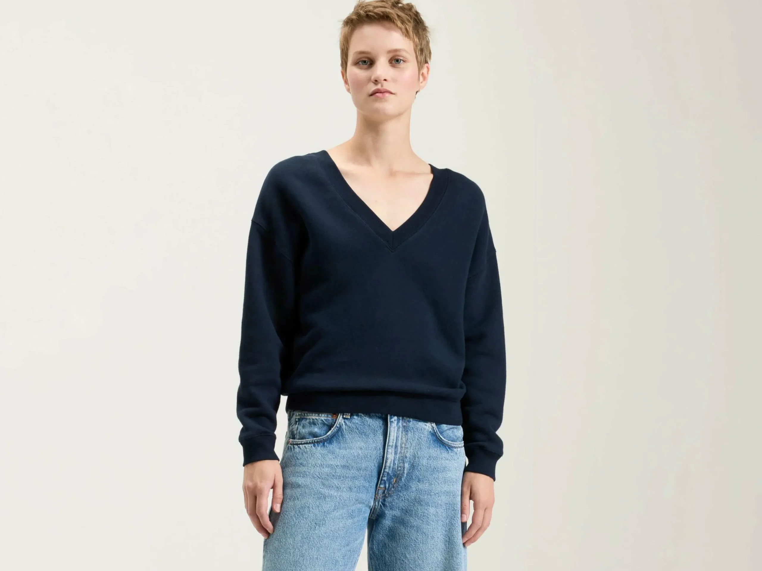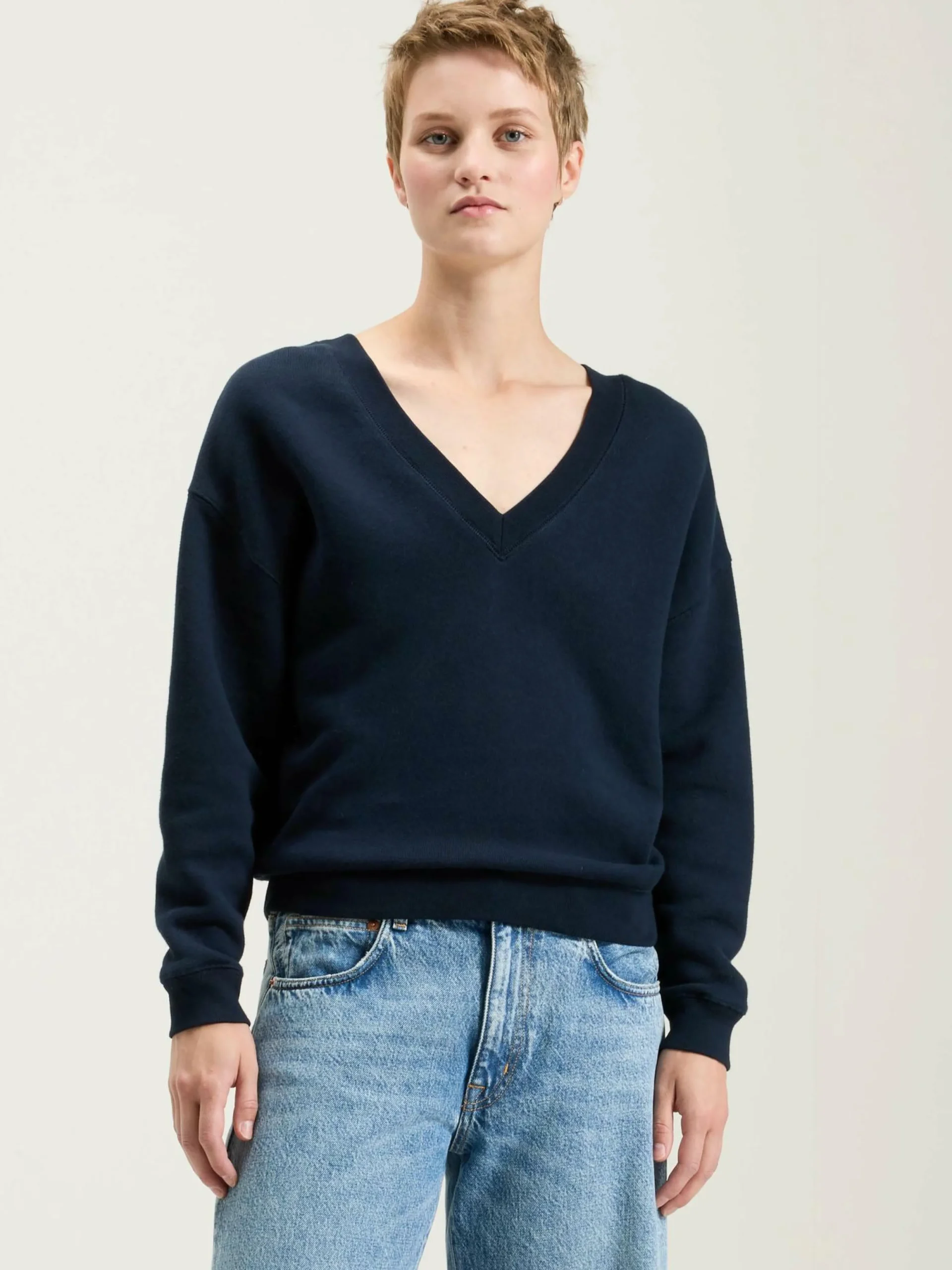 Sweatshirt décontracté bleu marine à col en V en molleton.