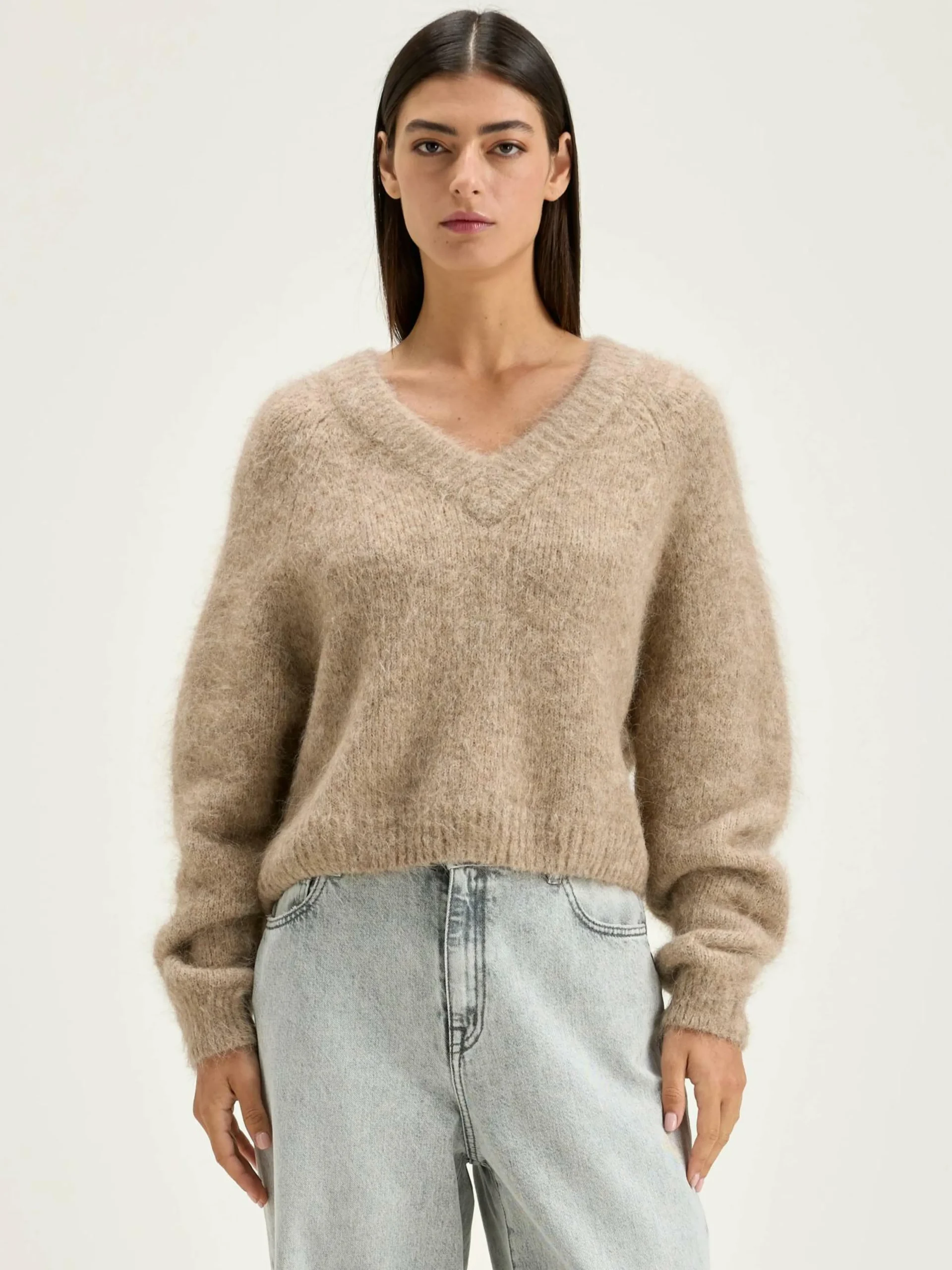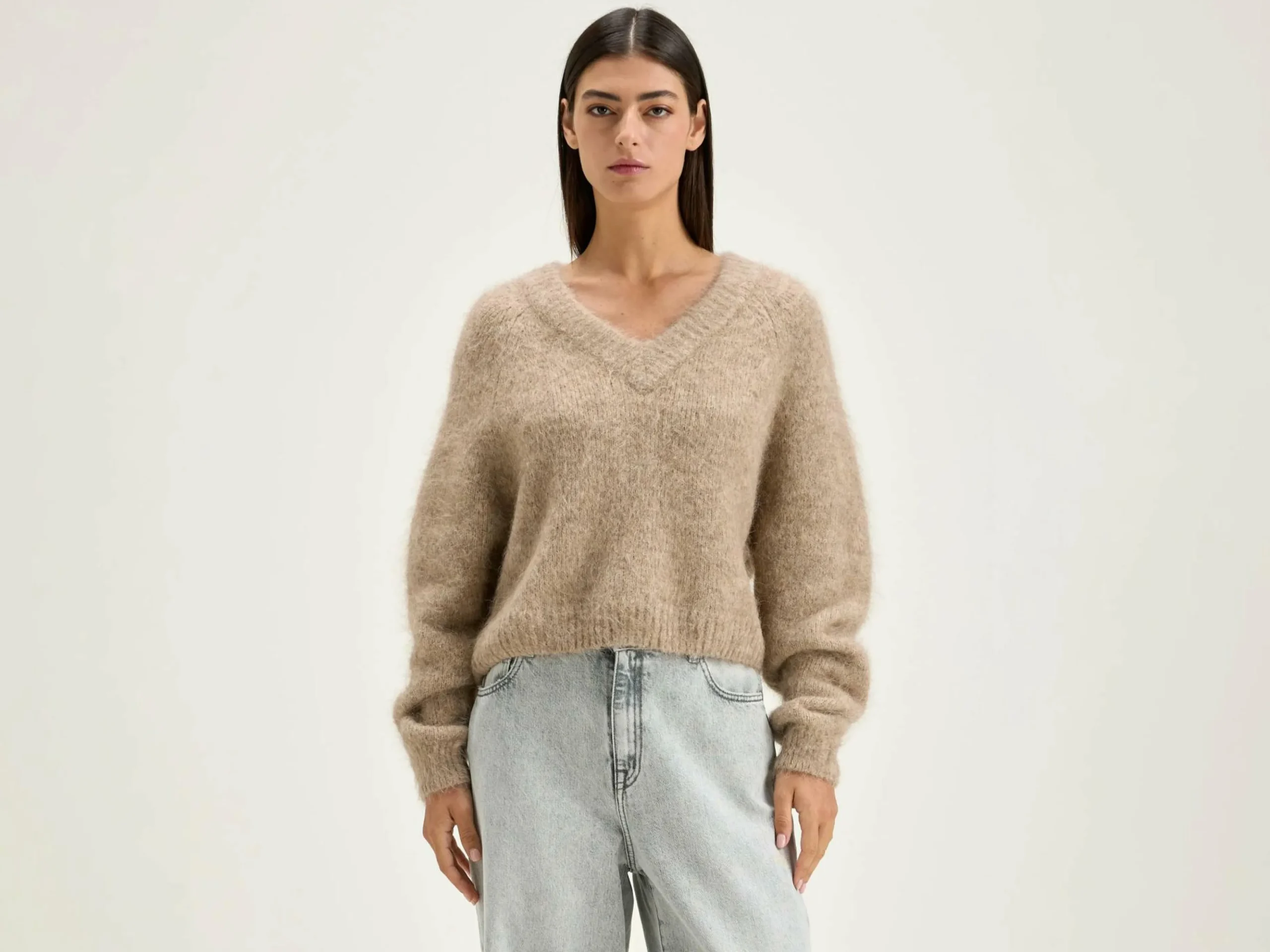 Pull cropped beige mélangé avec col en V tricoté double et manches raglan.