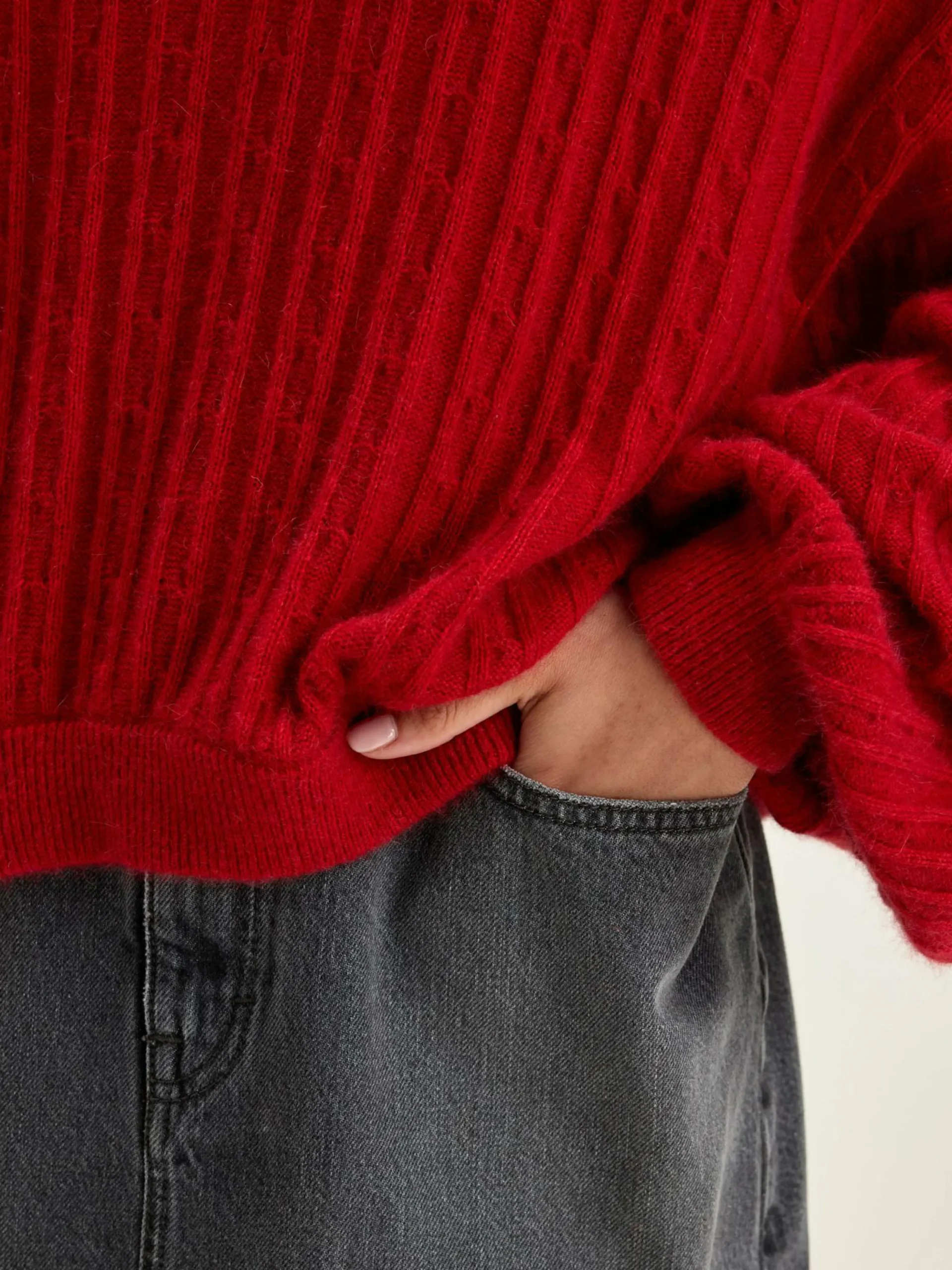 Pull cropped et volumineux tricoté en torsades inversées couleur rouge cardinal.