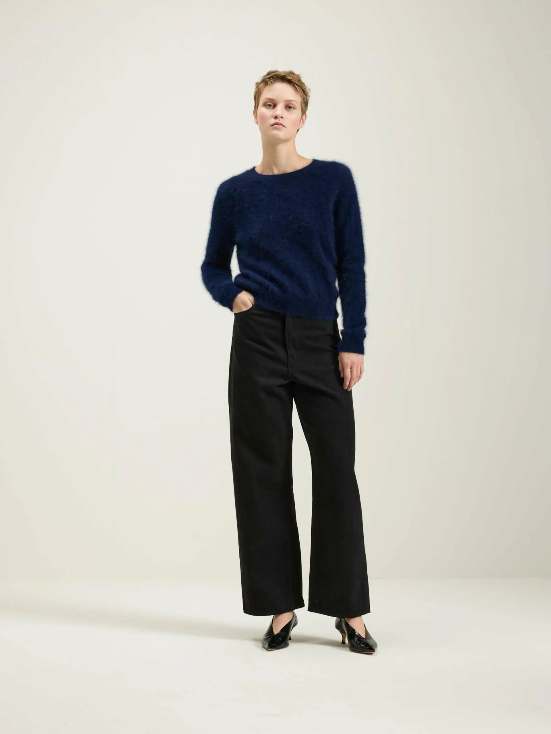 Pull classique bleu marine à col rond en mélange d’angora.