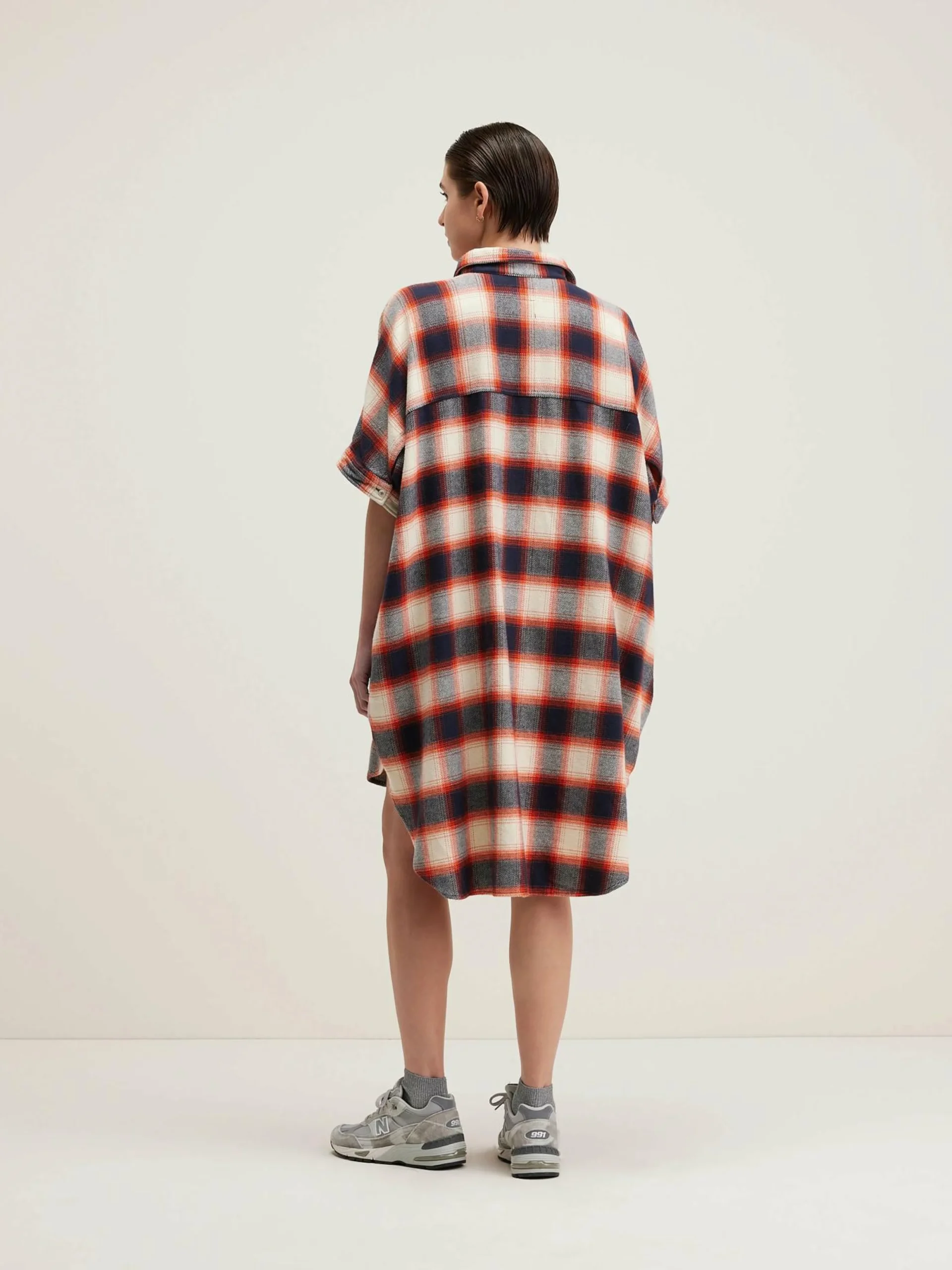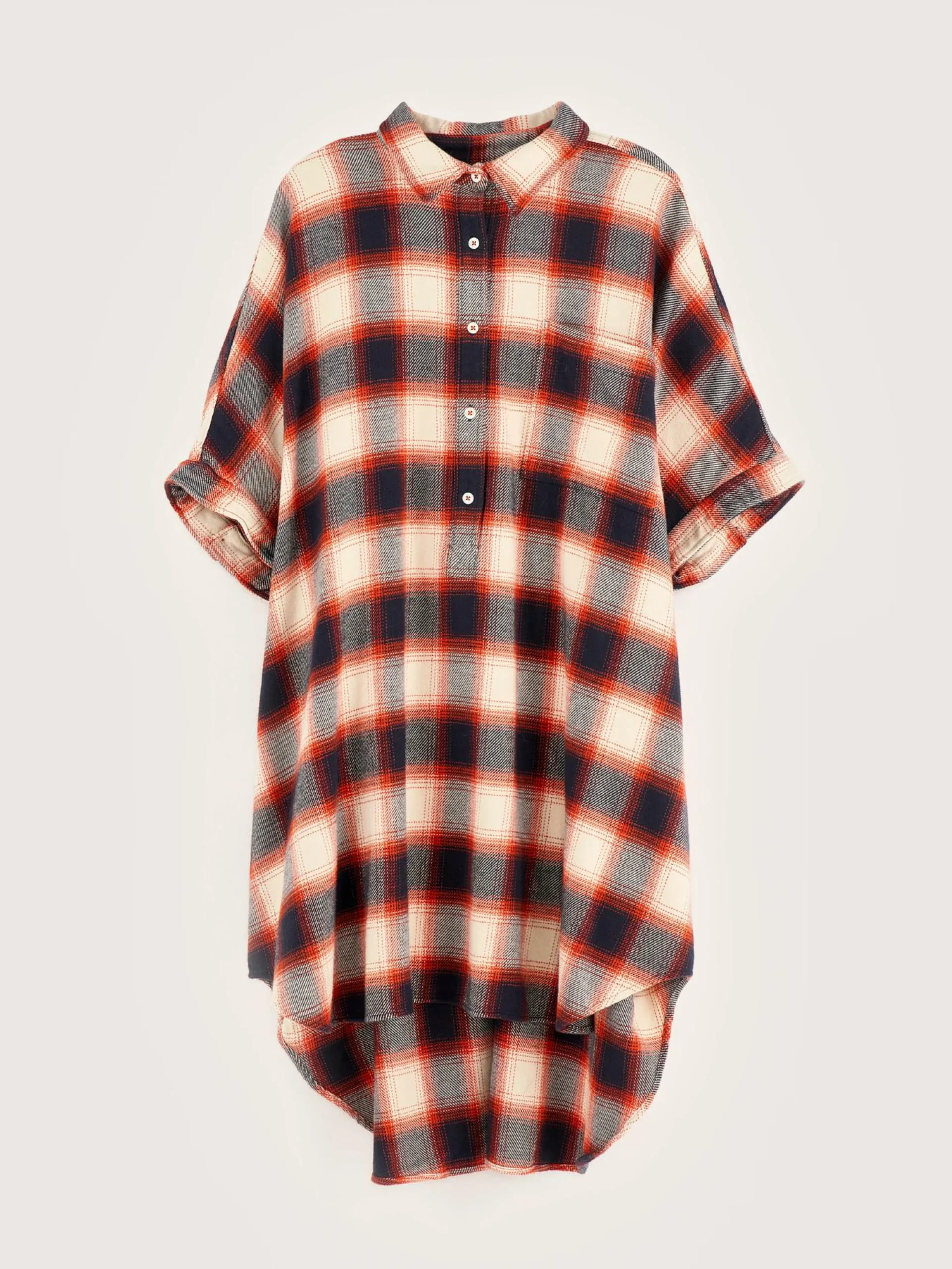 Robe chemise oversize en coton brossé à carreaux bleu marine et rouge.