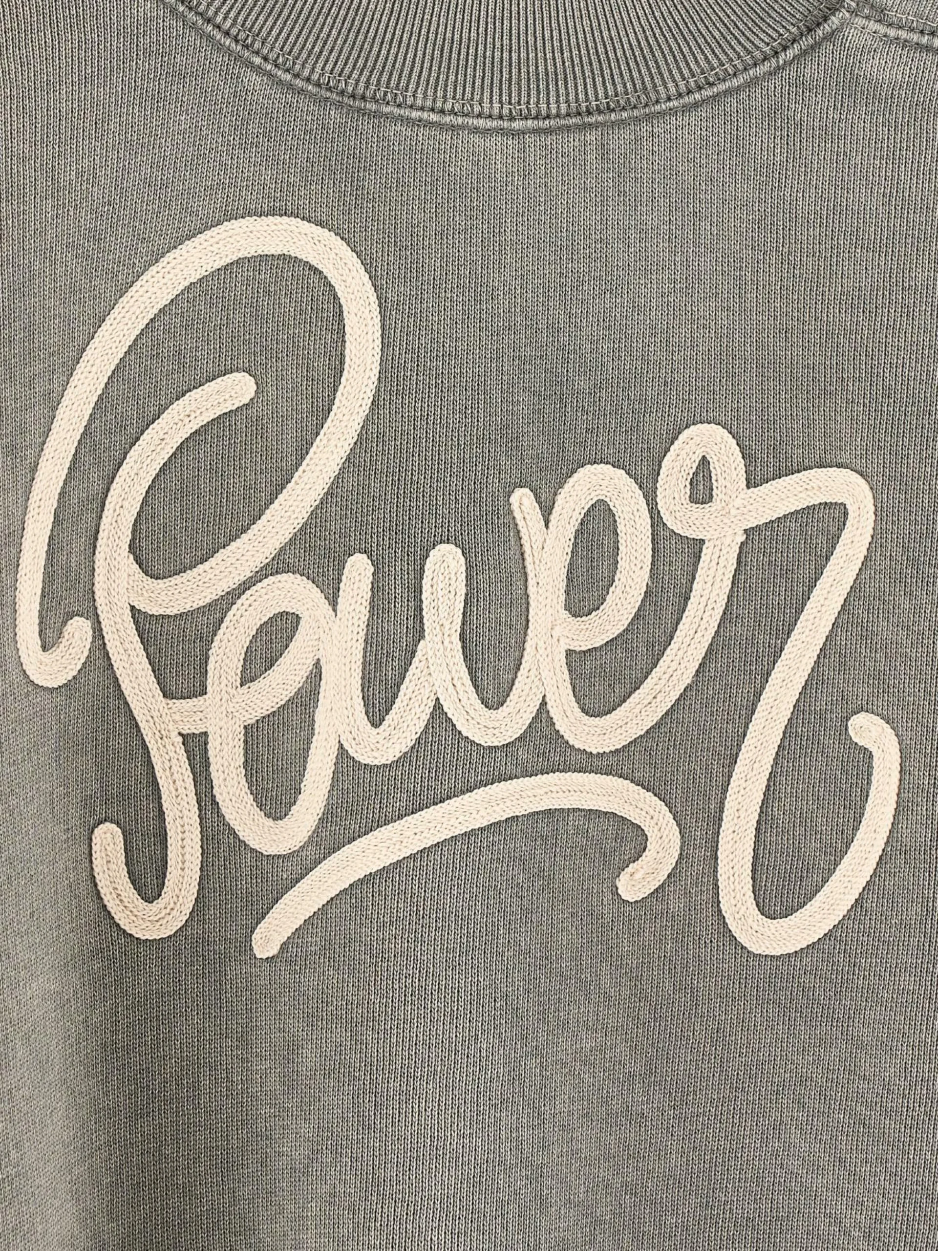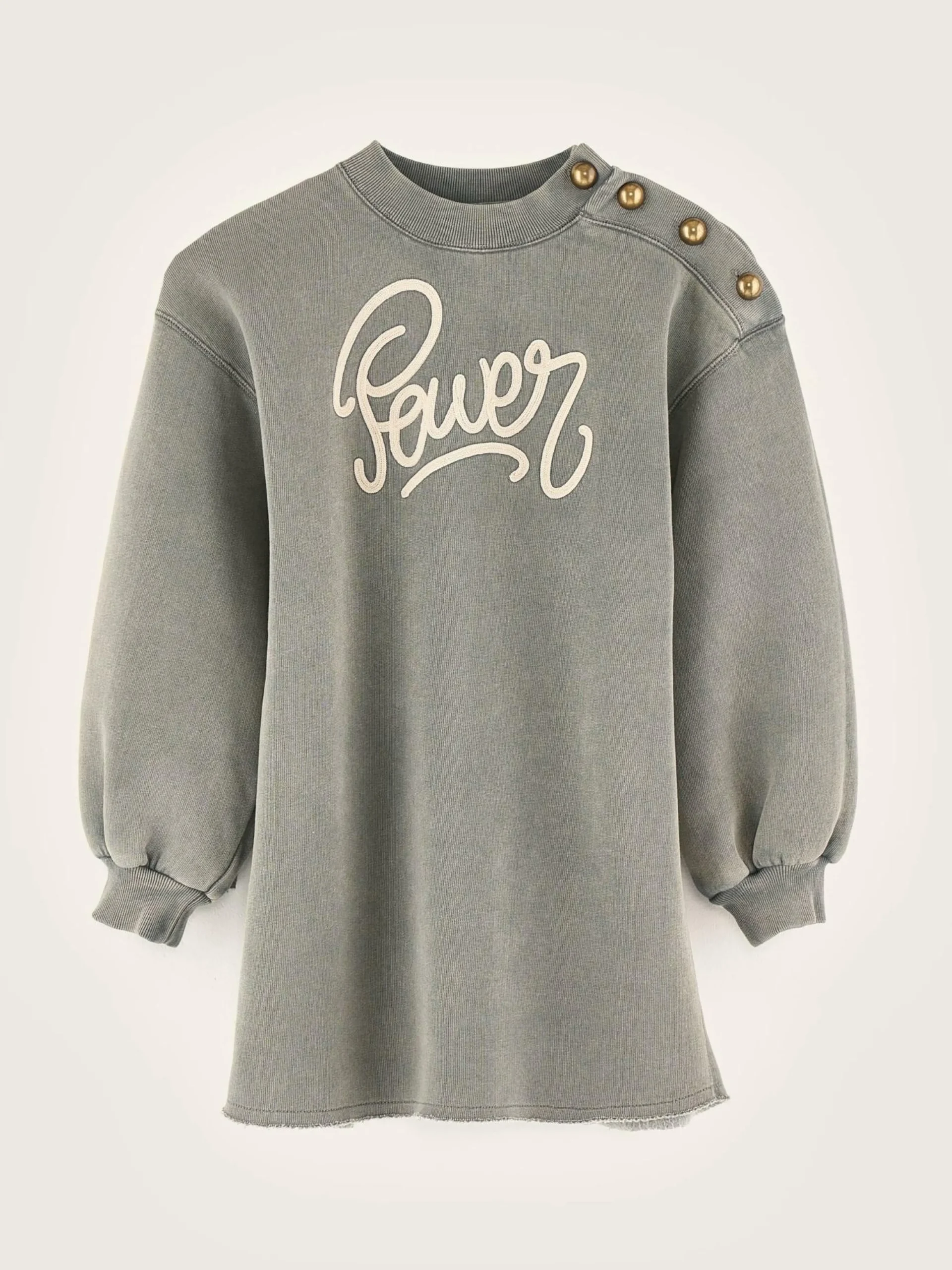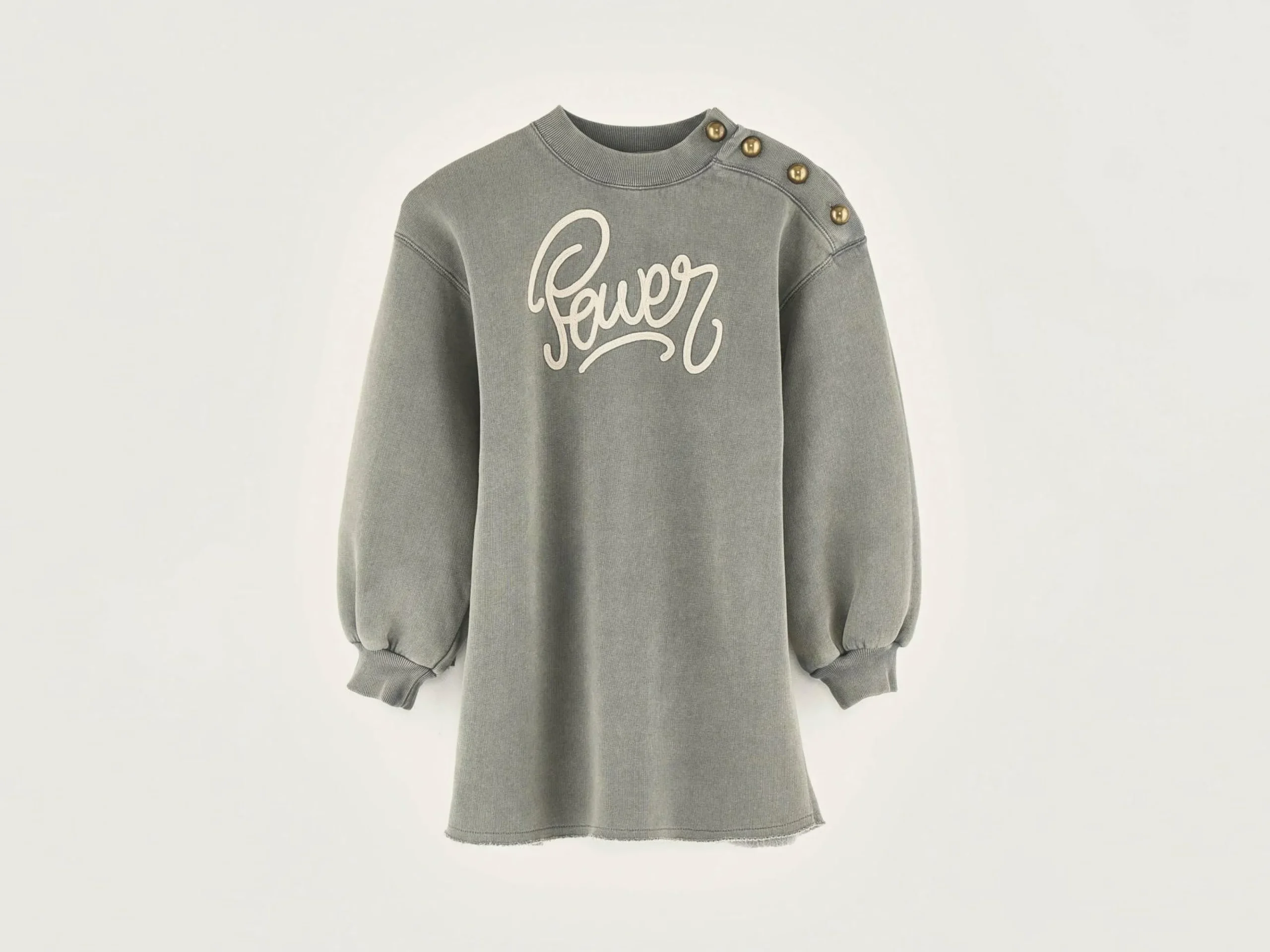 Robe en jersey noir délavé, broderie « Power » en lettres cursives sur l’avant, col rond et manches ballon aux poignets ajustés.