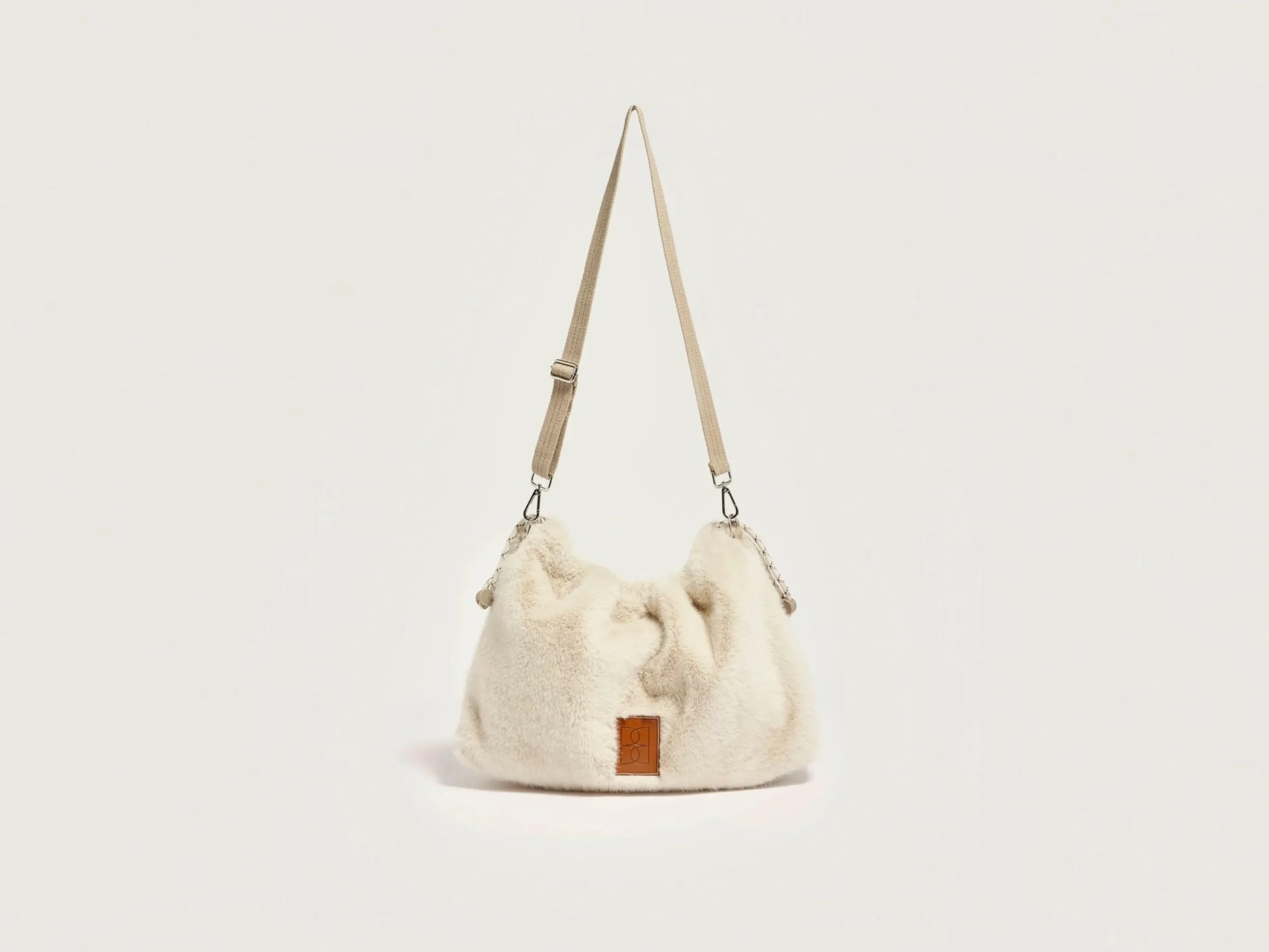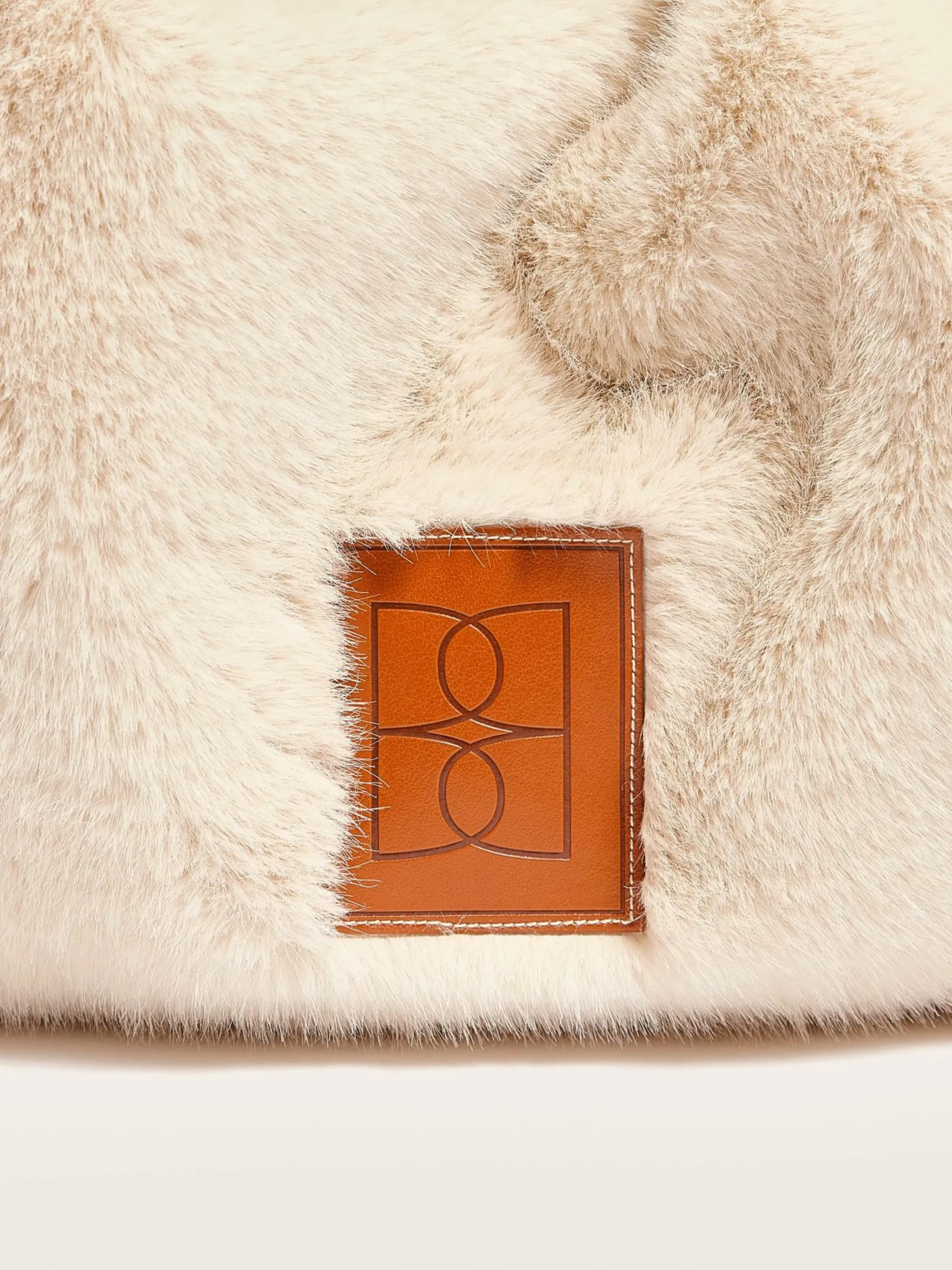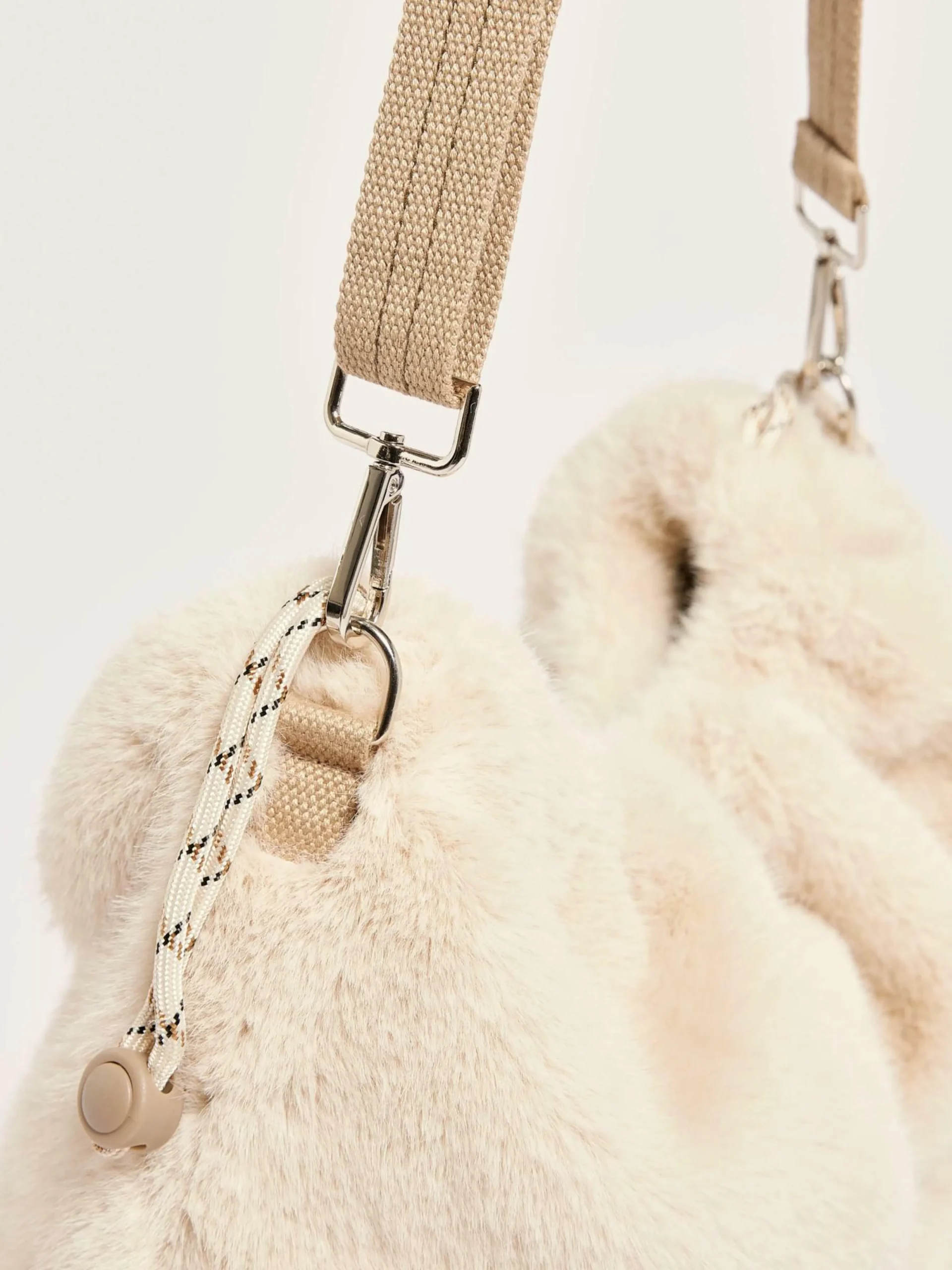 Sac berlingo en fausse fourrure écrue avec fermeture par zip et bandoulière amovible.