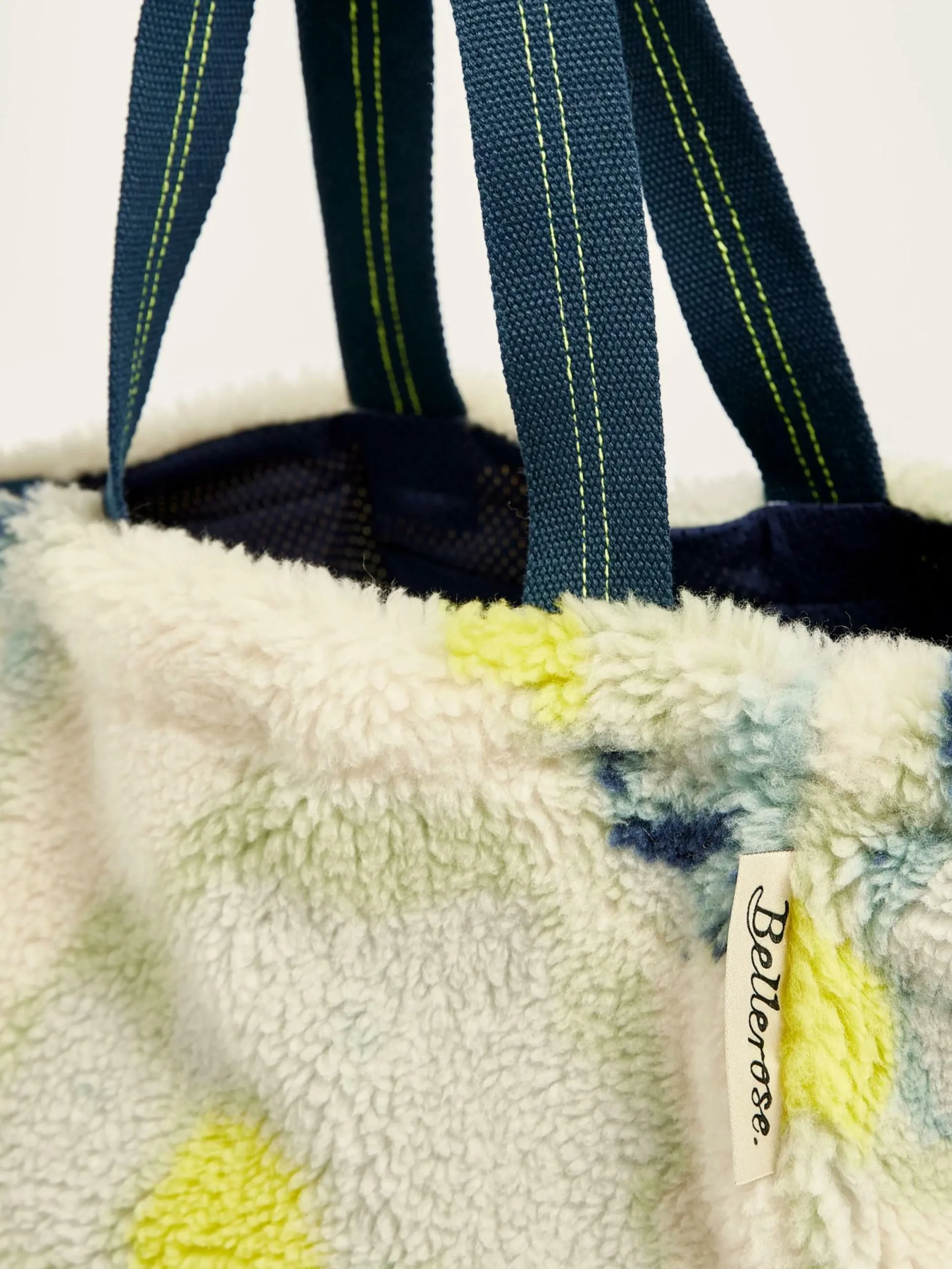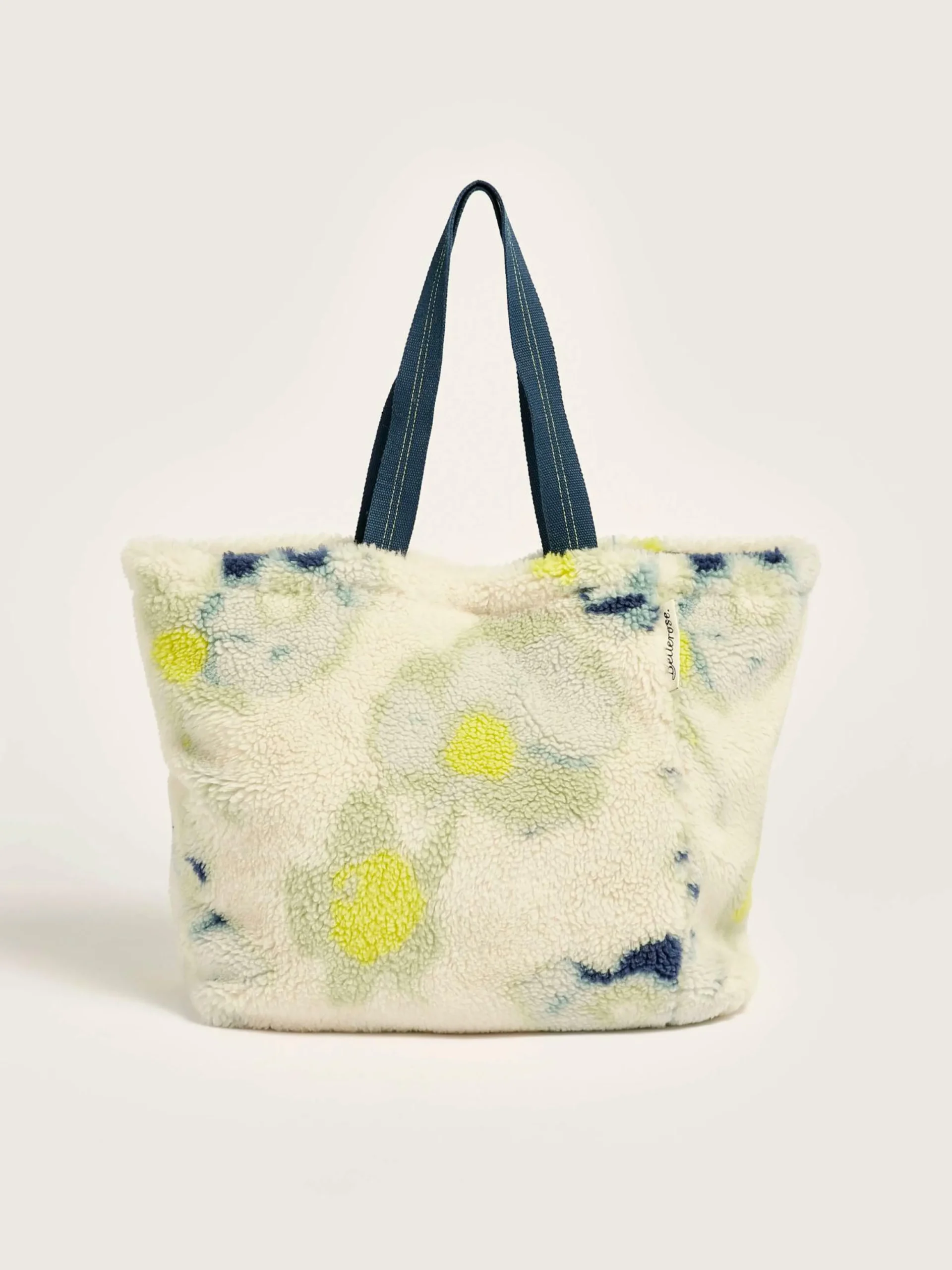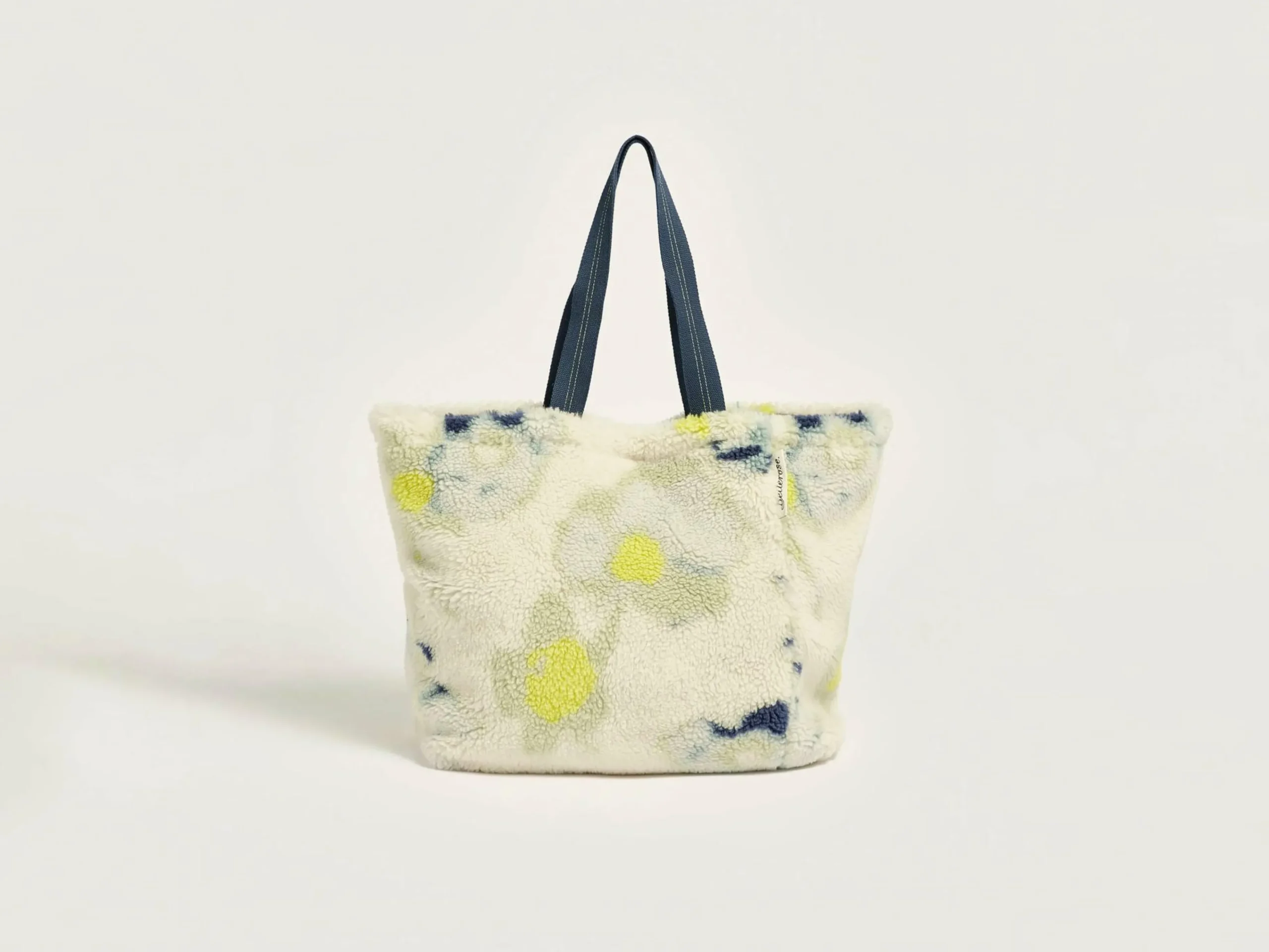 Sac à main à double fermeture en fausse fourrure imprimée de fleurs géantes et doublé de mesh bleu marine.