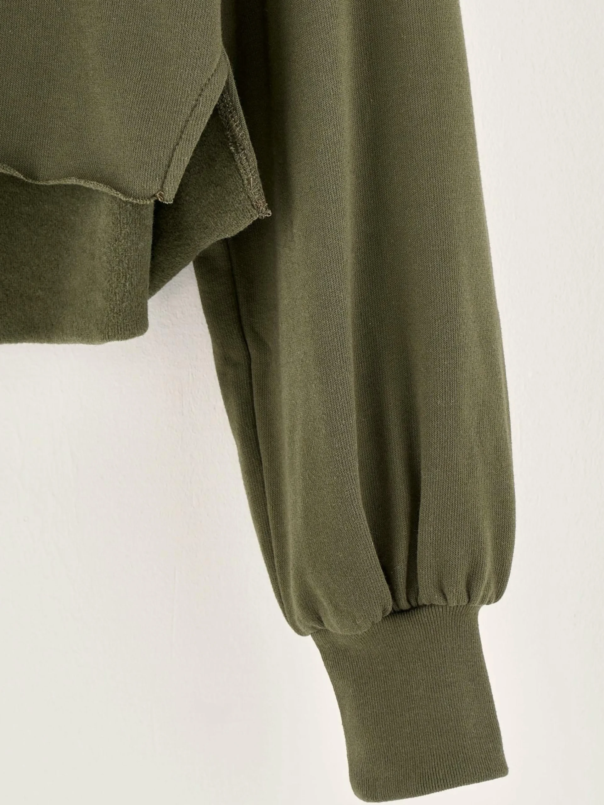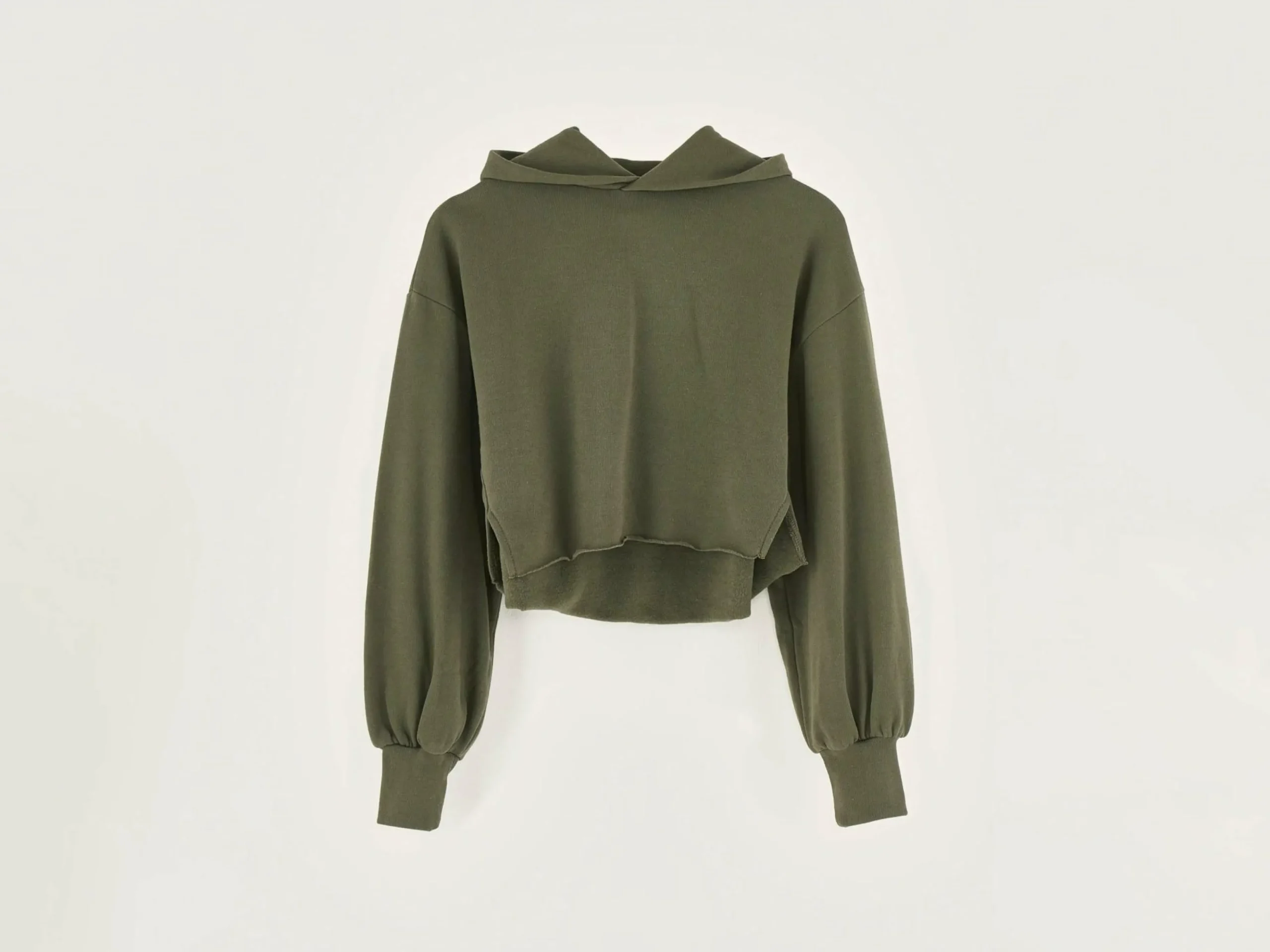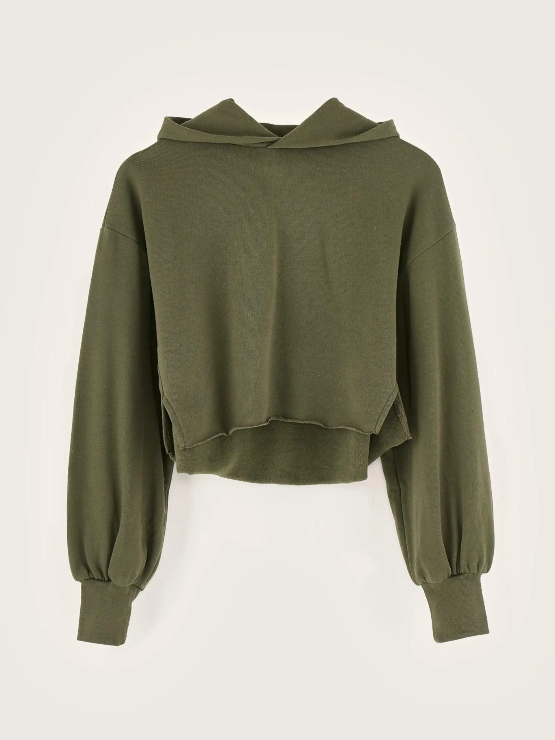 Sweatshirt boxy à capuche en jersey éponge couleur vert kaki.