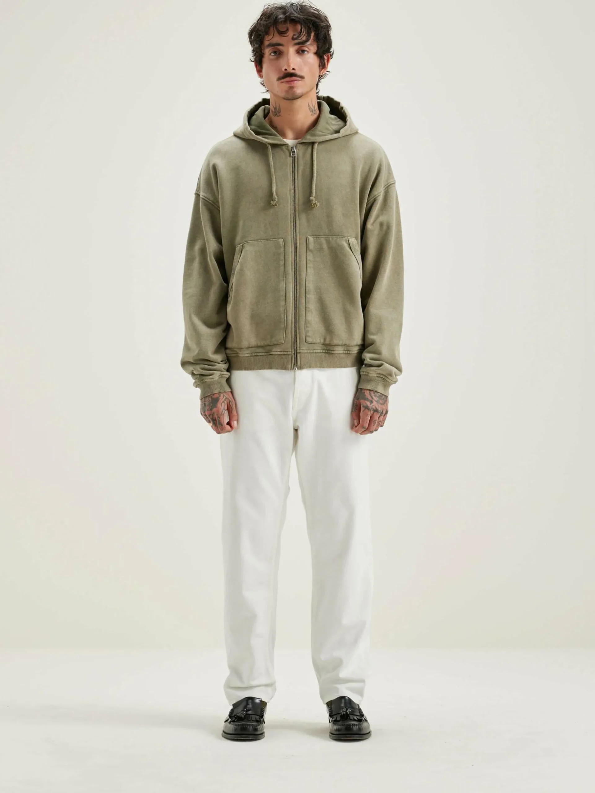 Sweatshirt zippé à capuche, coupe oversize en jersey de coton épais couleur vert militaire.