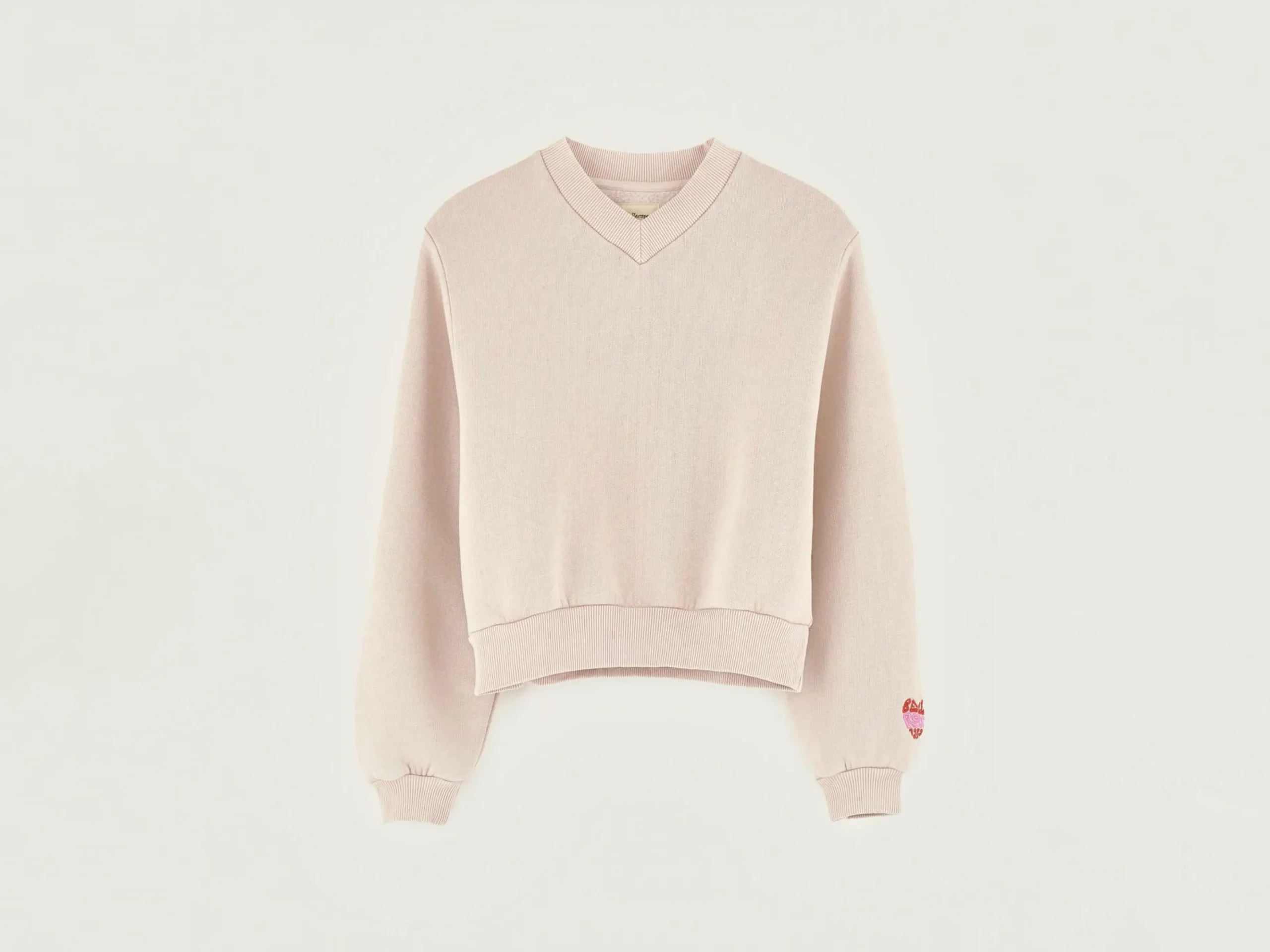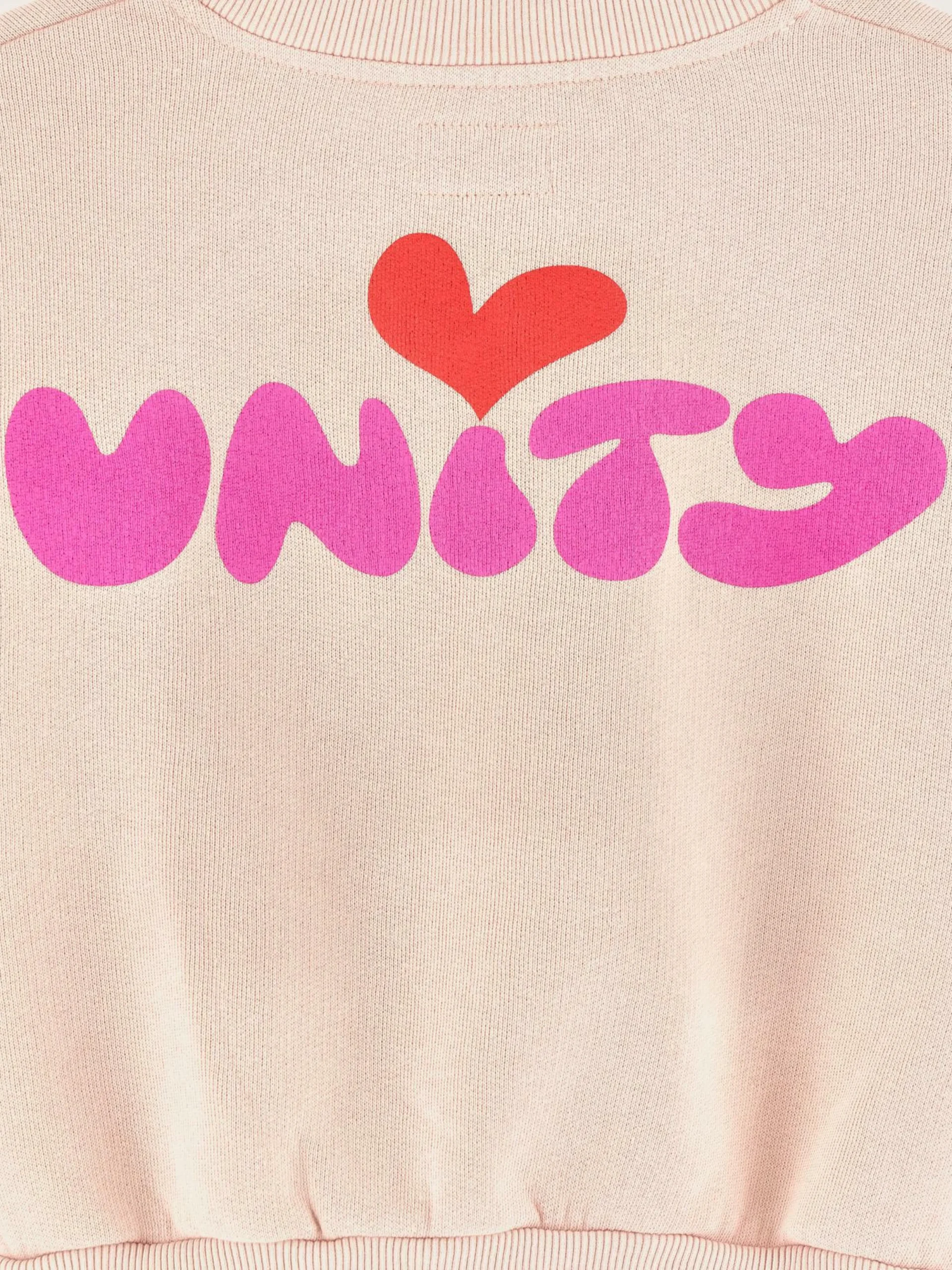 Sweatshirt décontracté à col V, en jersey rose poudré et imprimé « Unity » sur l’arrière.