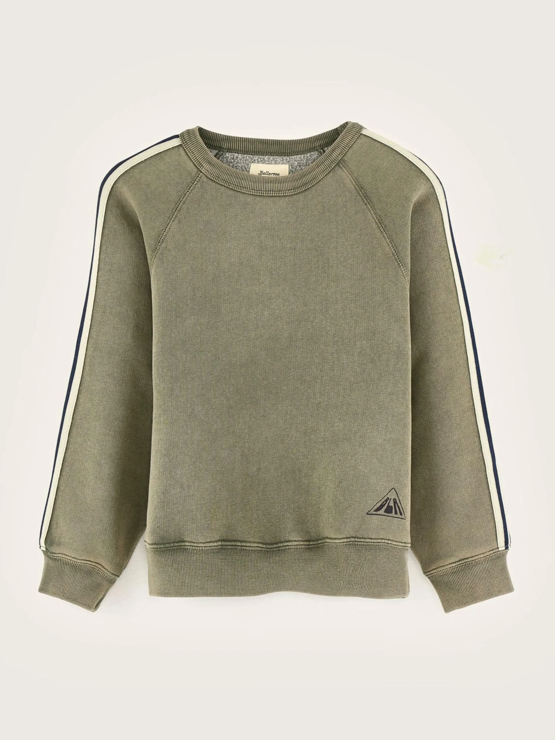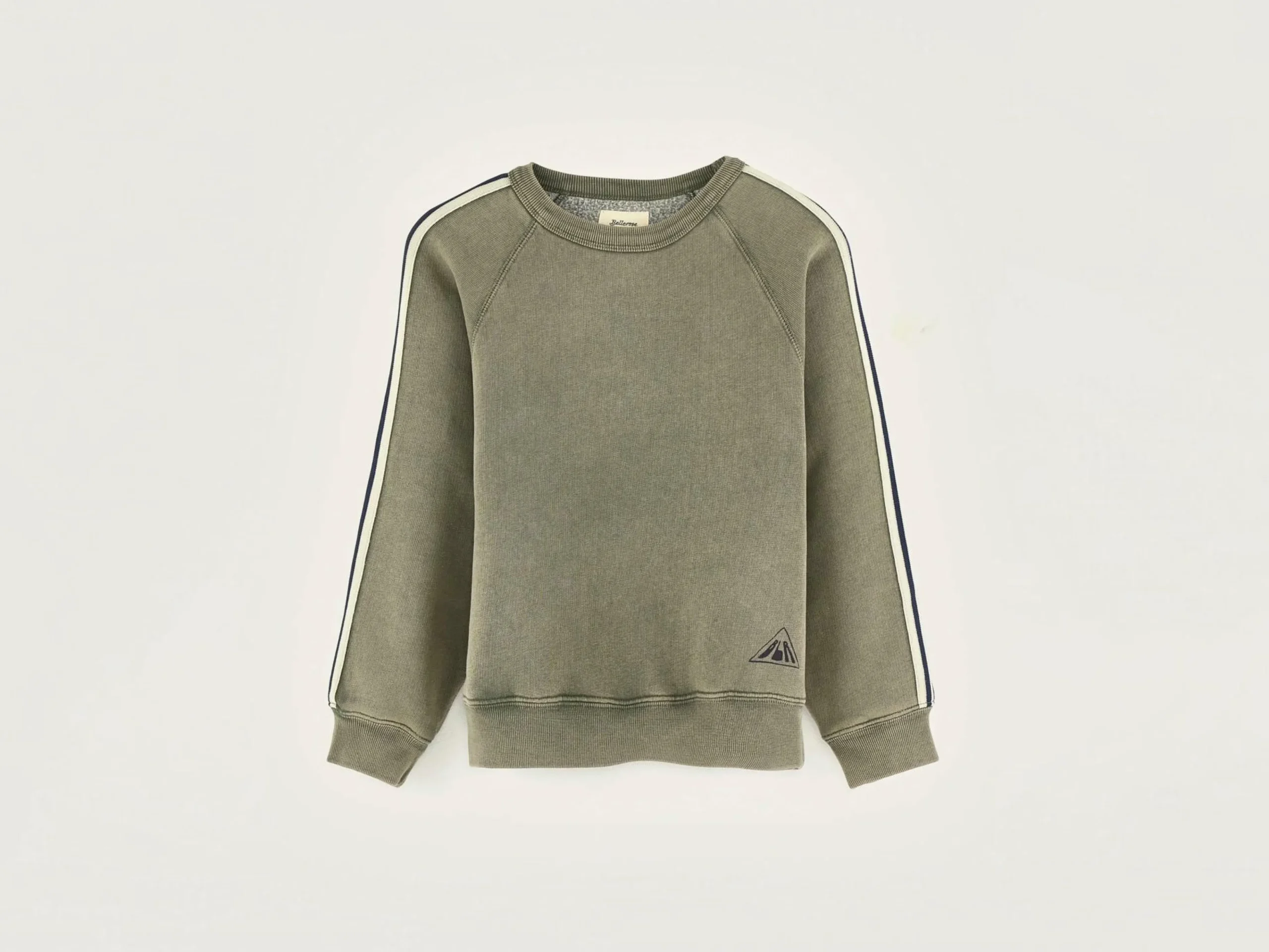 Sweatshirt à col rond, coupe classique, couleur vert mousse et bandes contrastes le long des manches.