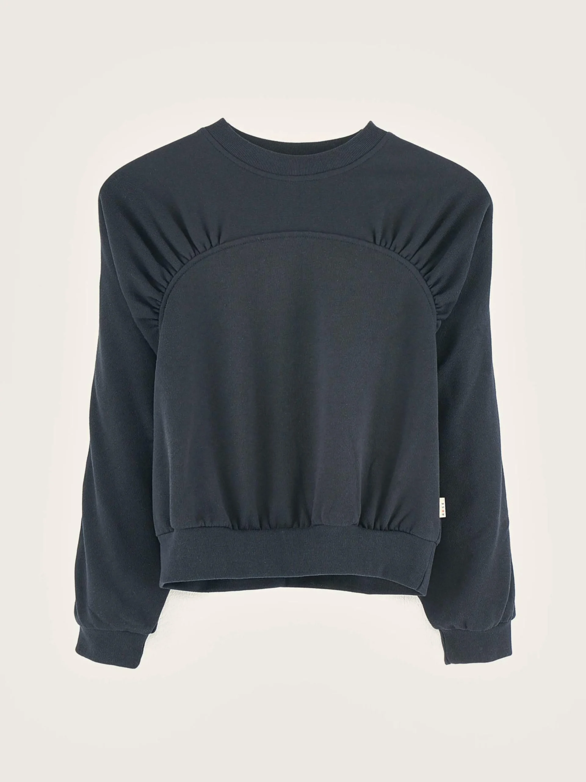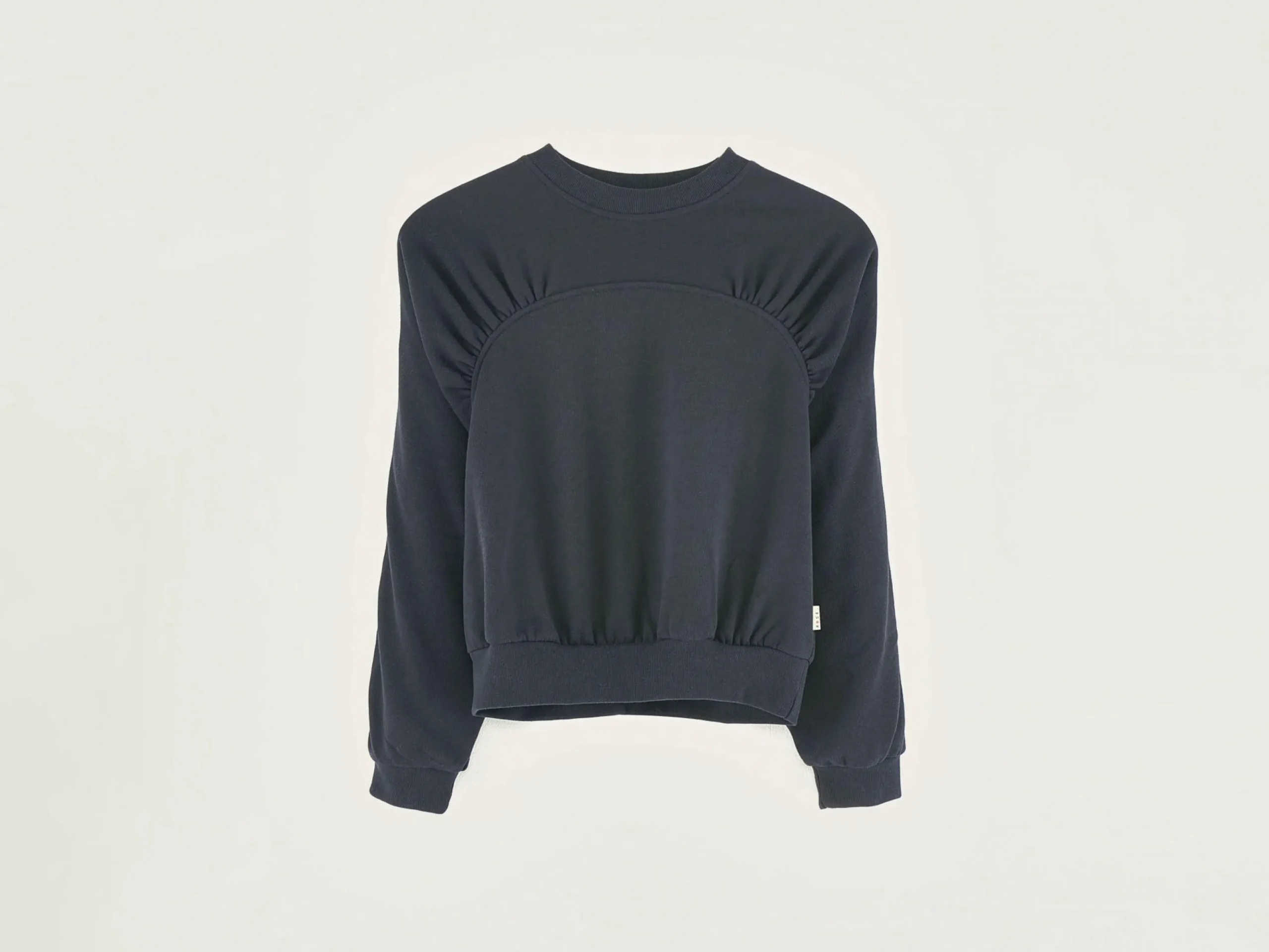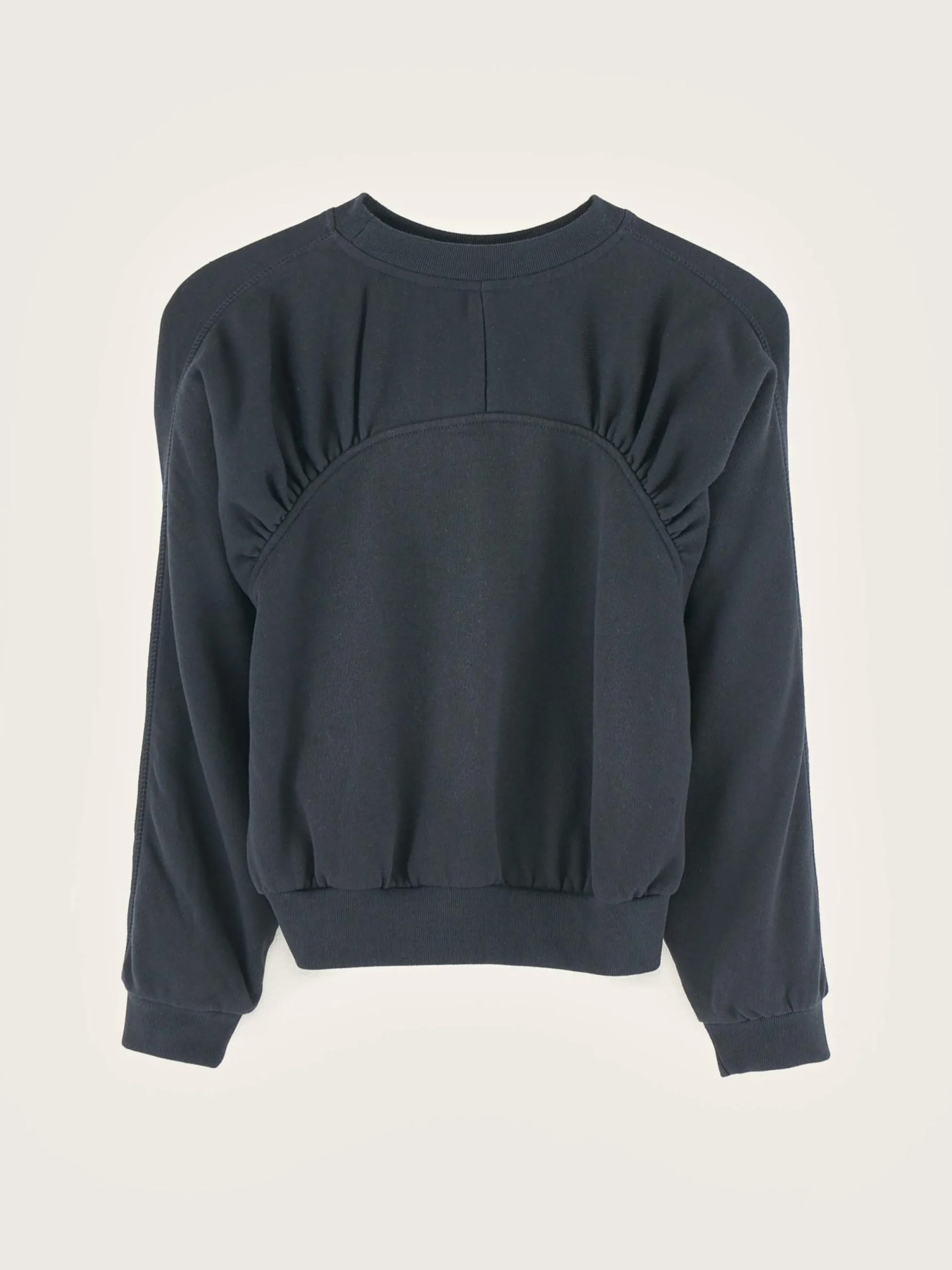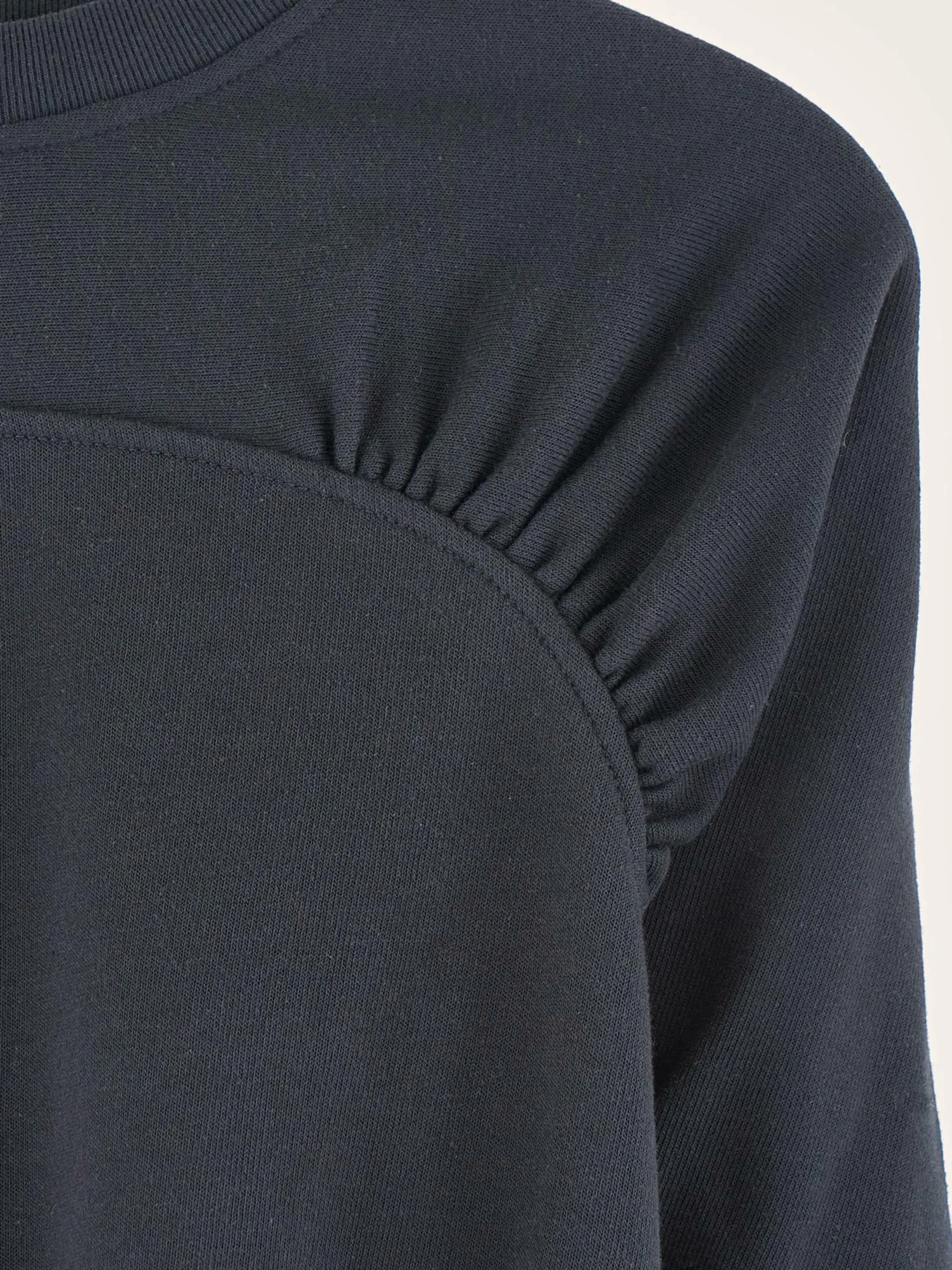 Sweatshirt décontracté en jersey éponge brossé couleur bleu encre avec détails de fronces sur l’avant.