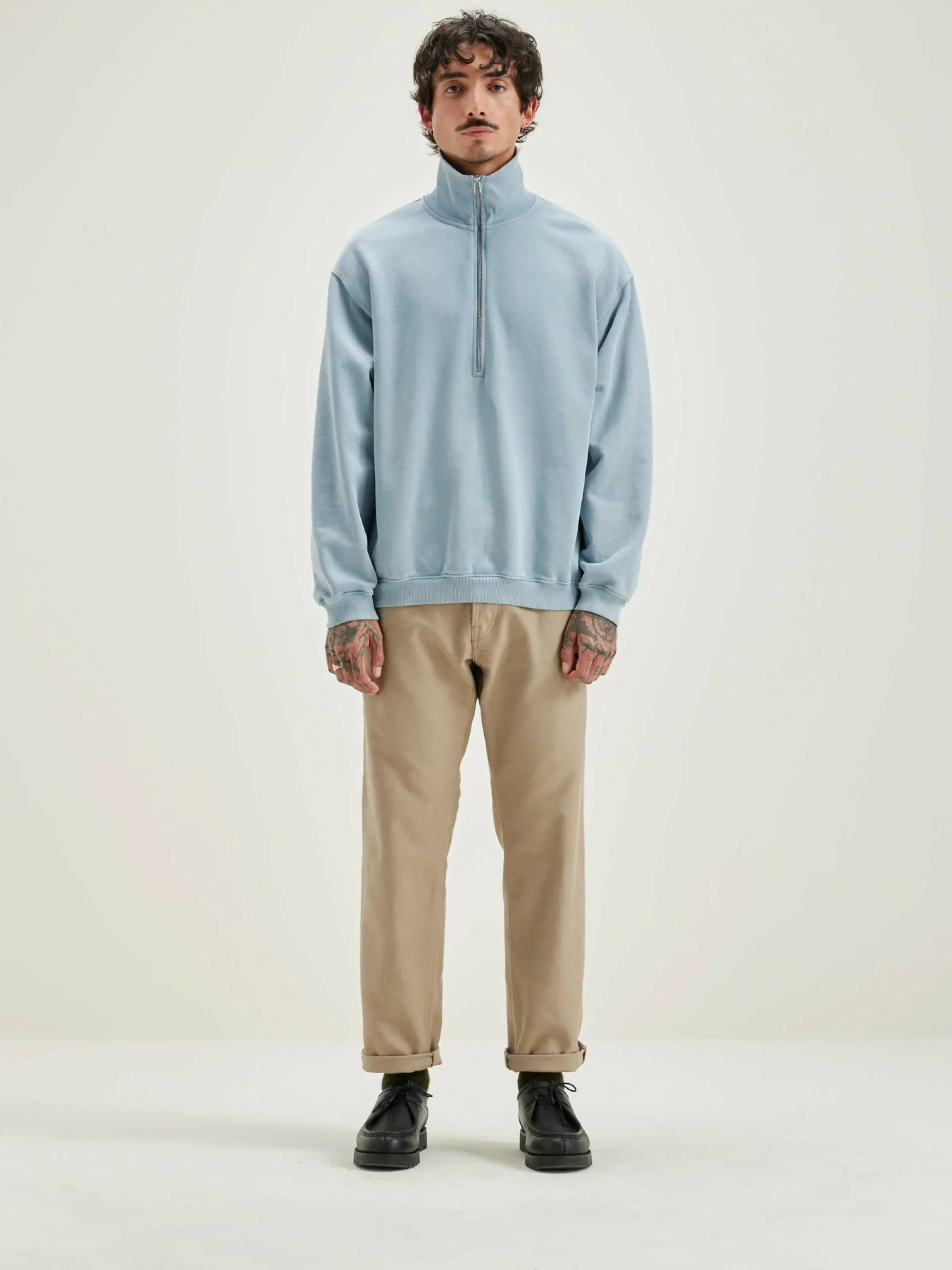 Sweatshirt décontracté à col zippé en jersey de coton bleu chambray.