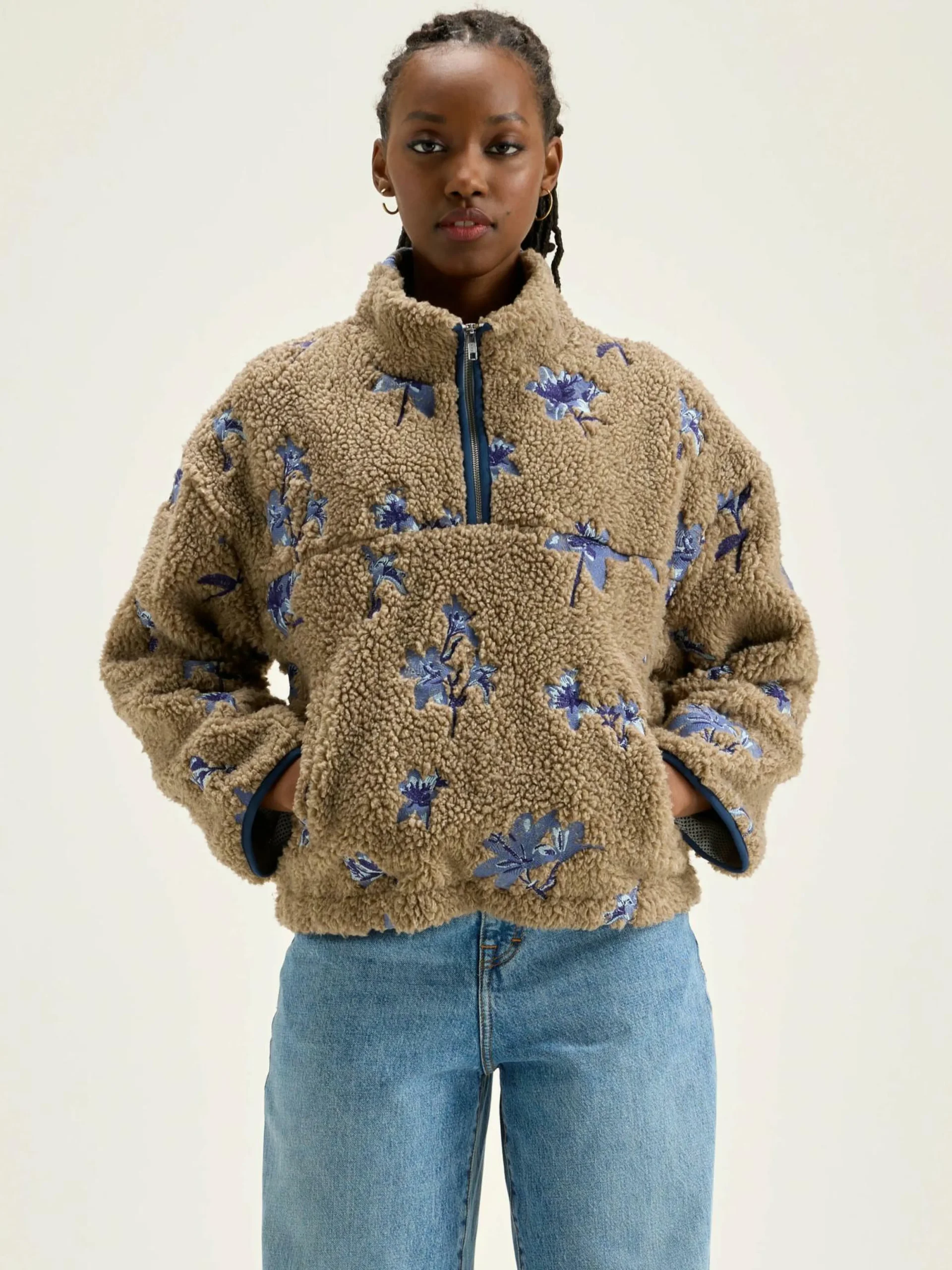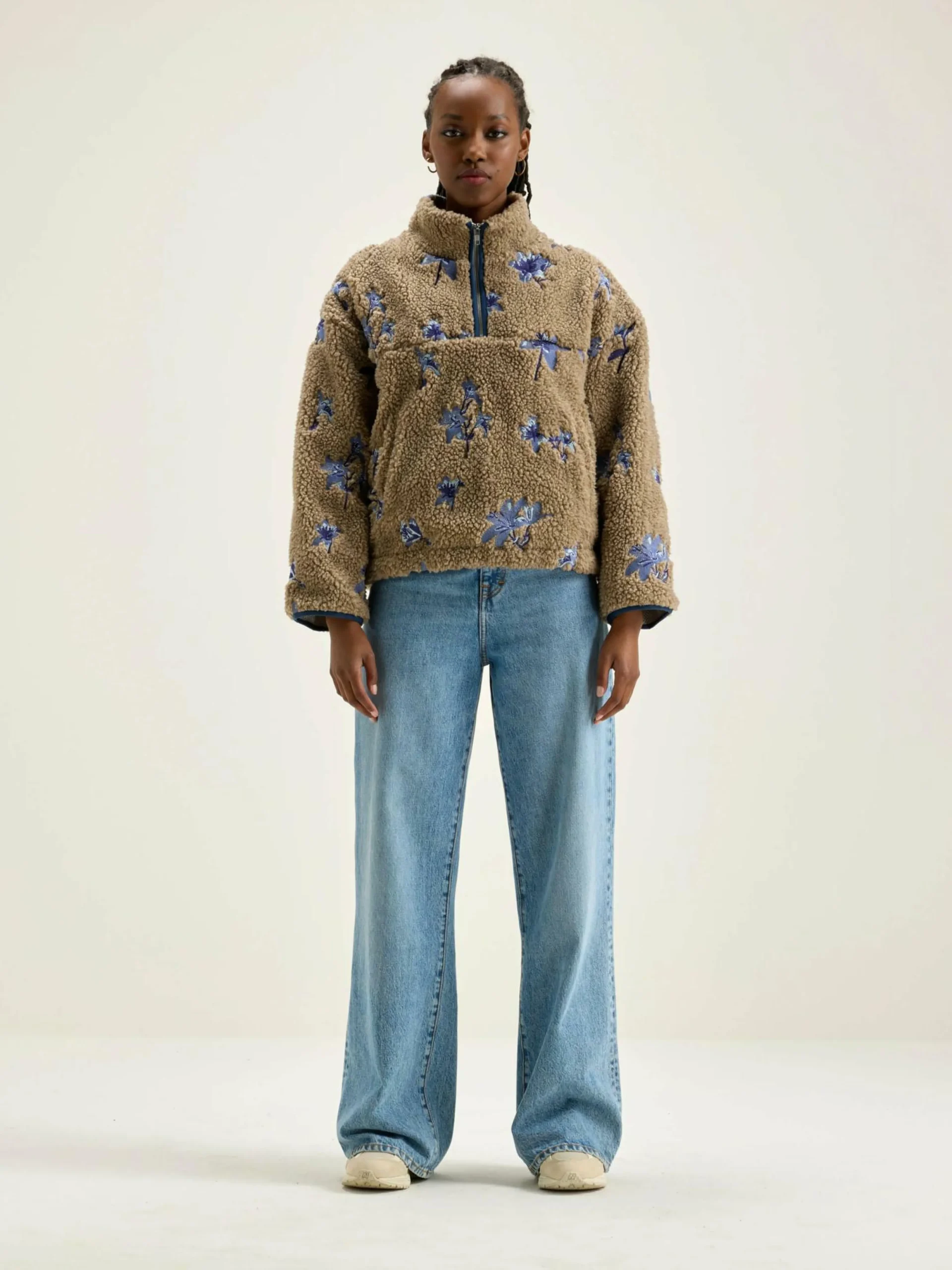 Sweatshirt décontracté en teddy marron rebrodé de fleurs bleues.