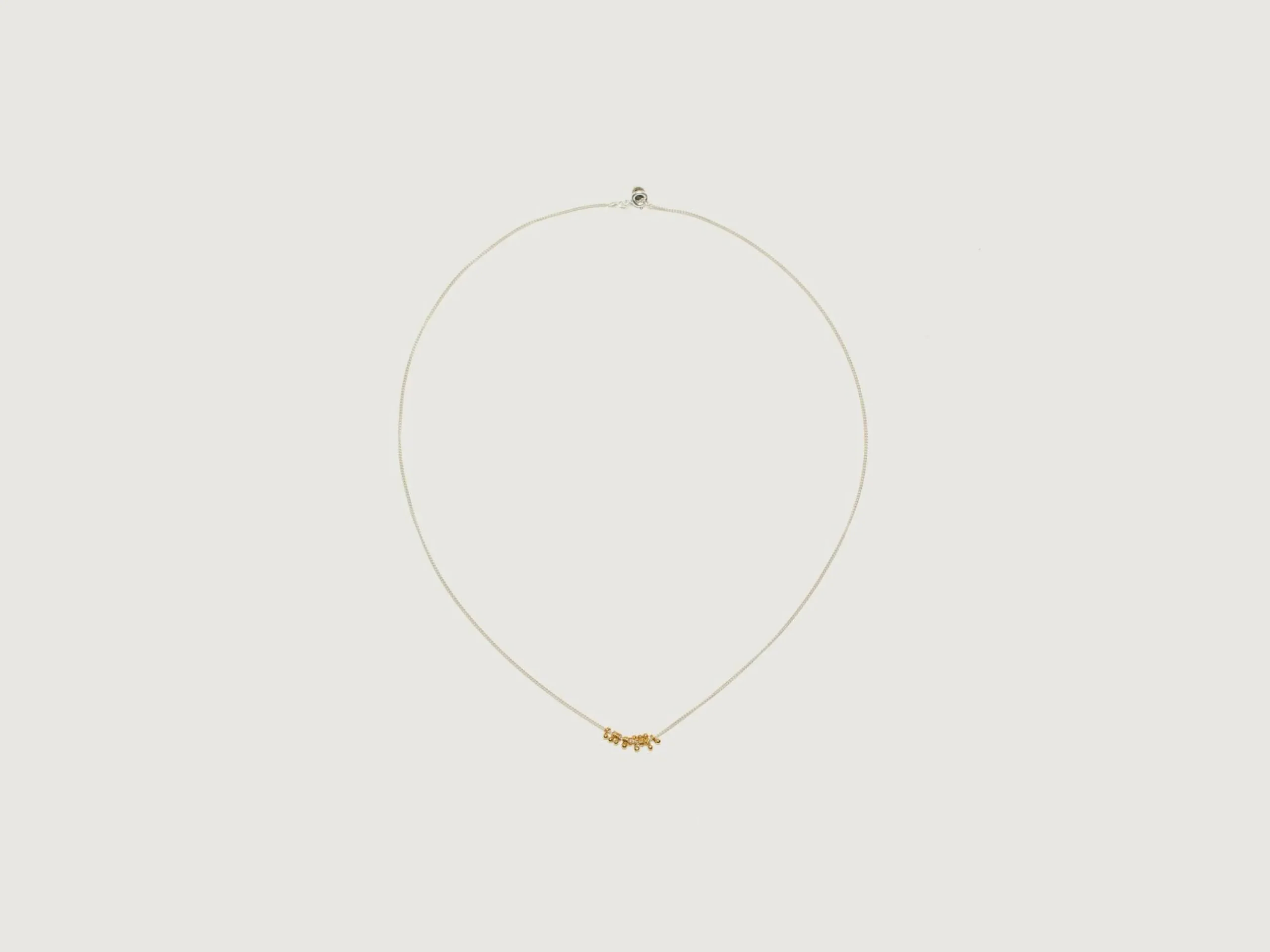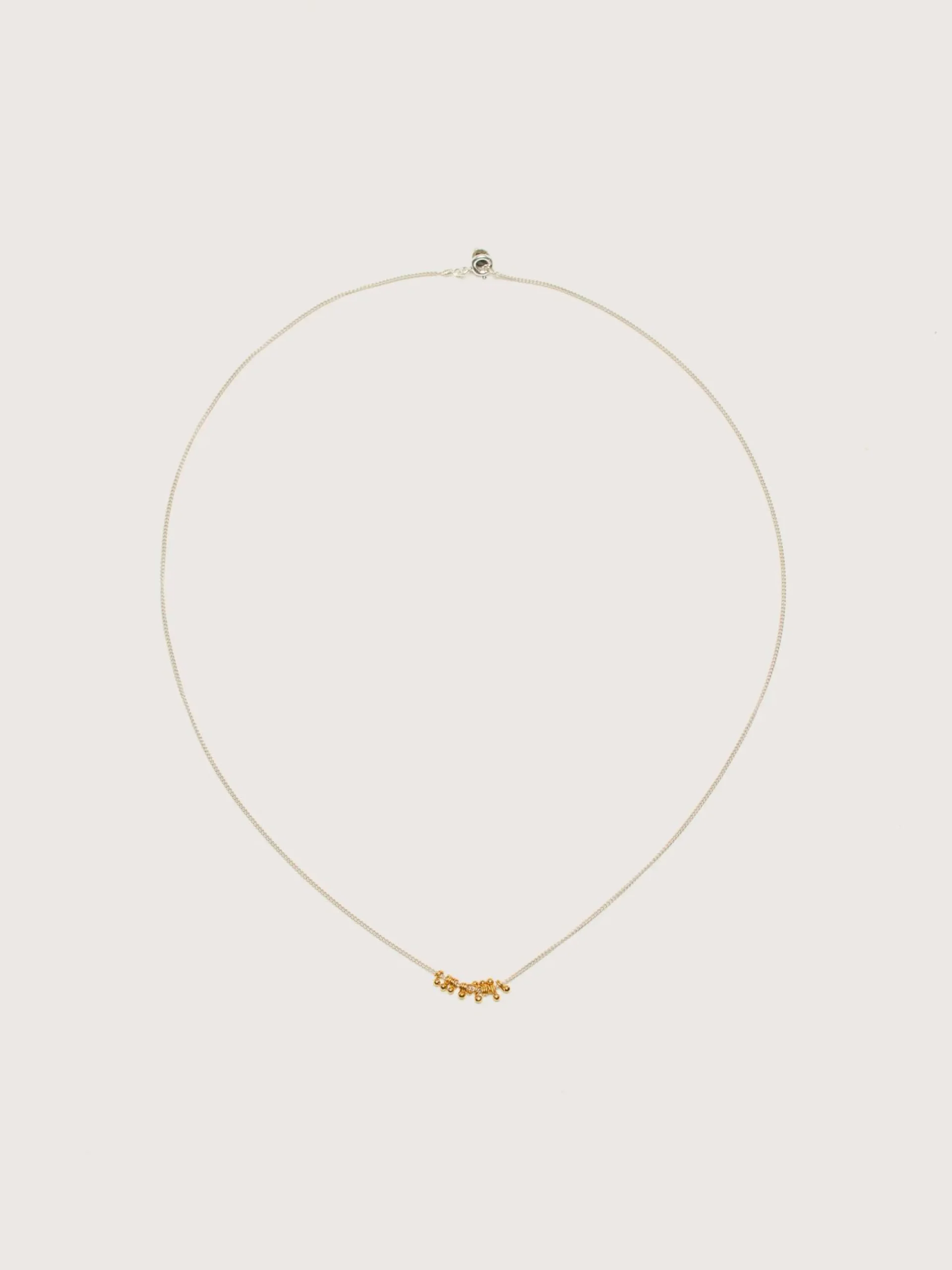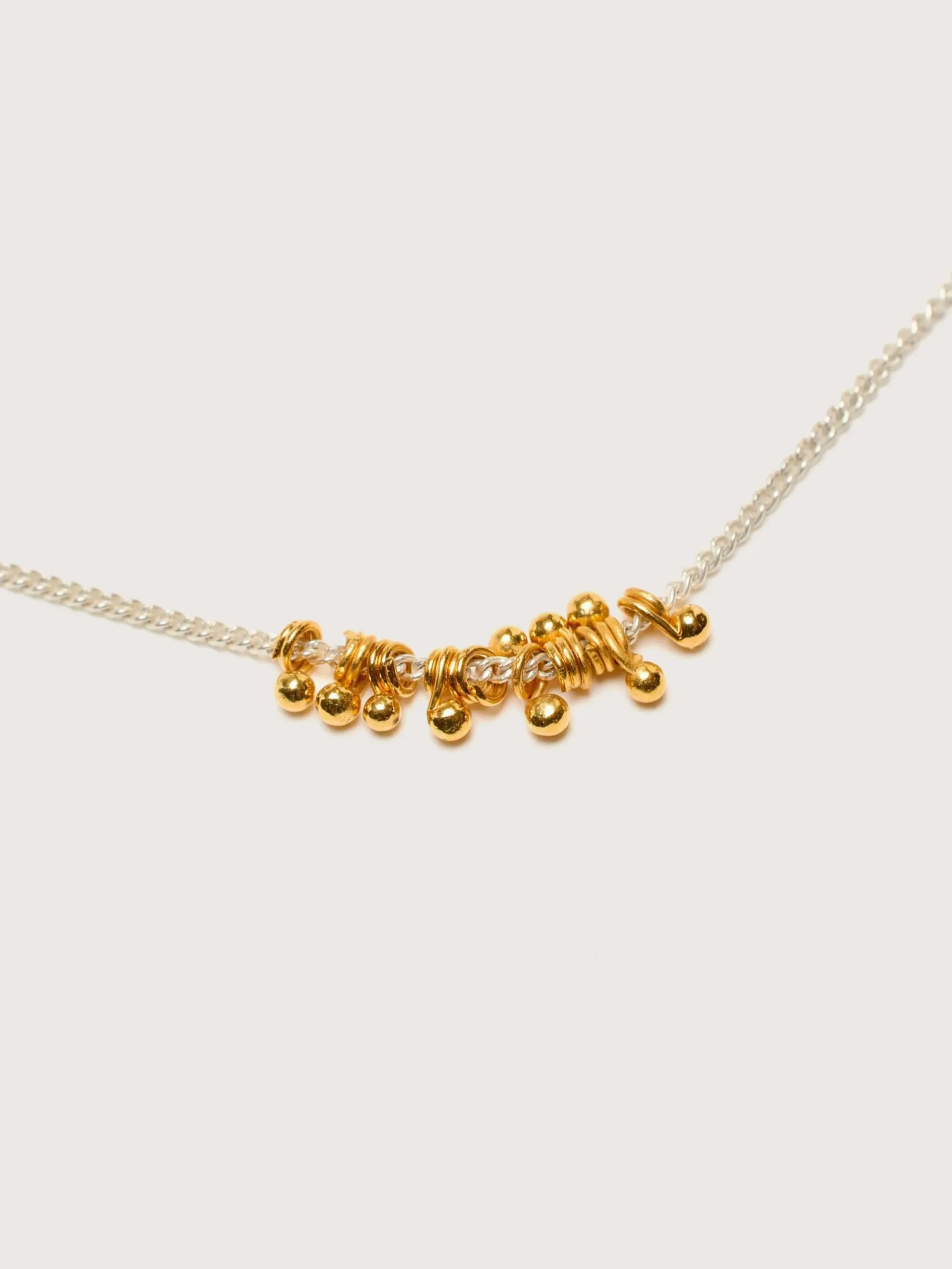 Le collier GilberGilbert Bubble se compose d’une longue chaîne en argent avec des pendentifs en forme de boules dorées.