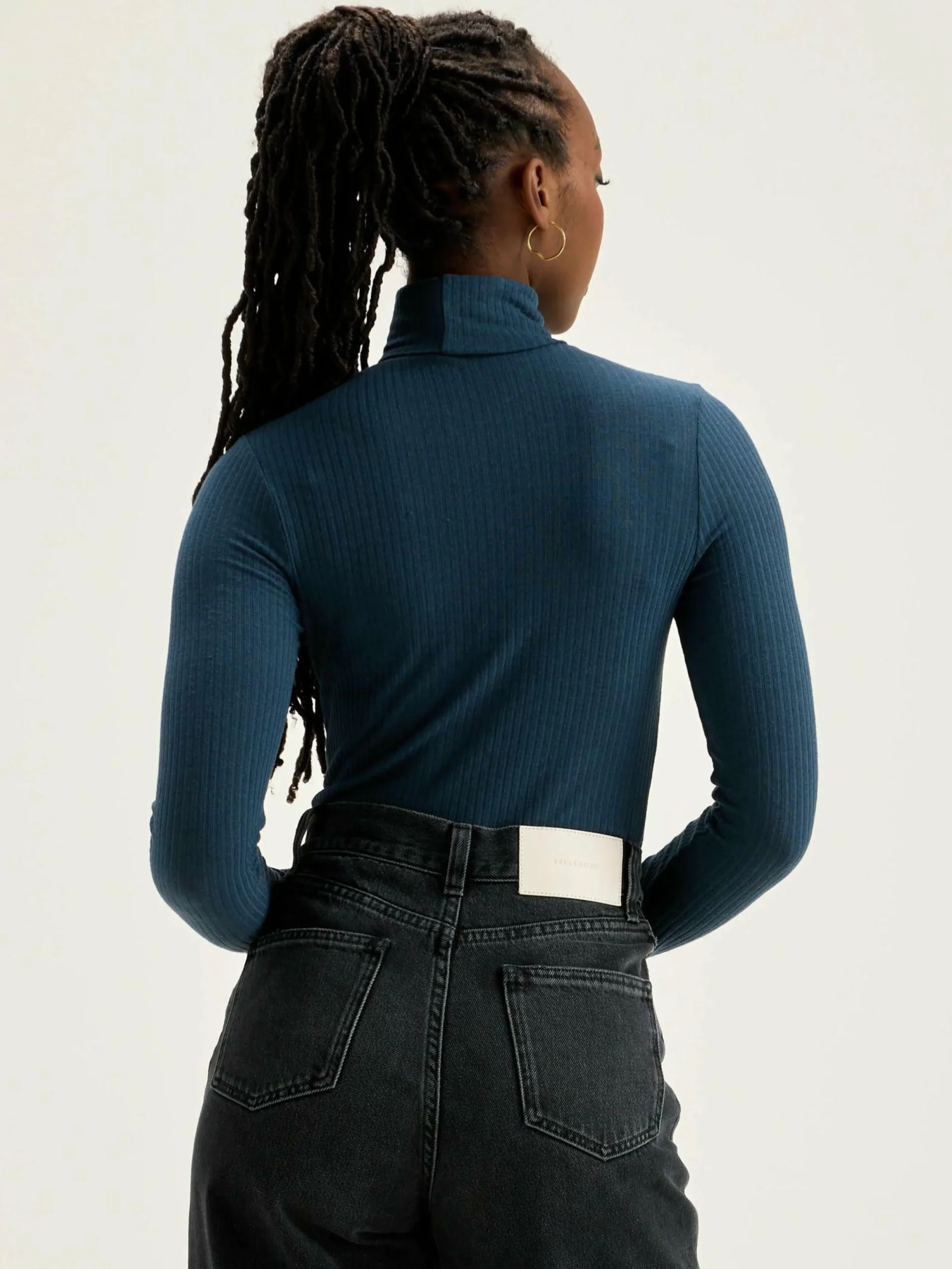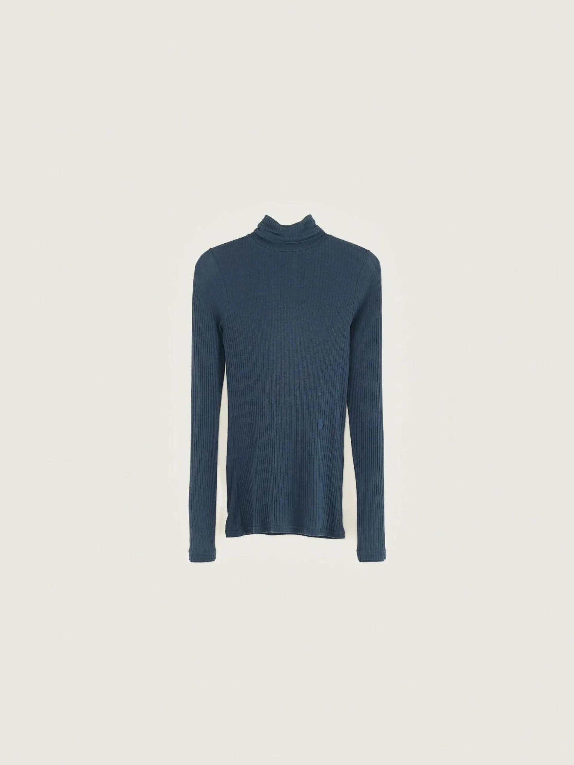 T-shirt en jersey côtelé bleu foncé, coupe slim et col montant twisté.
