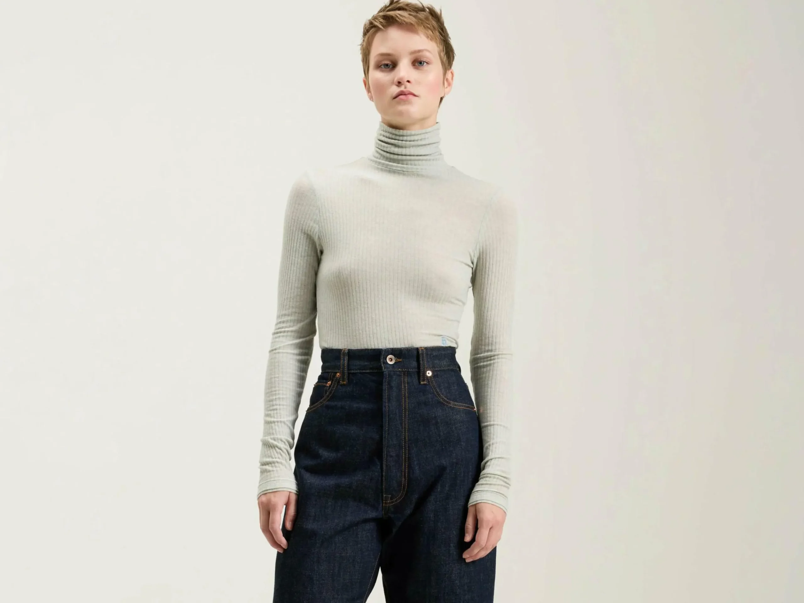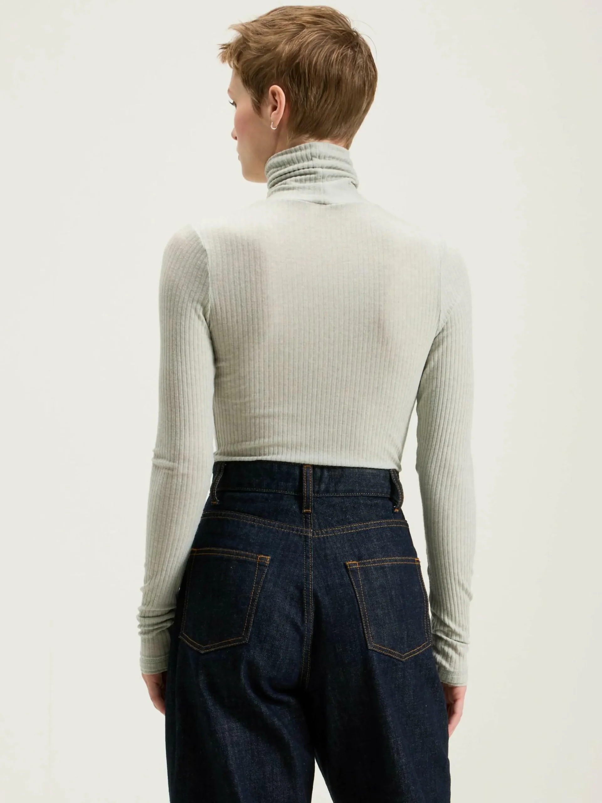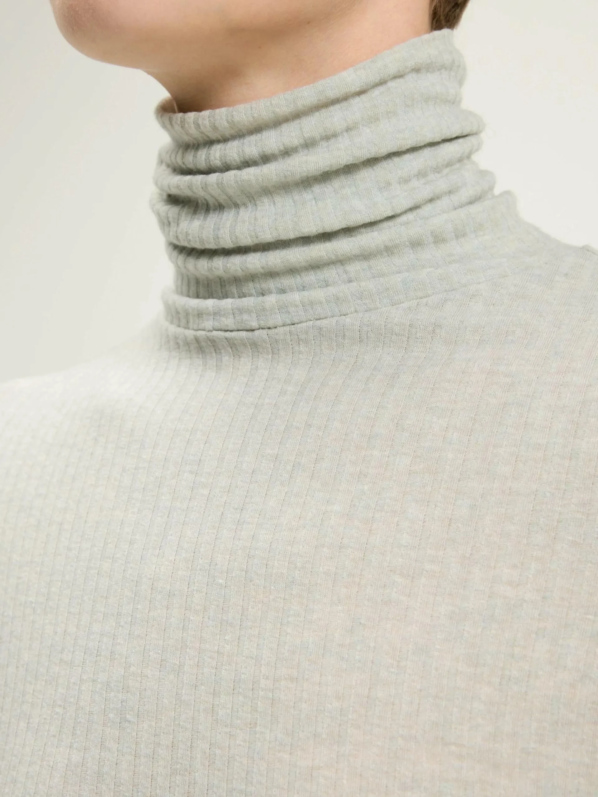 T-shirt en jersey côtelé gris clair, coupe slim et col montant twisté.