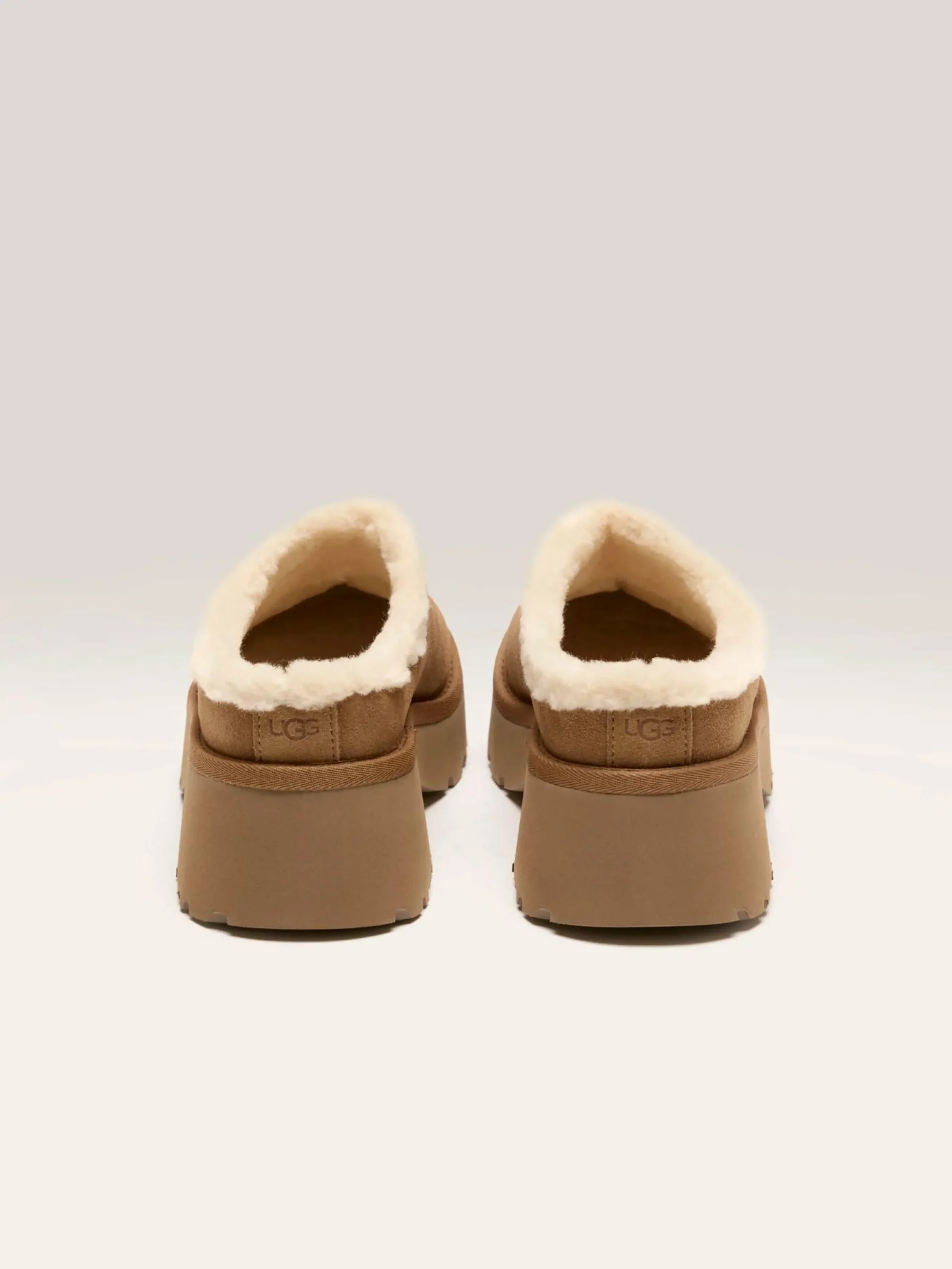 Les sabots UGG New Heights Cozy Clog sont dotés d’une doublure en mélange laine-lyocell recyclée, d’une tige en suède et d’une semelle légère en EVA.