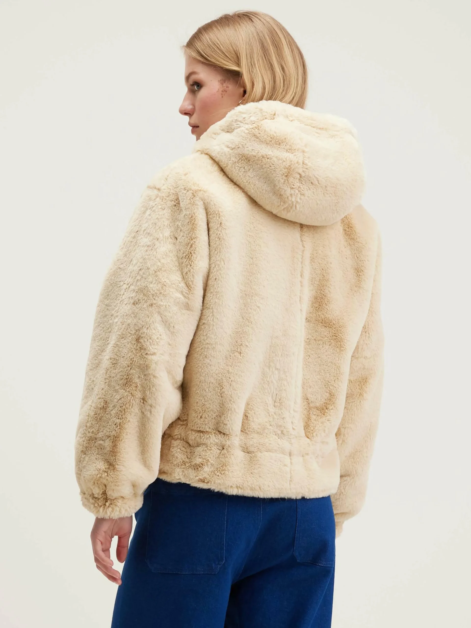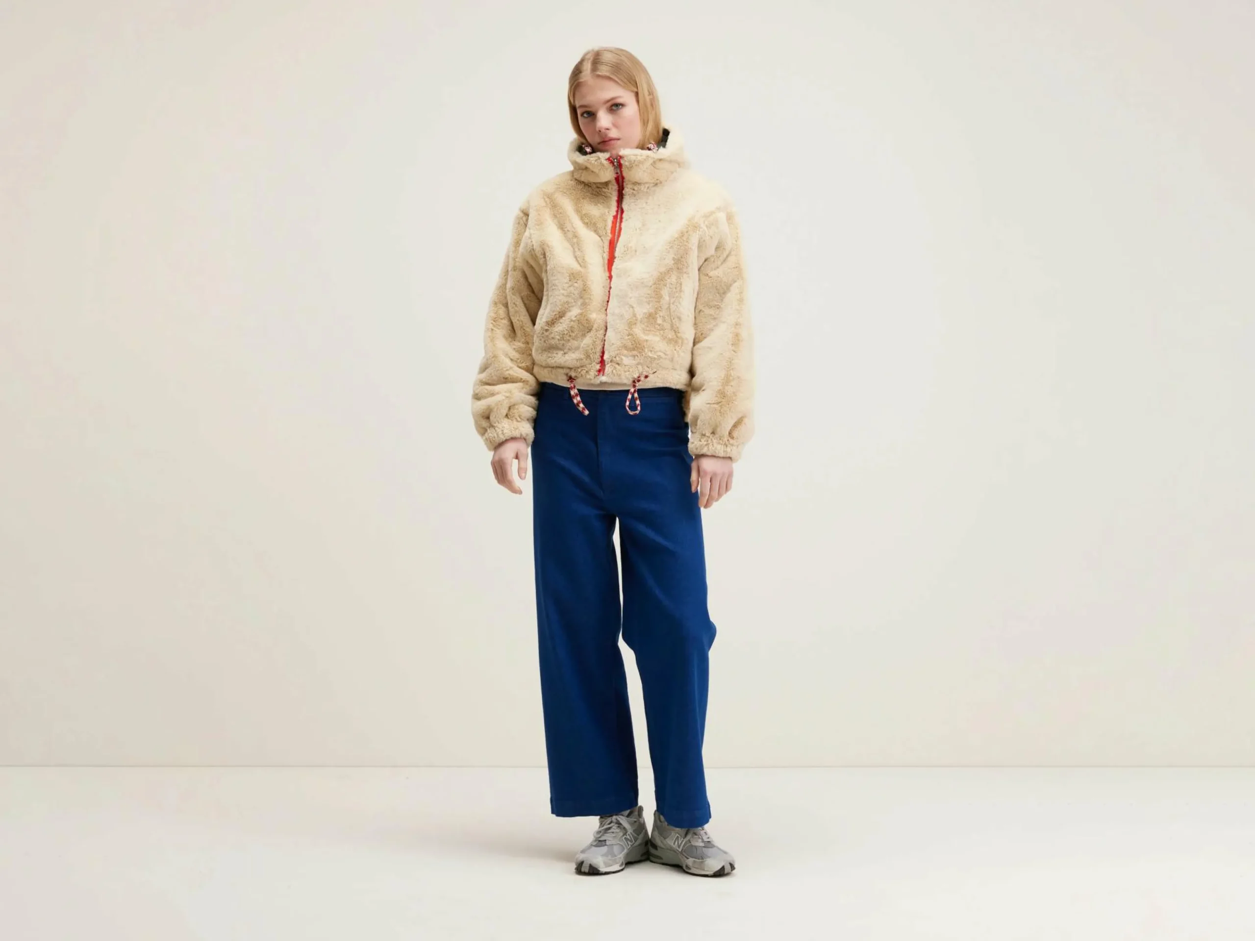 Veste à capuche réversible en toile bleu marine avec capuche et doublure en fausse fourrure écrue.