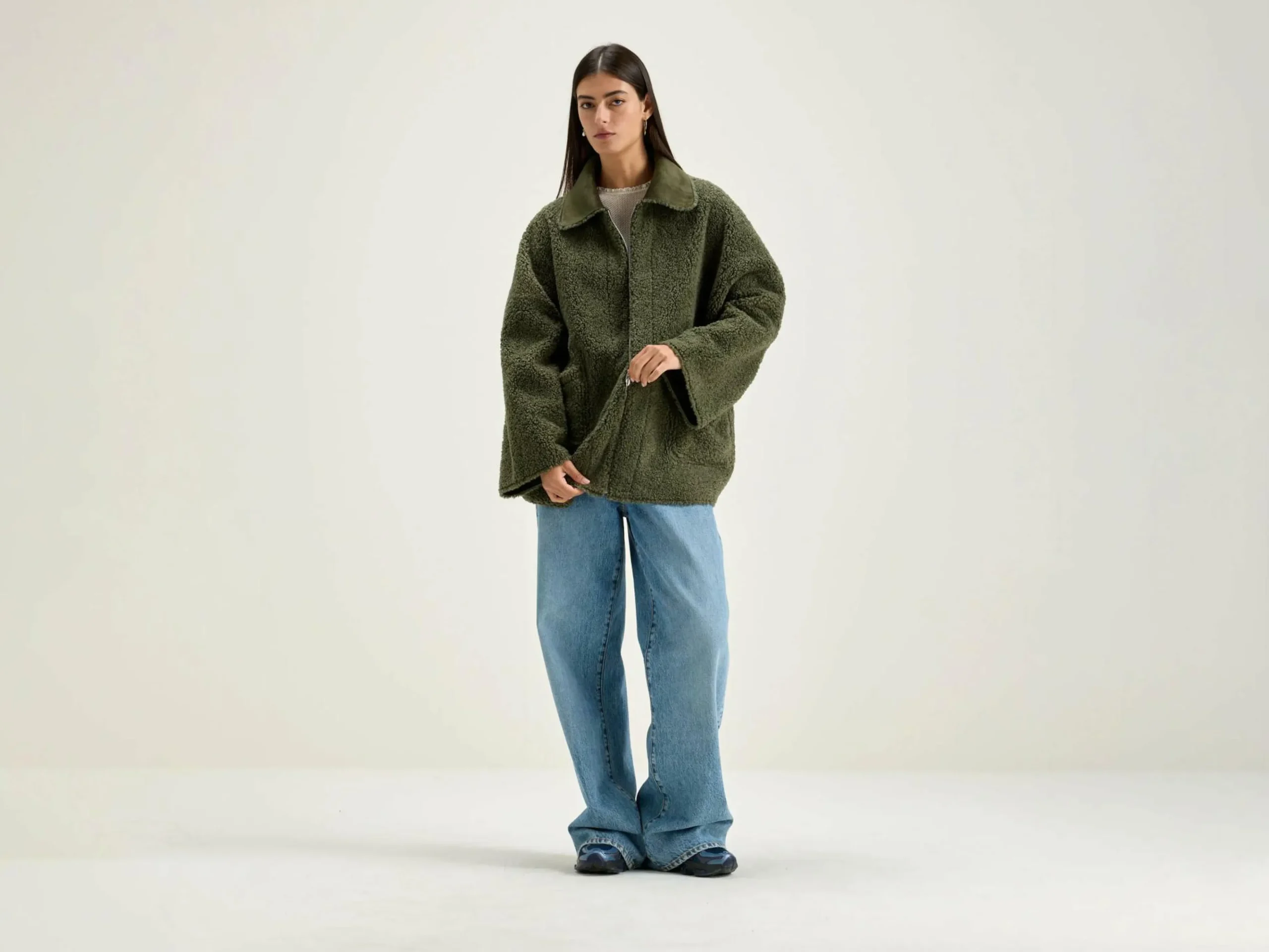 Veste oversize et réversible, style chemise et fermeture par zip avant, poches plaquées et col classique.
