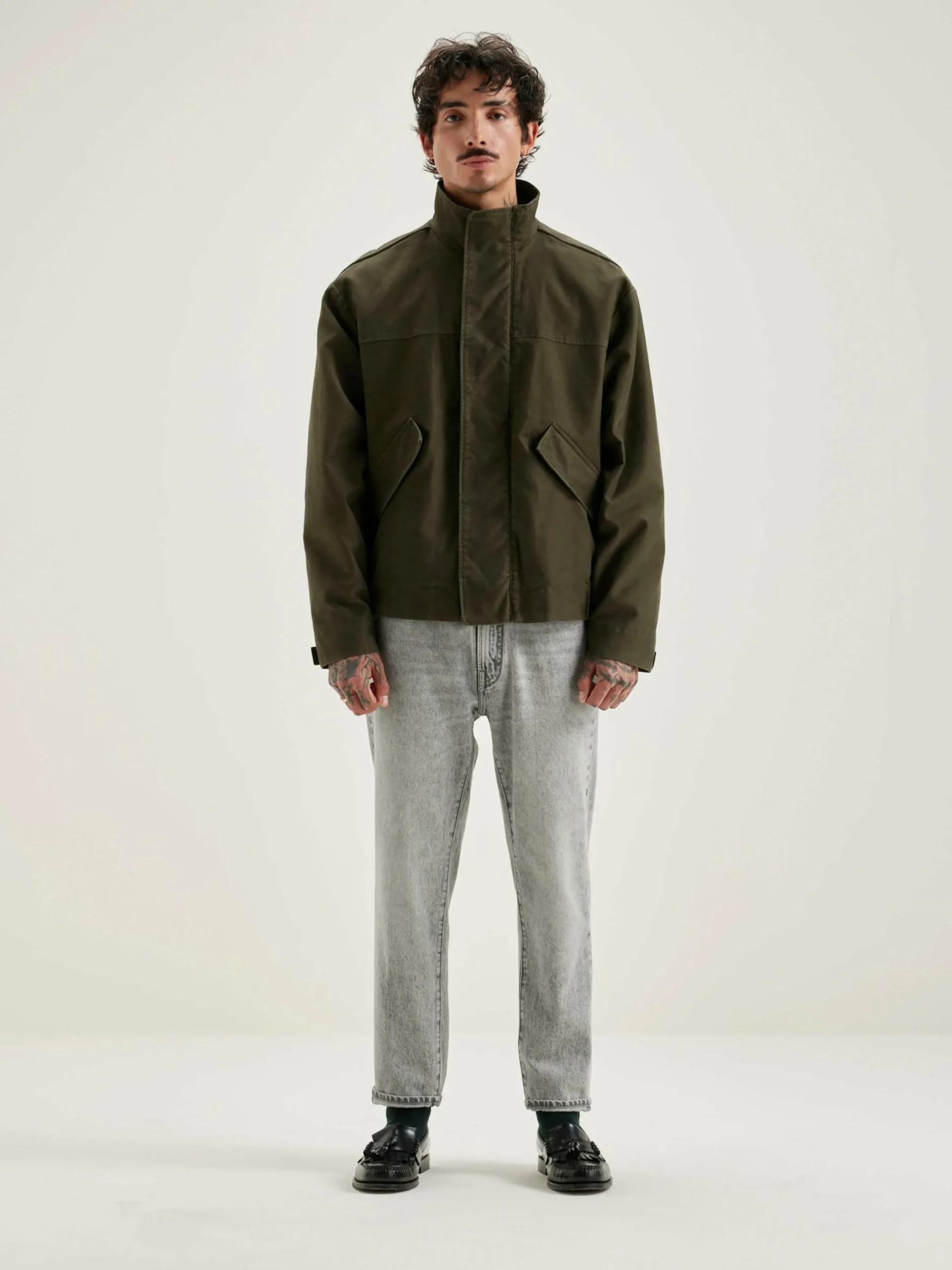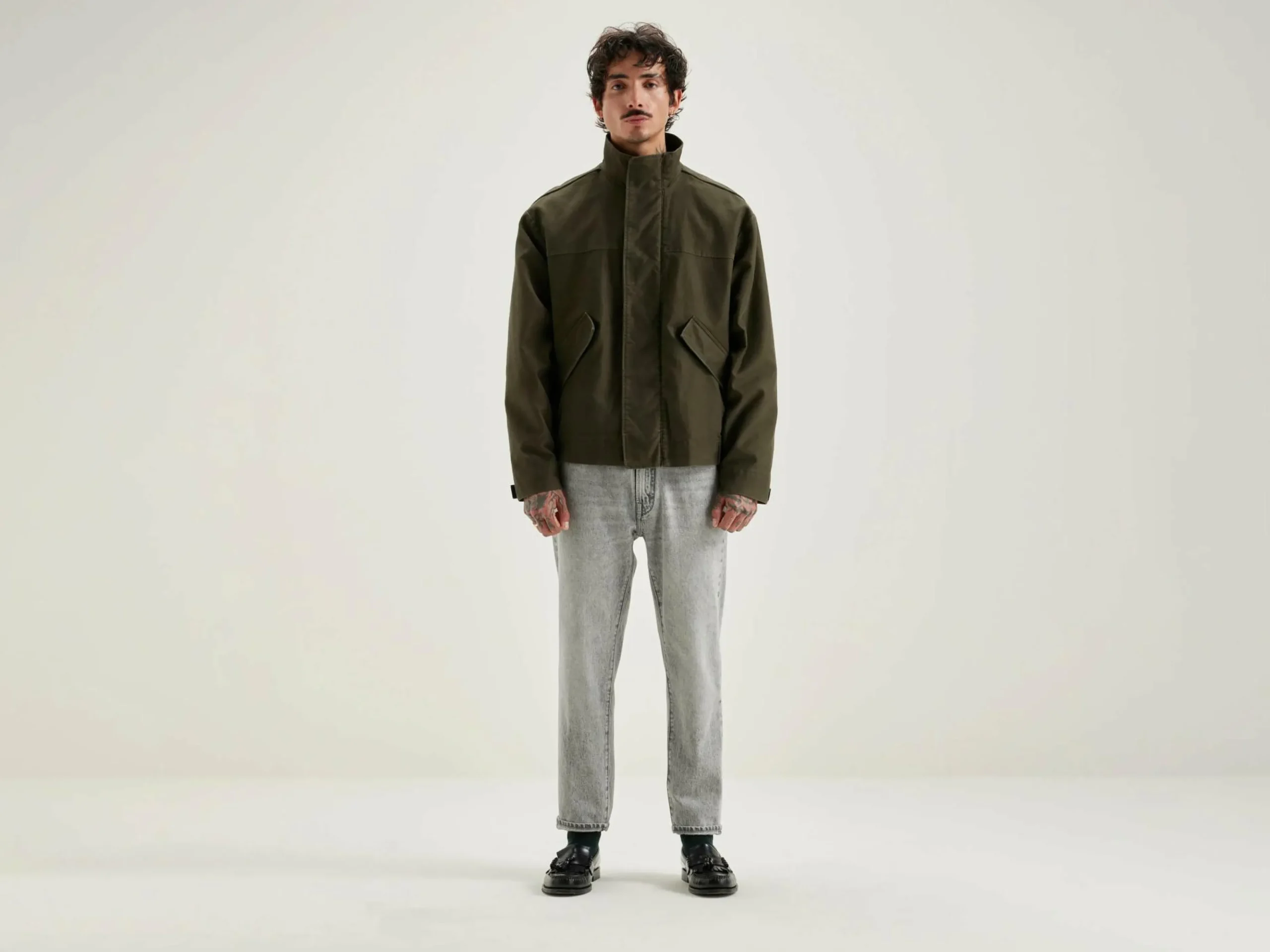 Veste oversize en moleskine de coton vert foncé et détails de velcros décalés.
