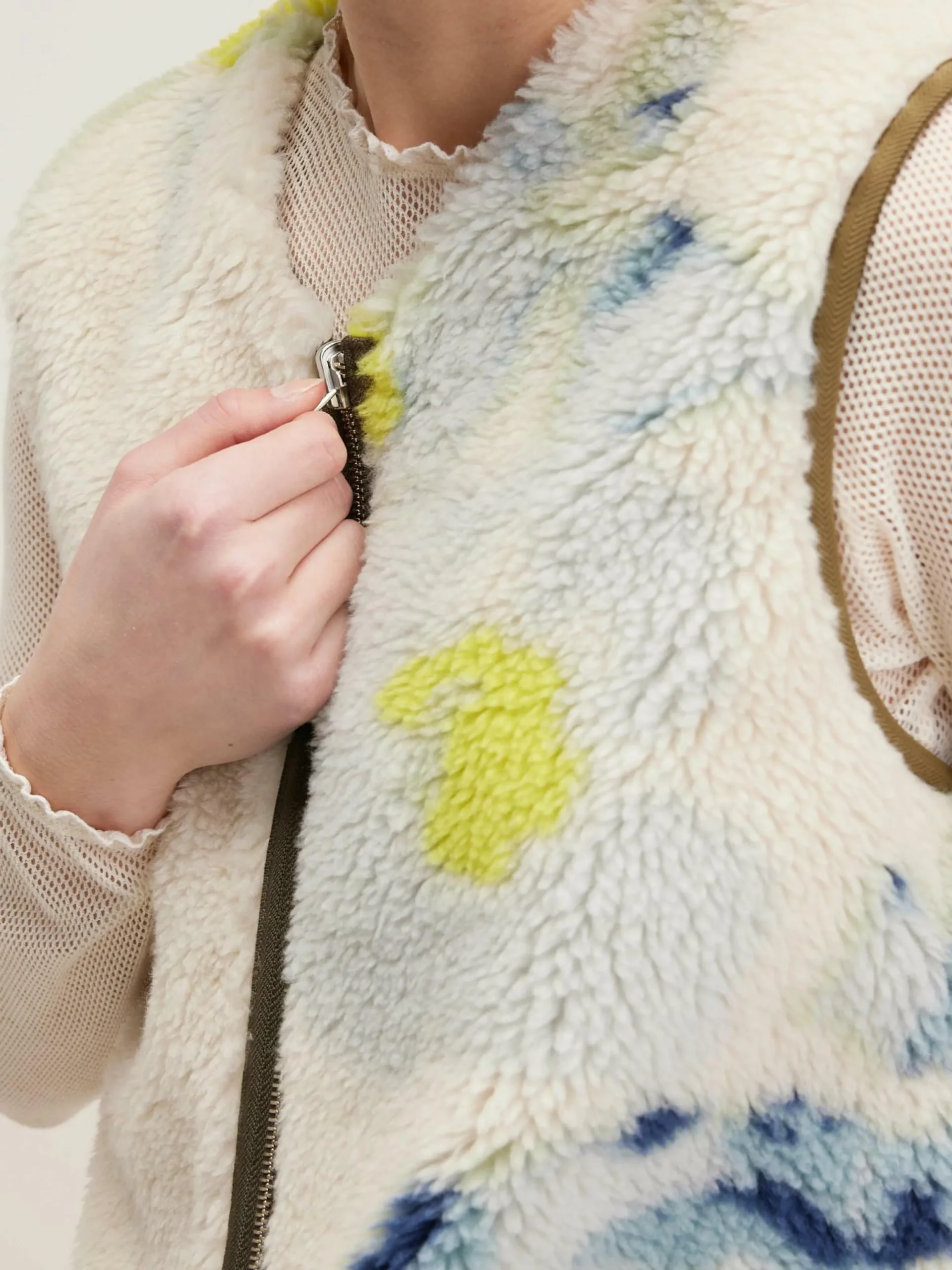 Surchemise réversible avec un côté satiné vert militaire et l’autre en fausse fourrure imprimée de fleurs géantes.