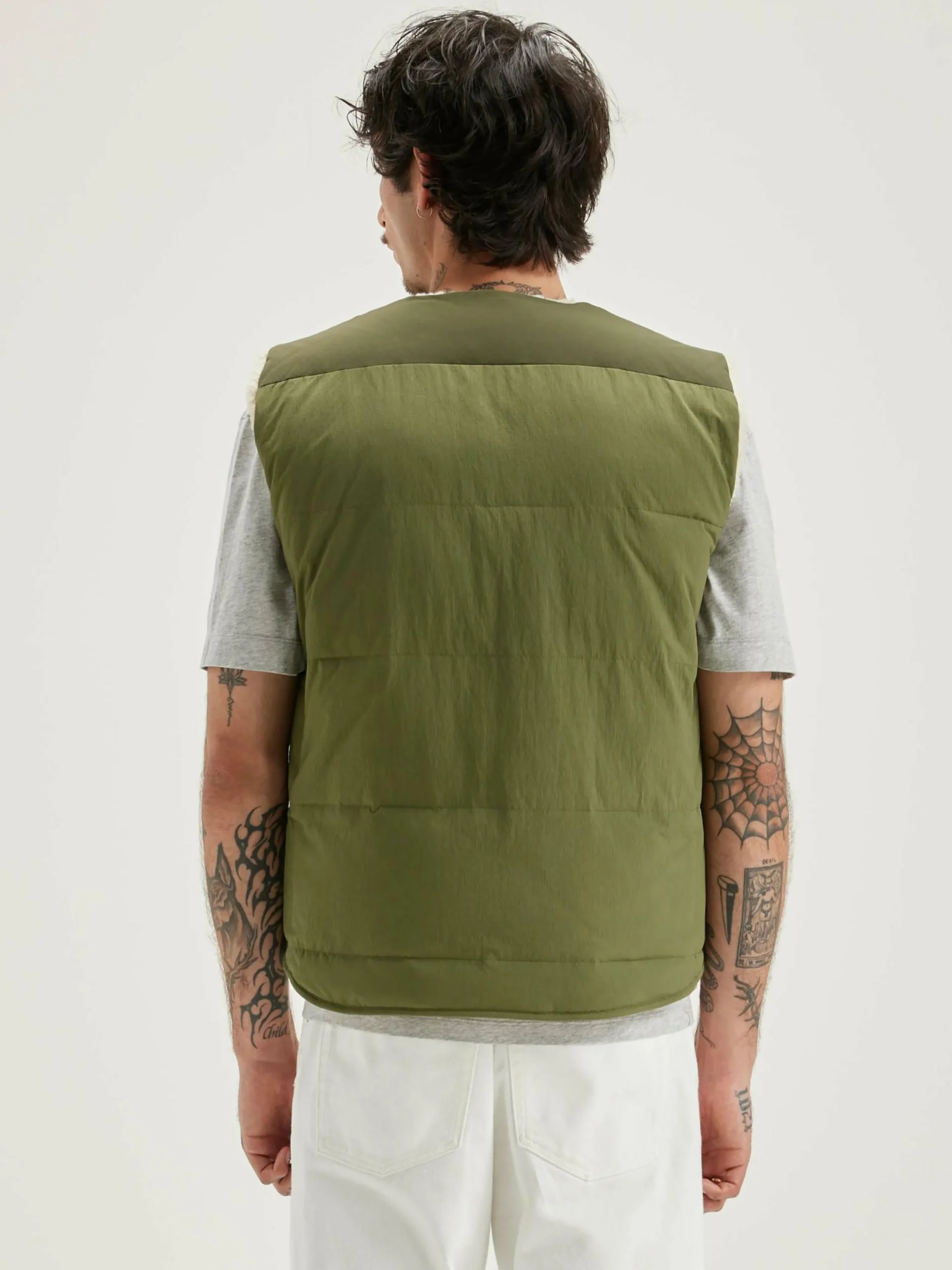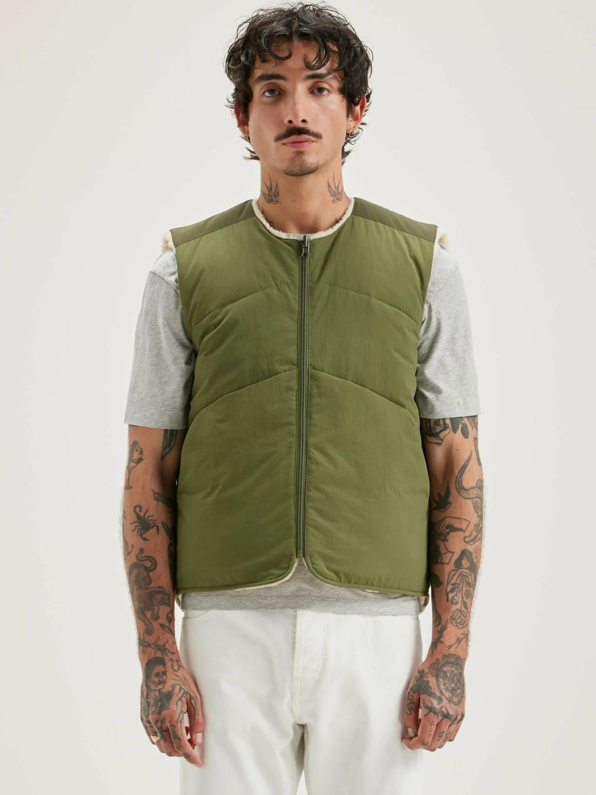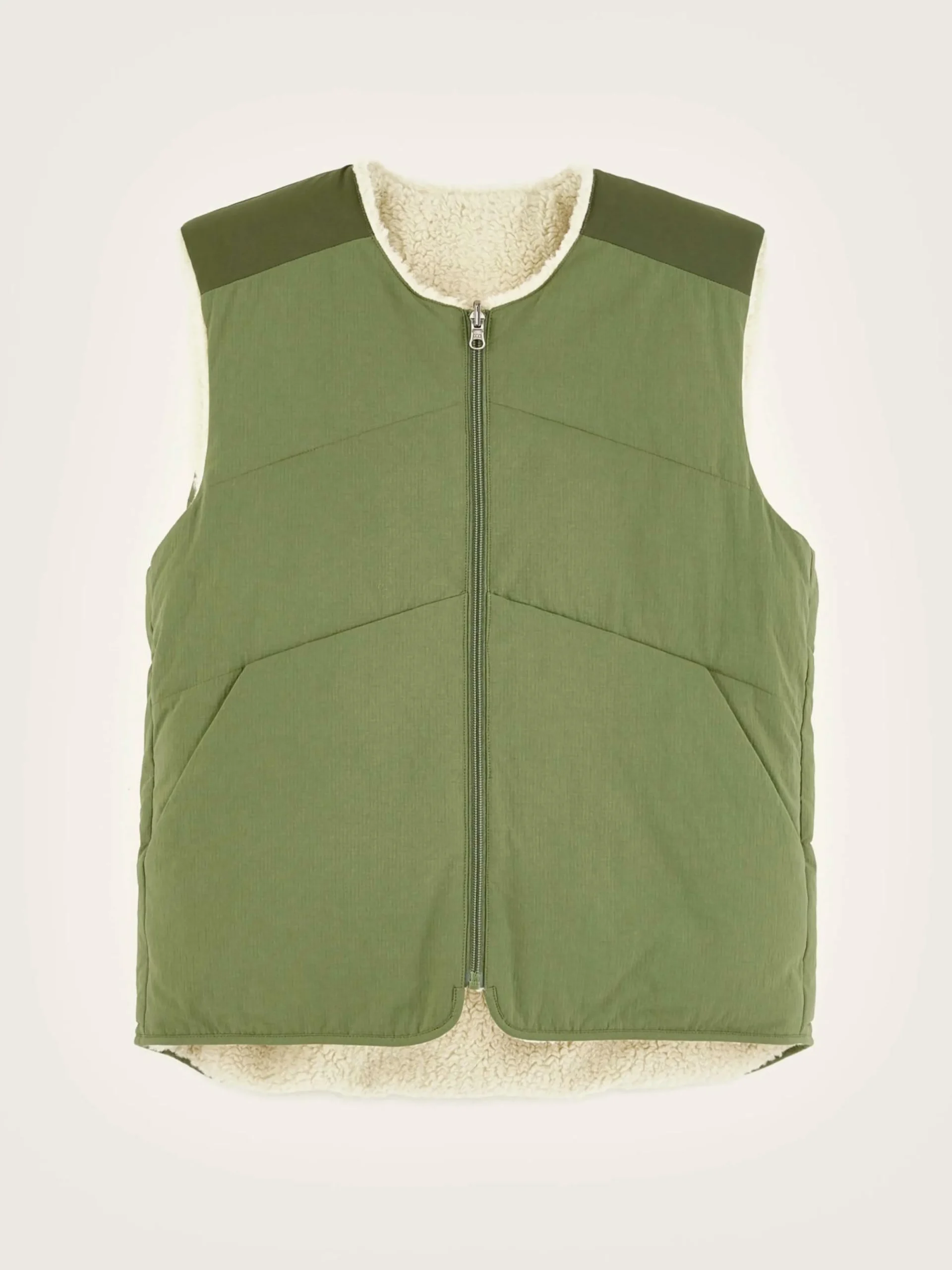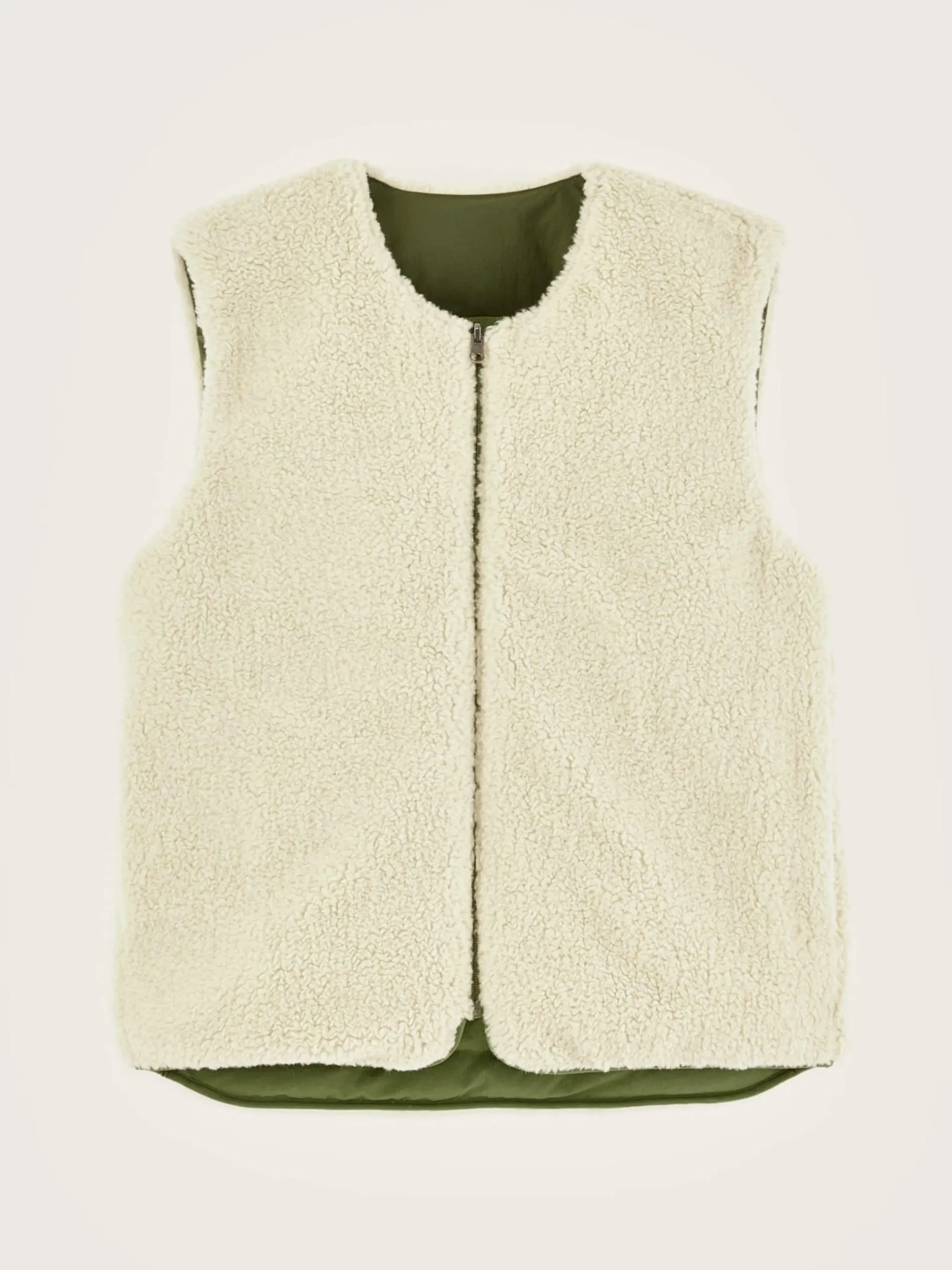 Bodywarmer zippé réversible en polyester couleur vert militaire et doublé en teddy écru.
