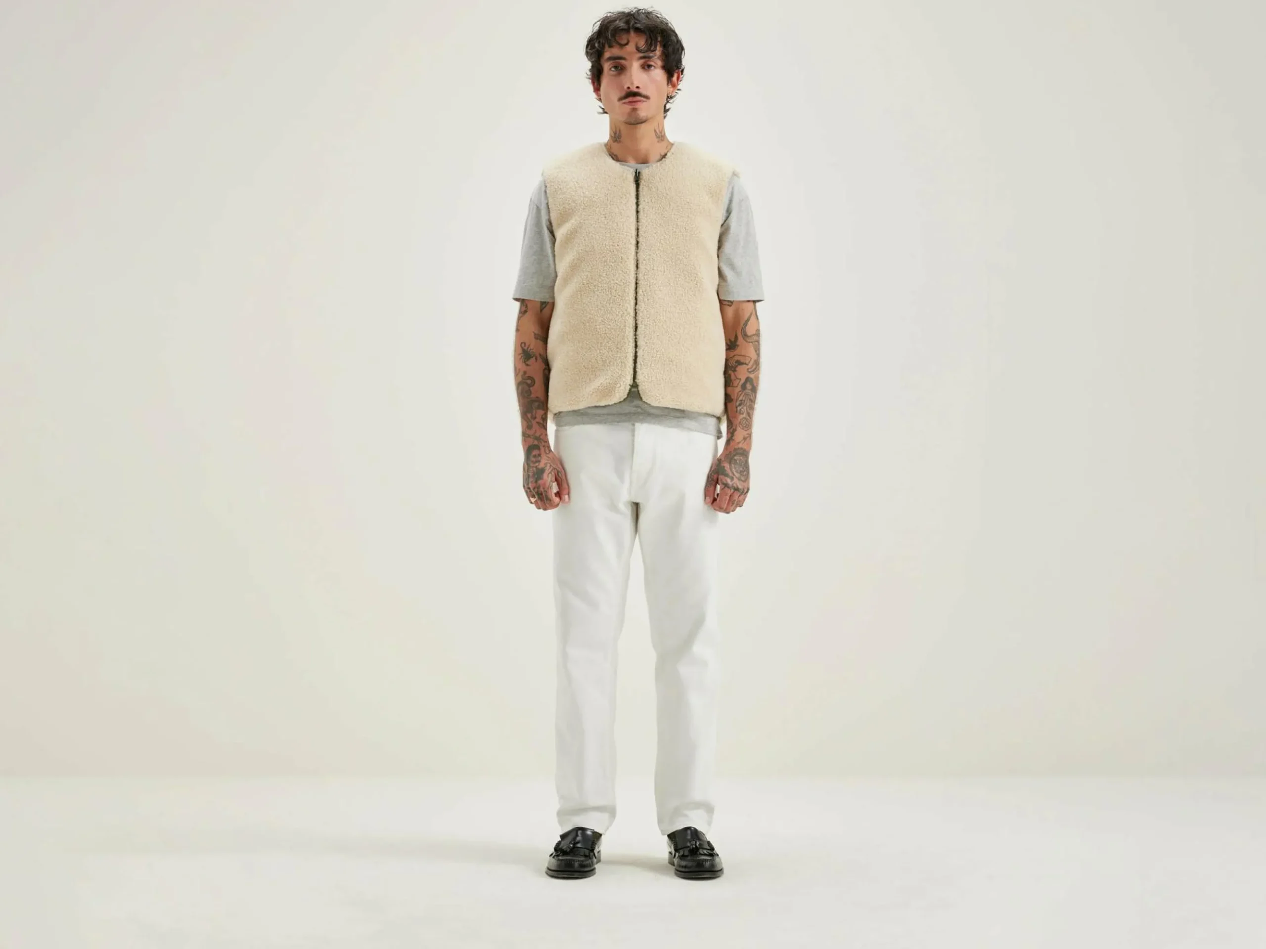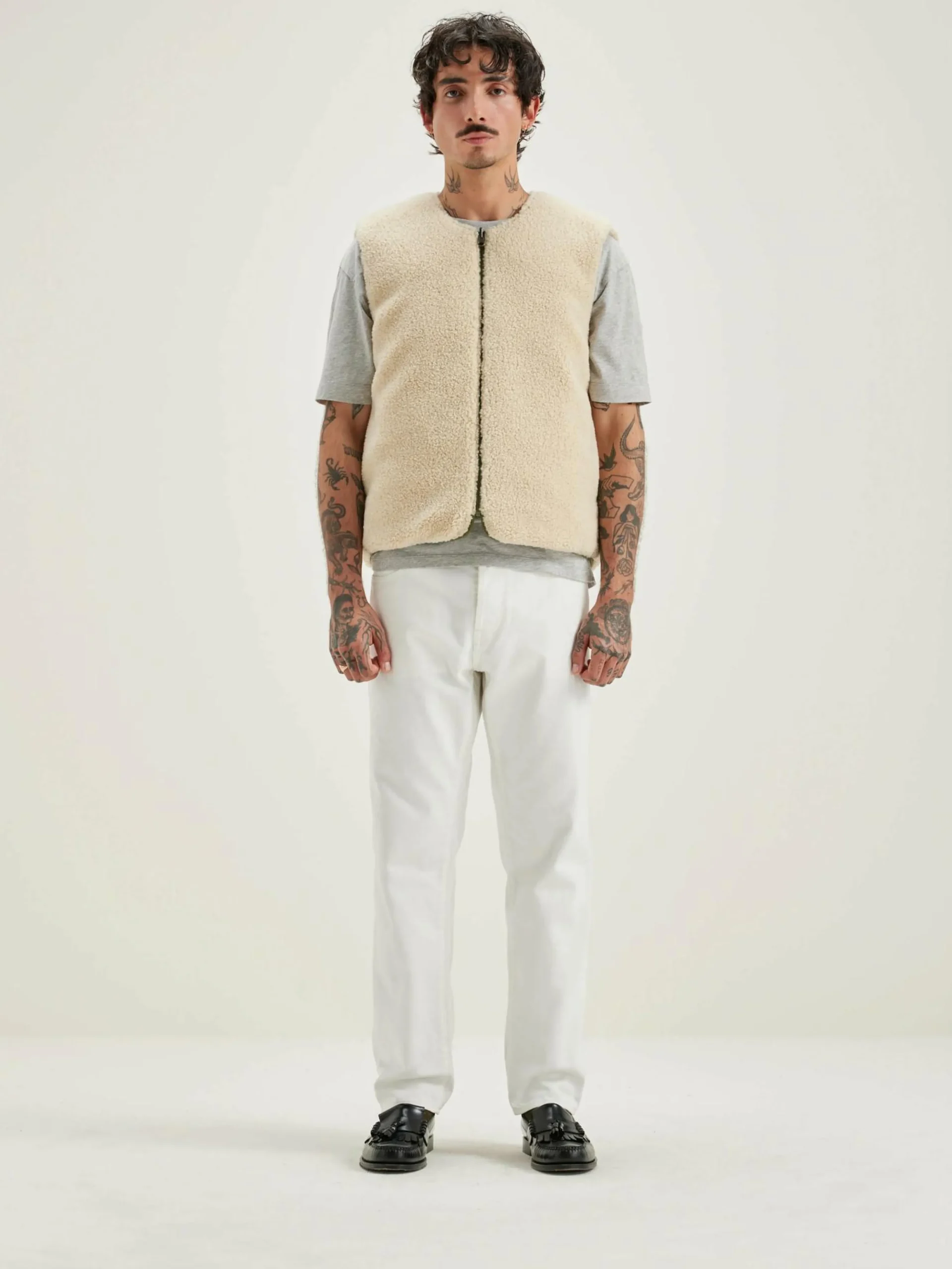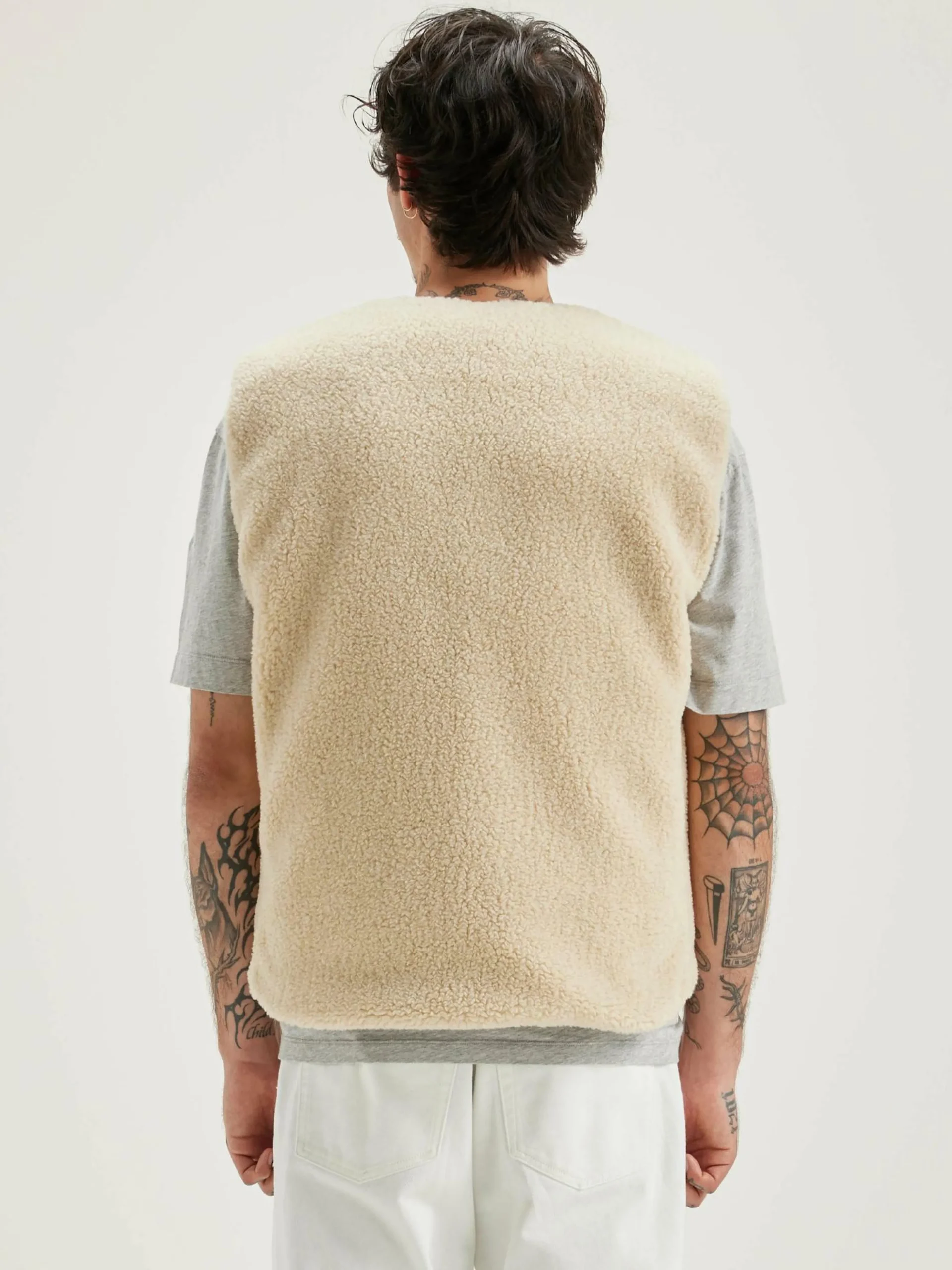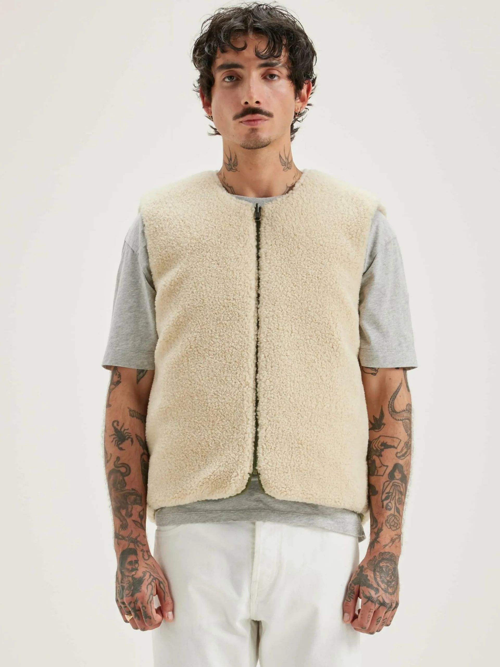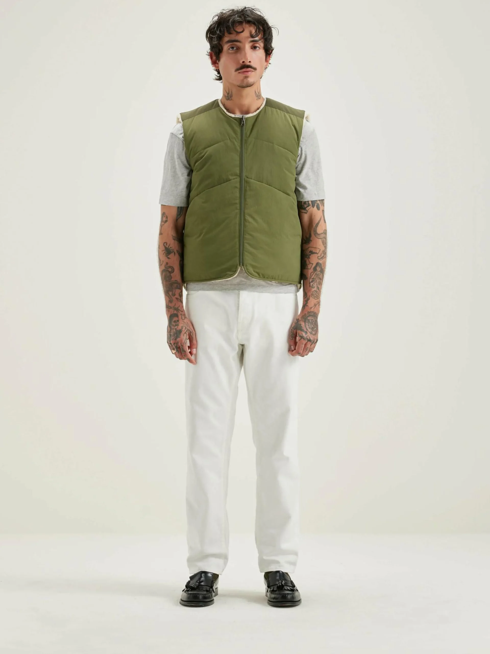 Bodywarmer zippé réversible en polyester couleur vert militaire et doublé en teddy écru.