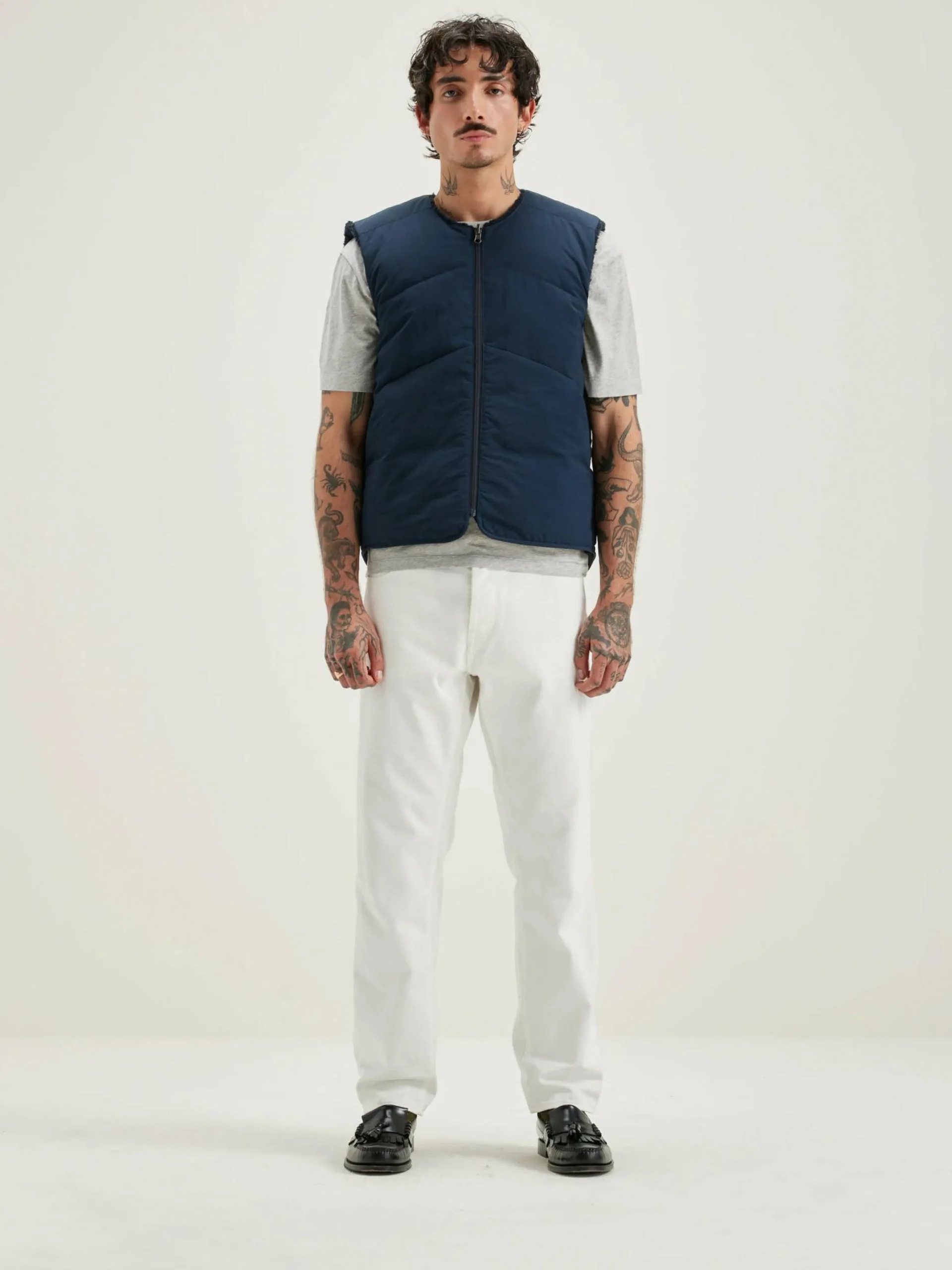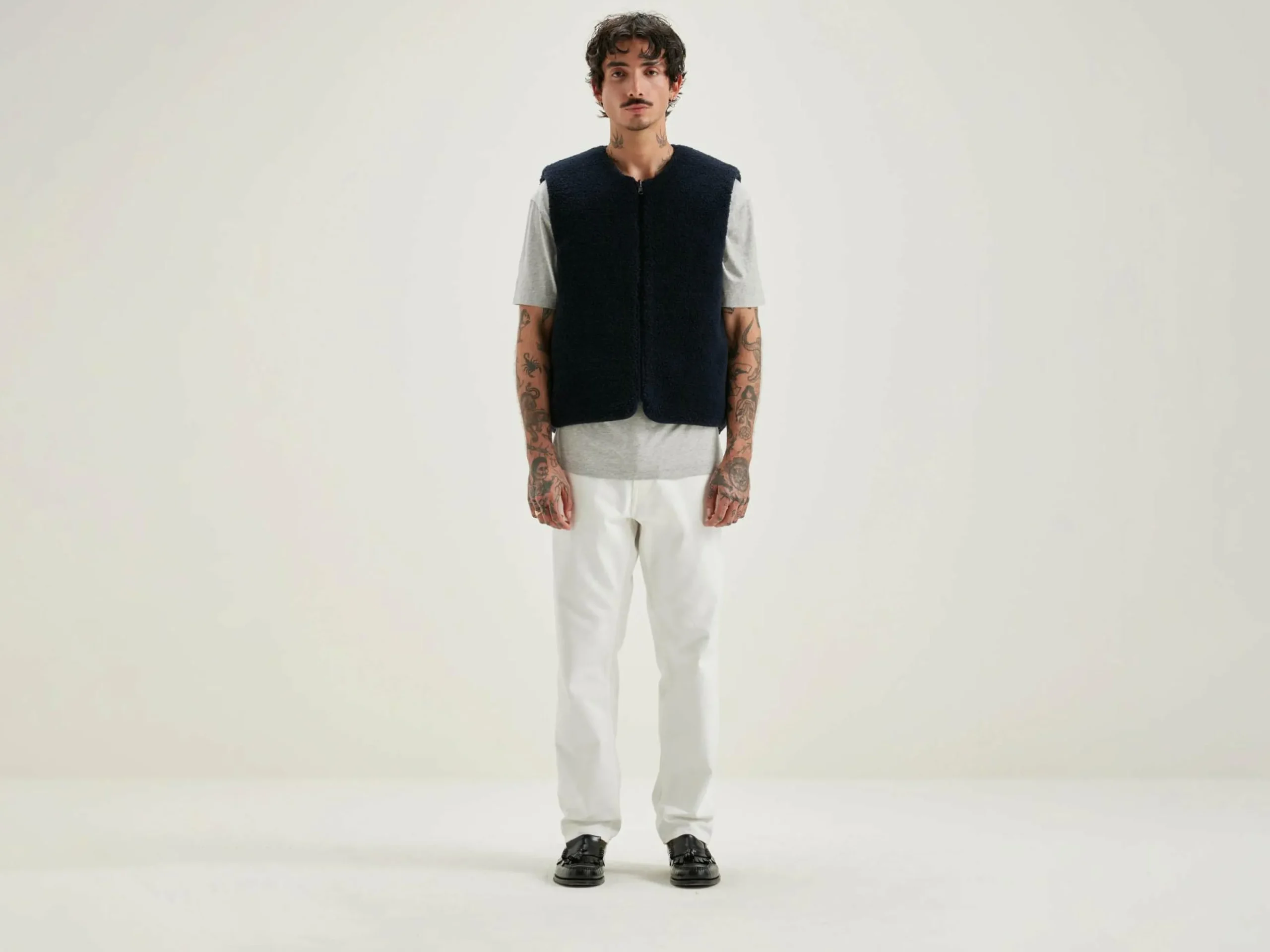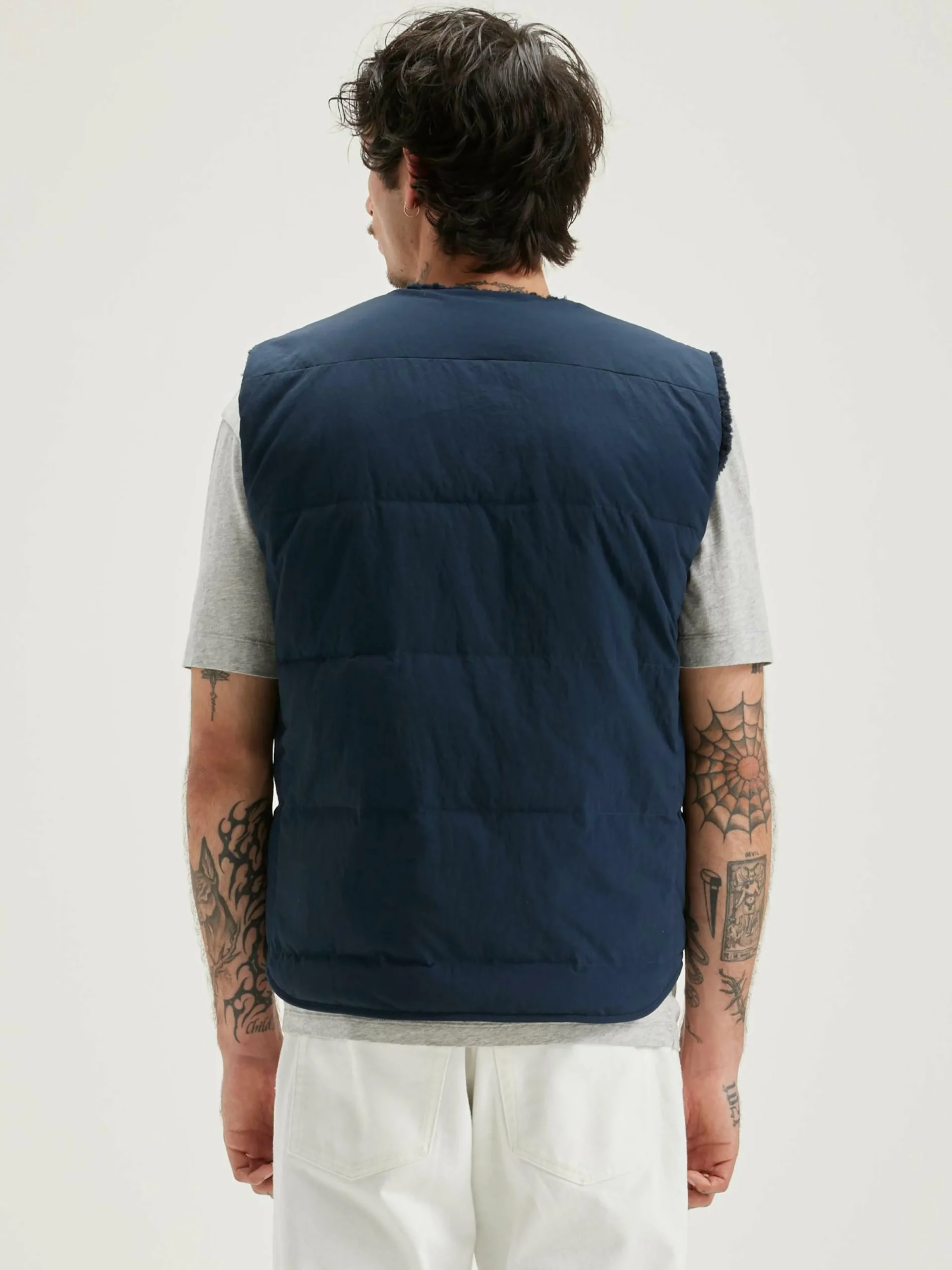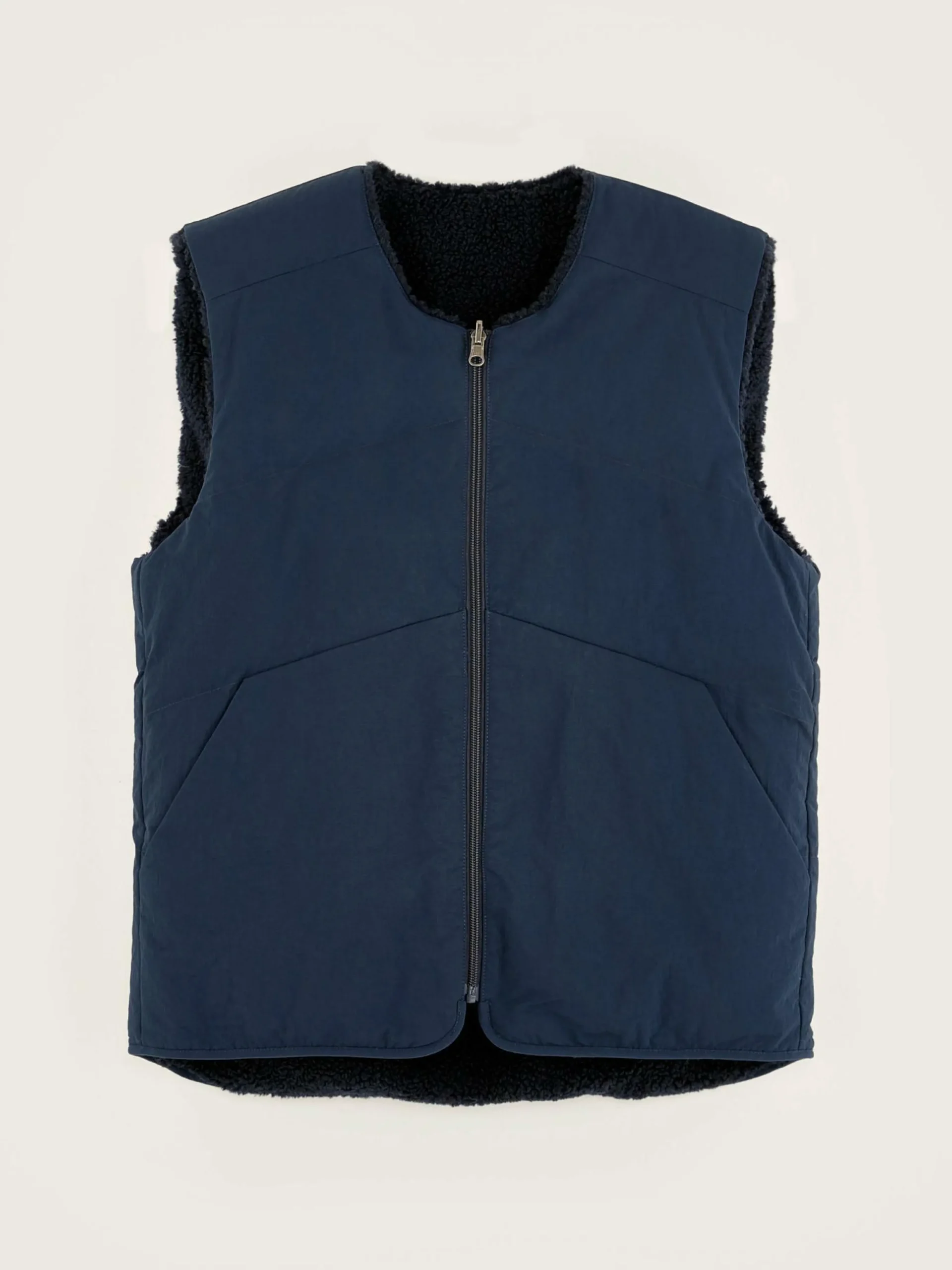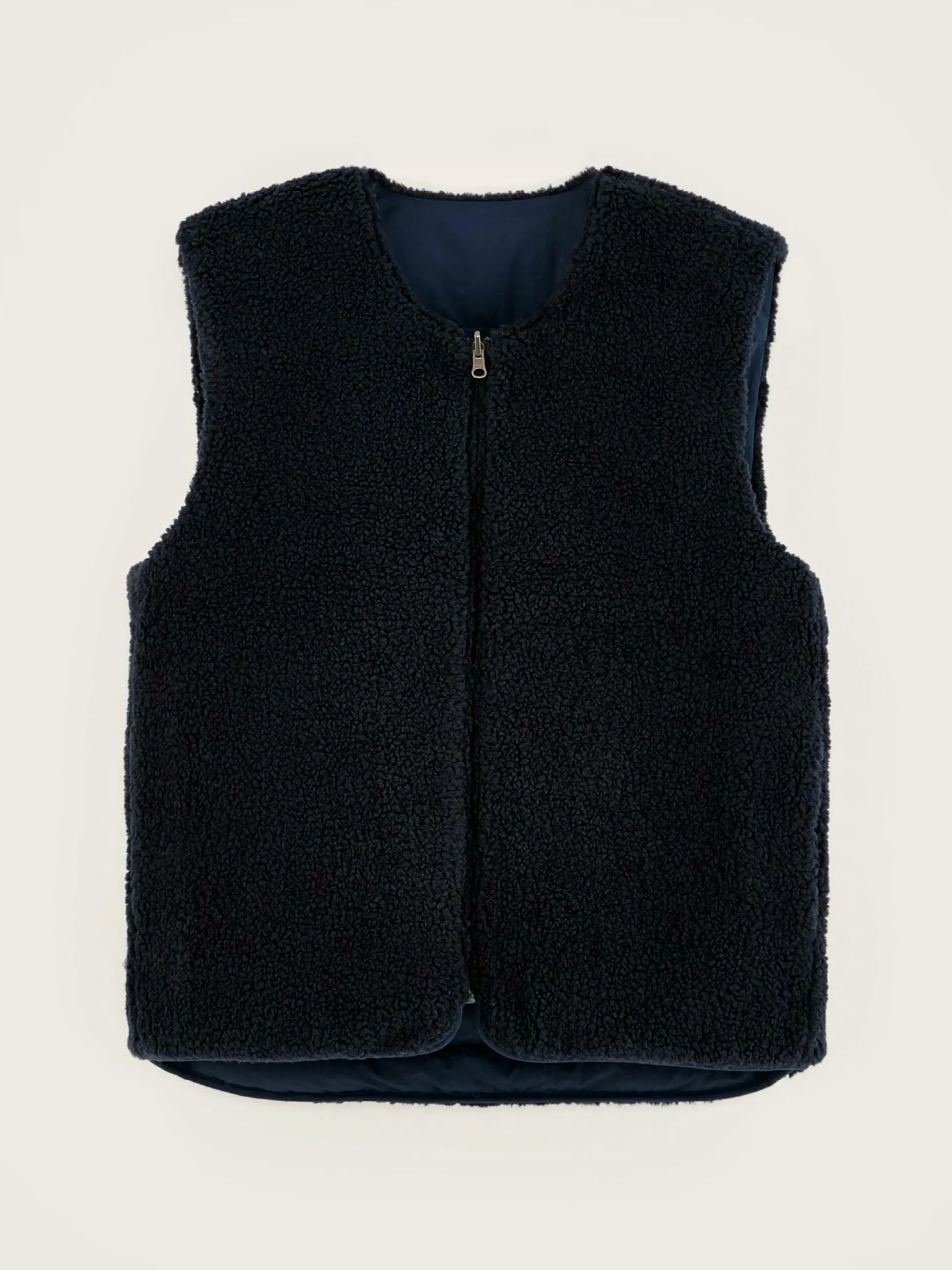 Bodywarmer zippé réversible en polyester bleu foncé et doublée de teddy ton sur ton.