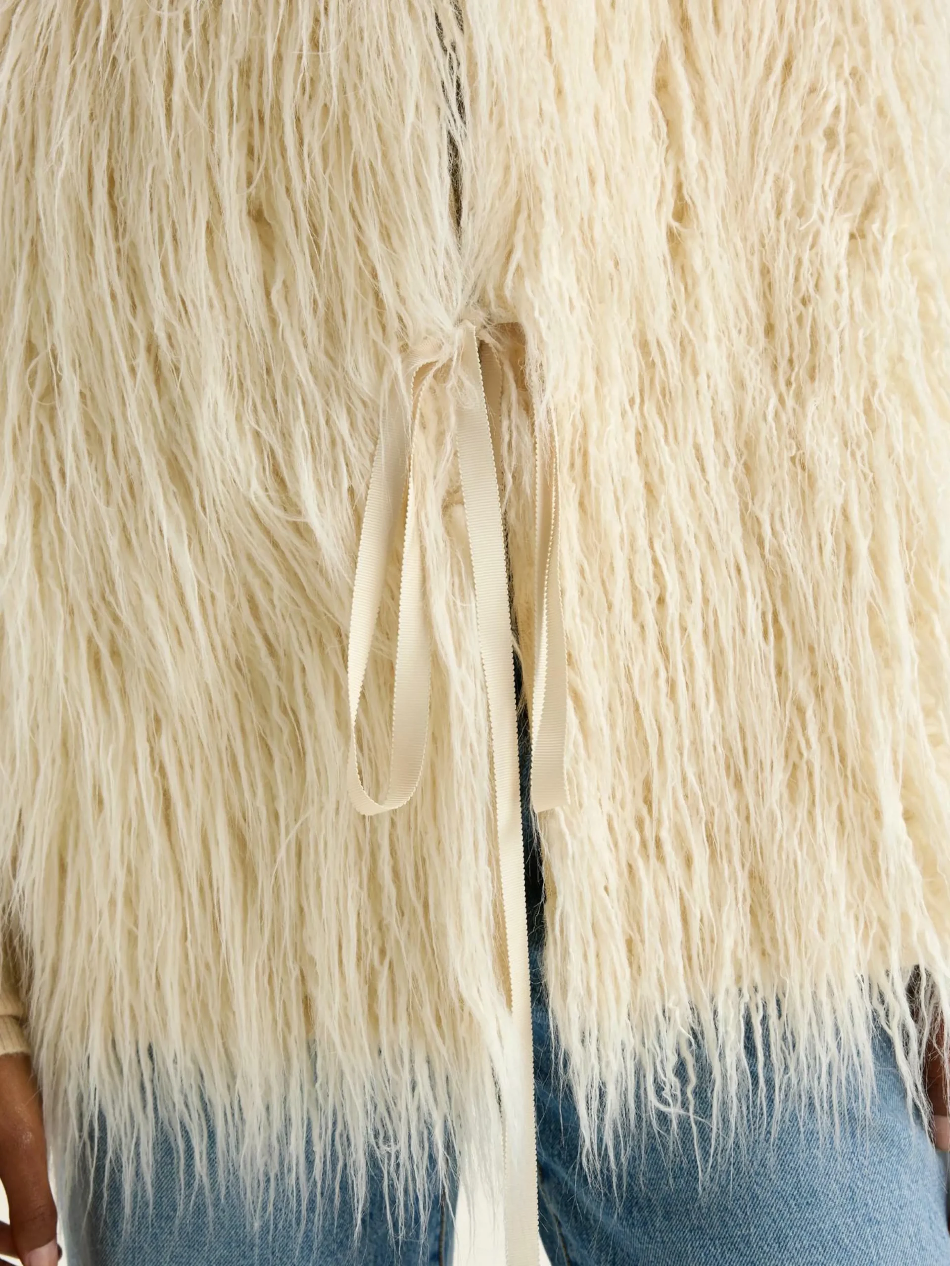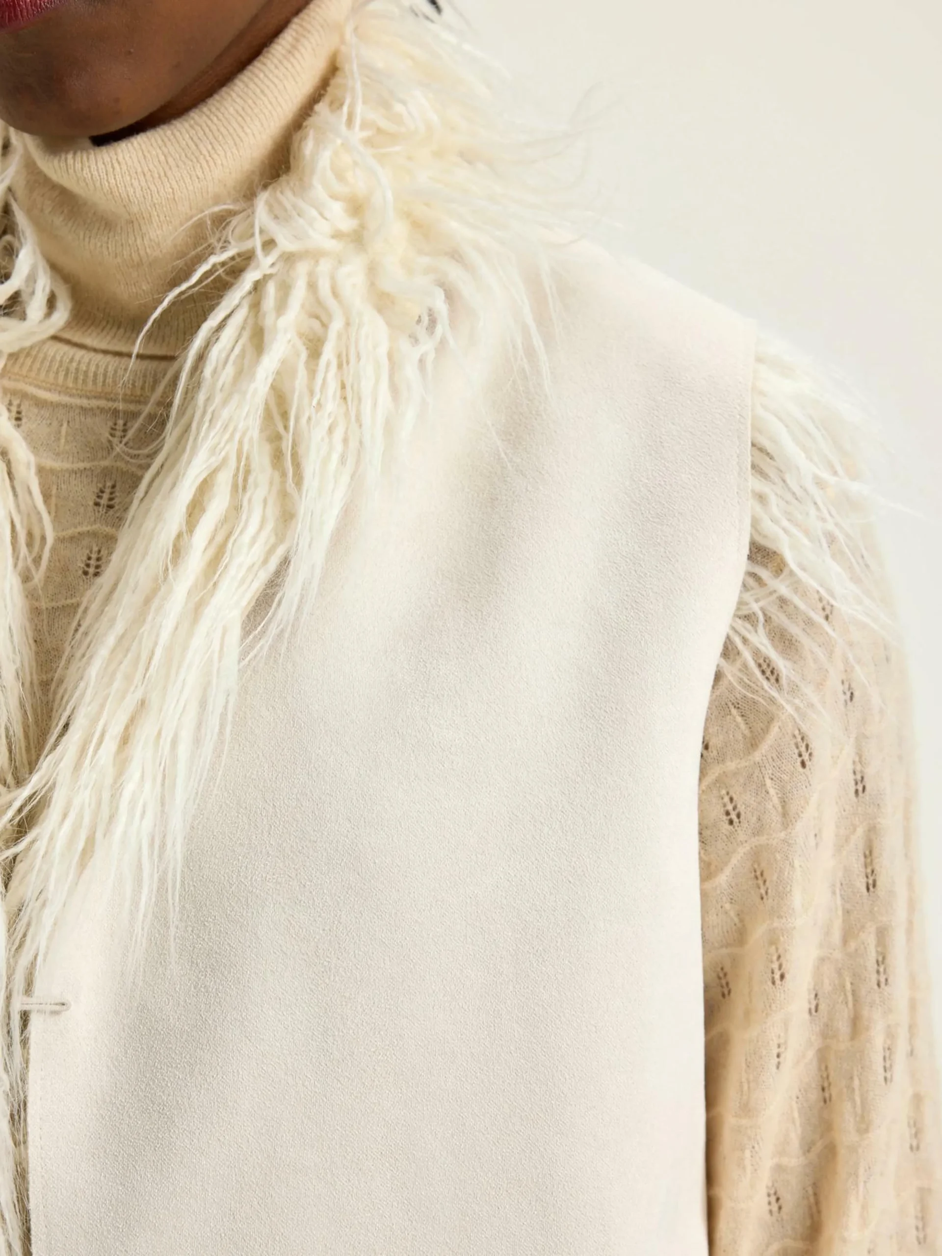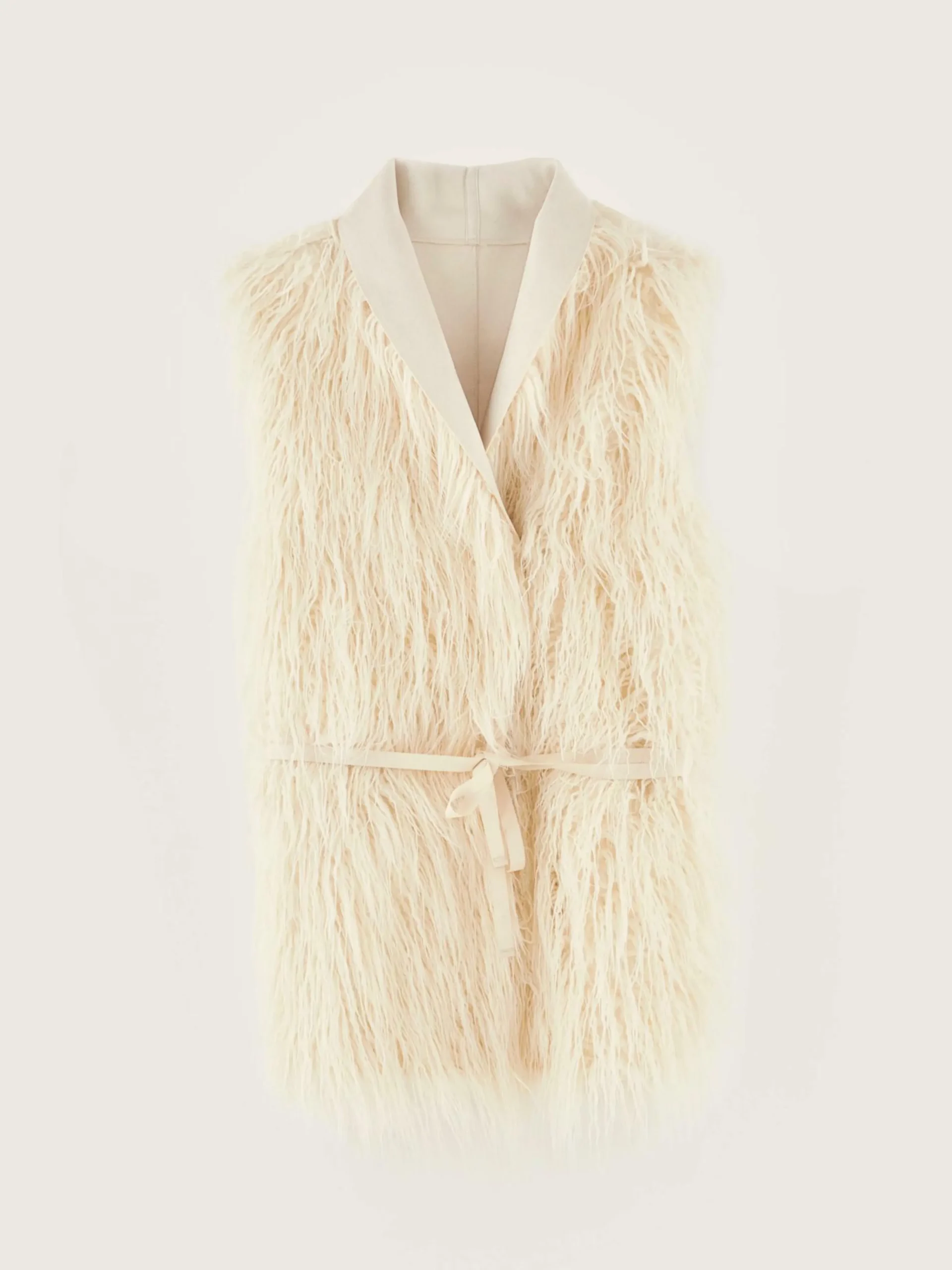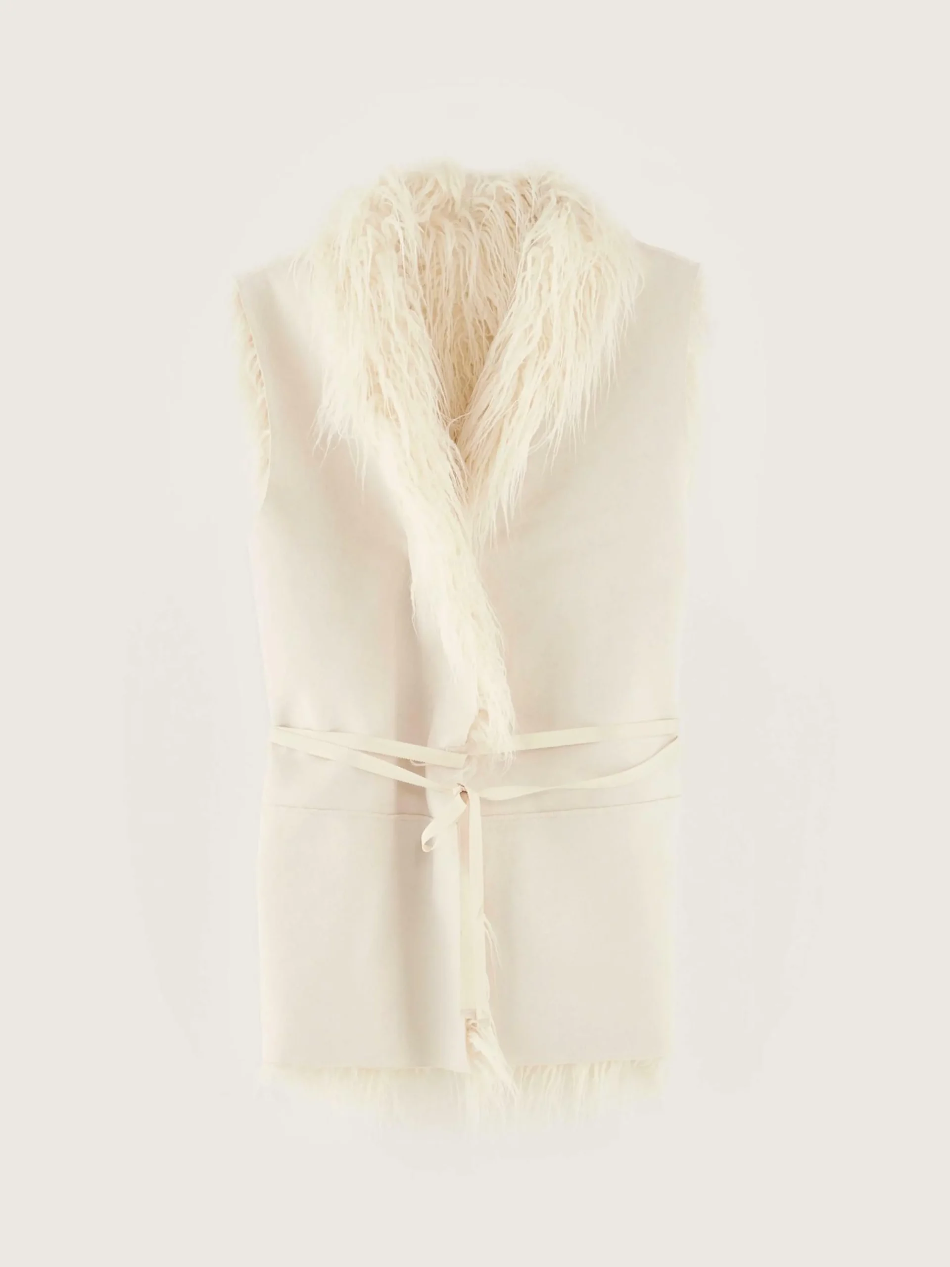 Veste sans manches réversible, devant croisé et ceinture à nouer. Fabriquée en fausse fourrure écrue avec intérieur effet daim.