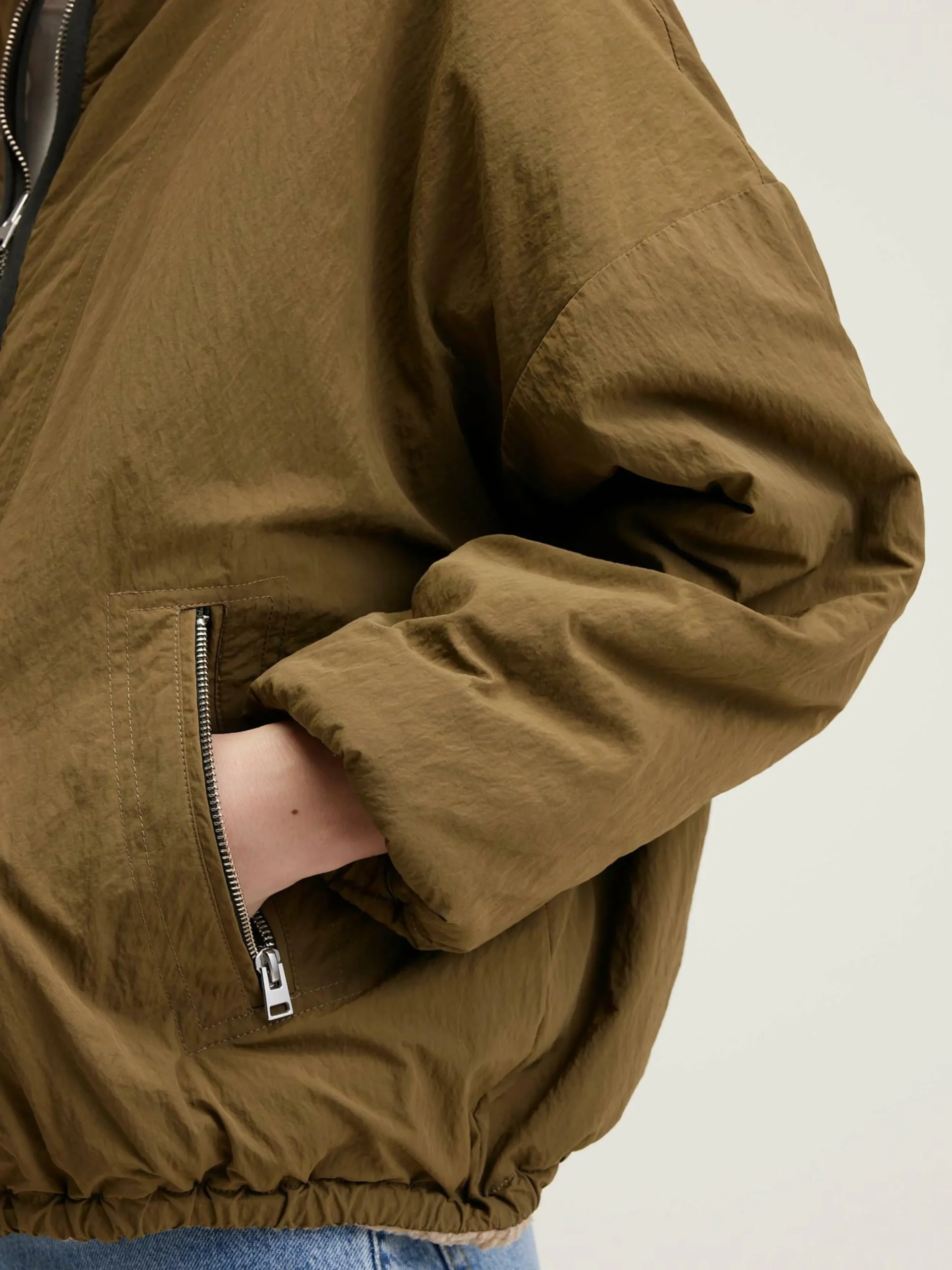 Veste oversize réversible avec un côté en teddy relevé d’une fleur géante en jacquard et l’autre en nylon kaki.