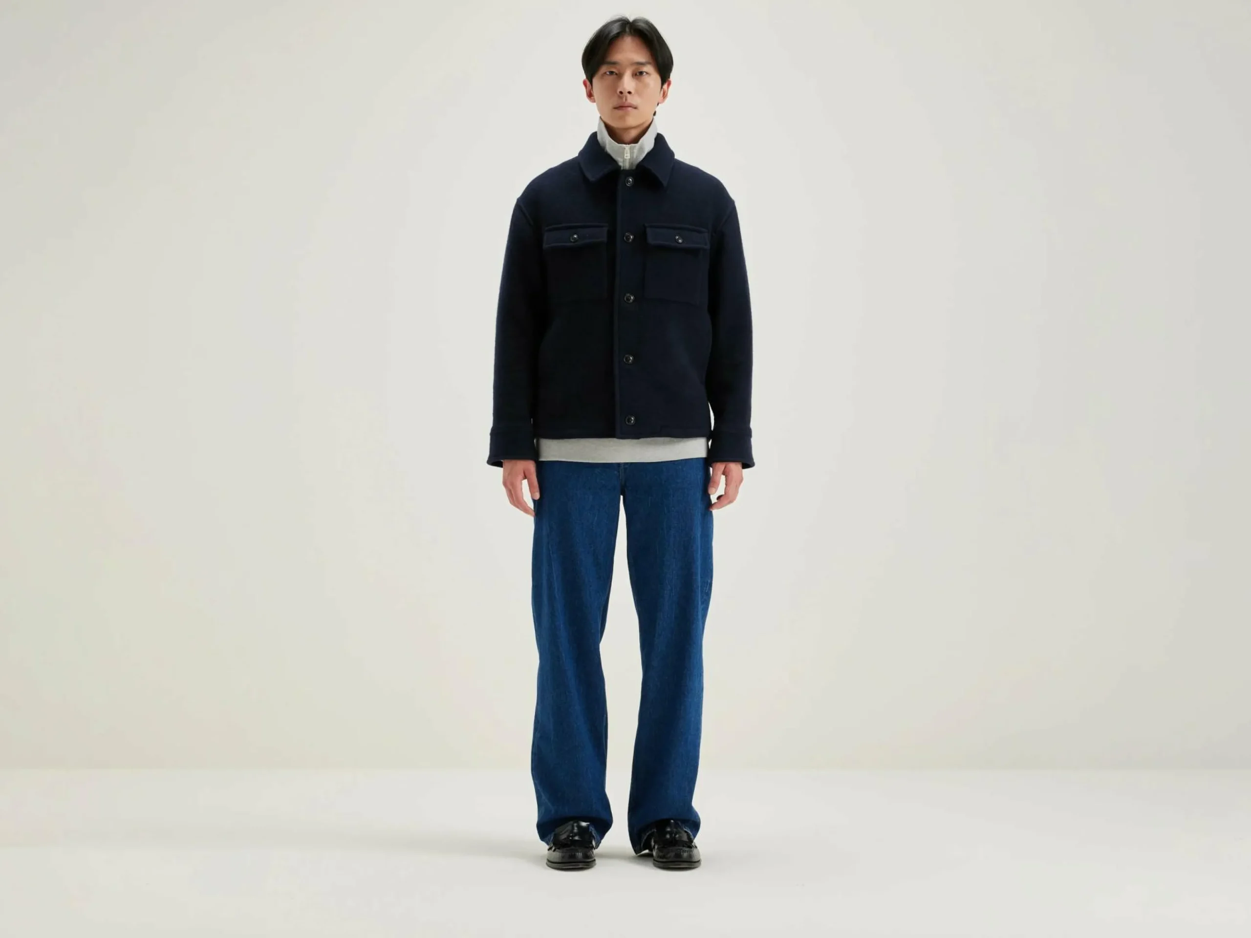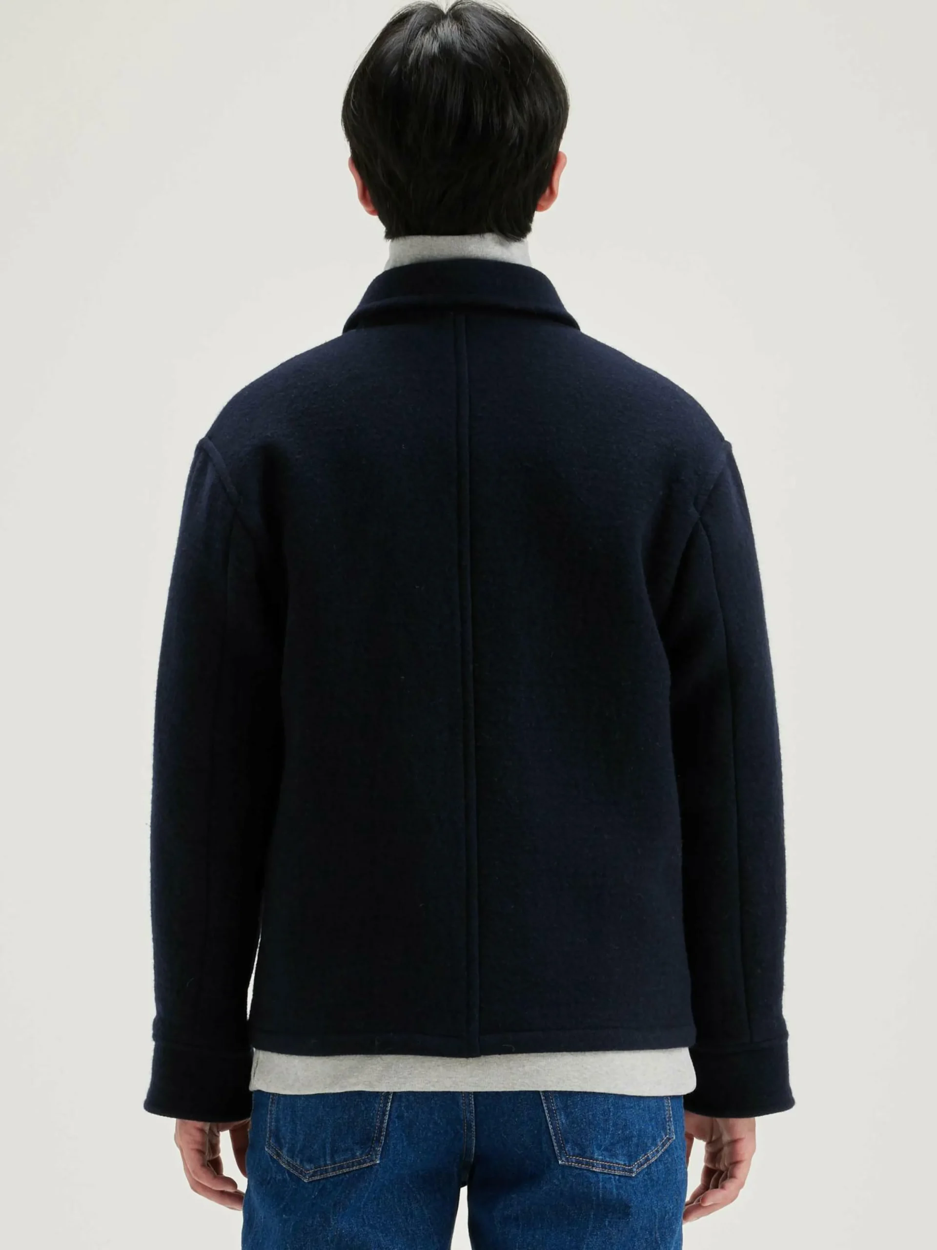 Veste droite décontractée en drap de laine double-face. Face externe en bleu marine et intérieur vert bouteille.