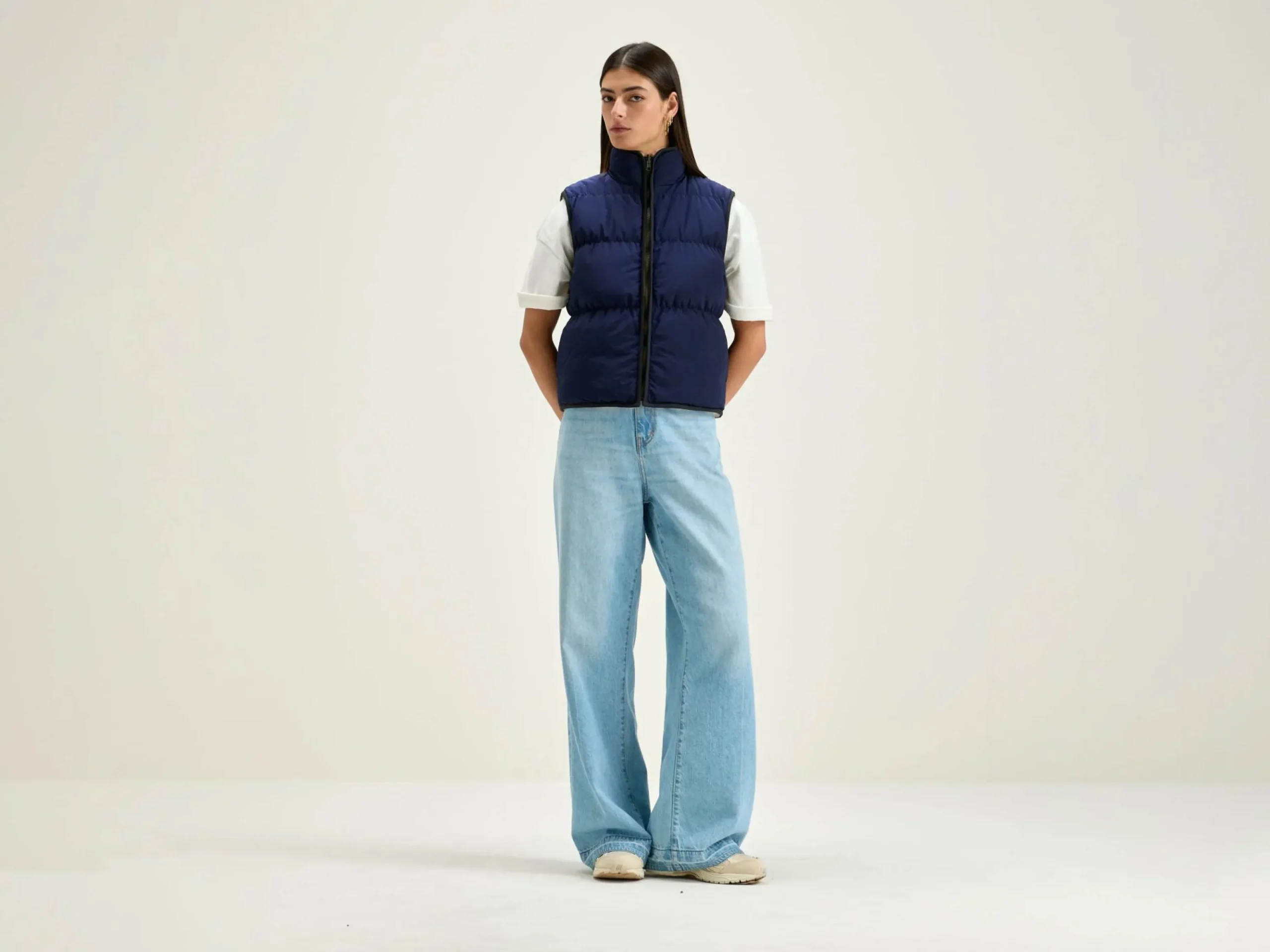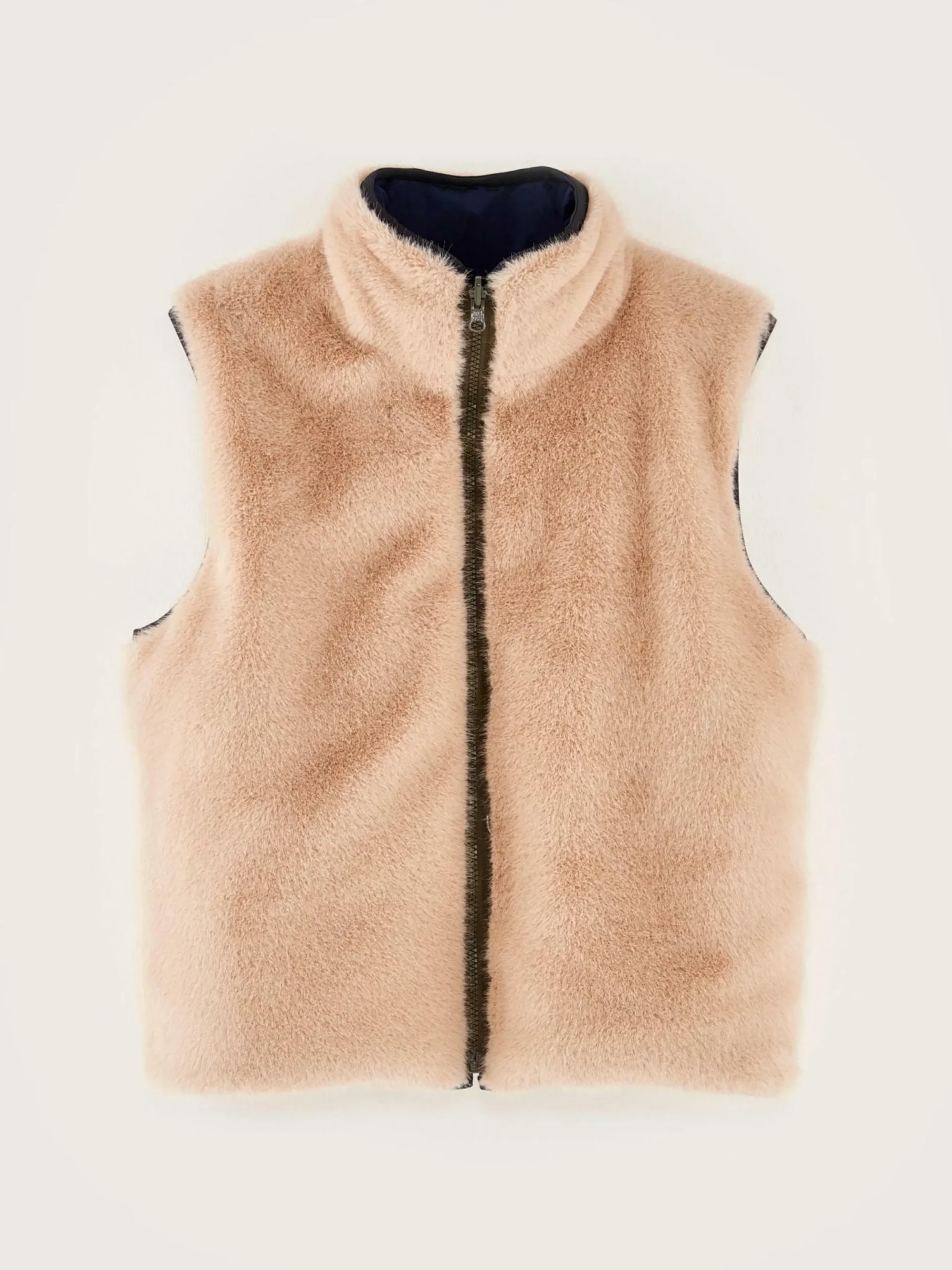 Veste sans manches zippé réversible couleur bleu marine et doublé de fausse fourrure.